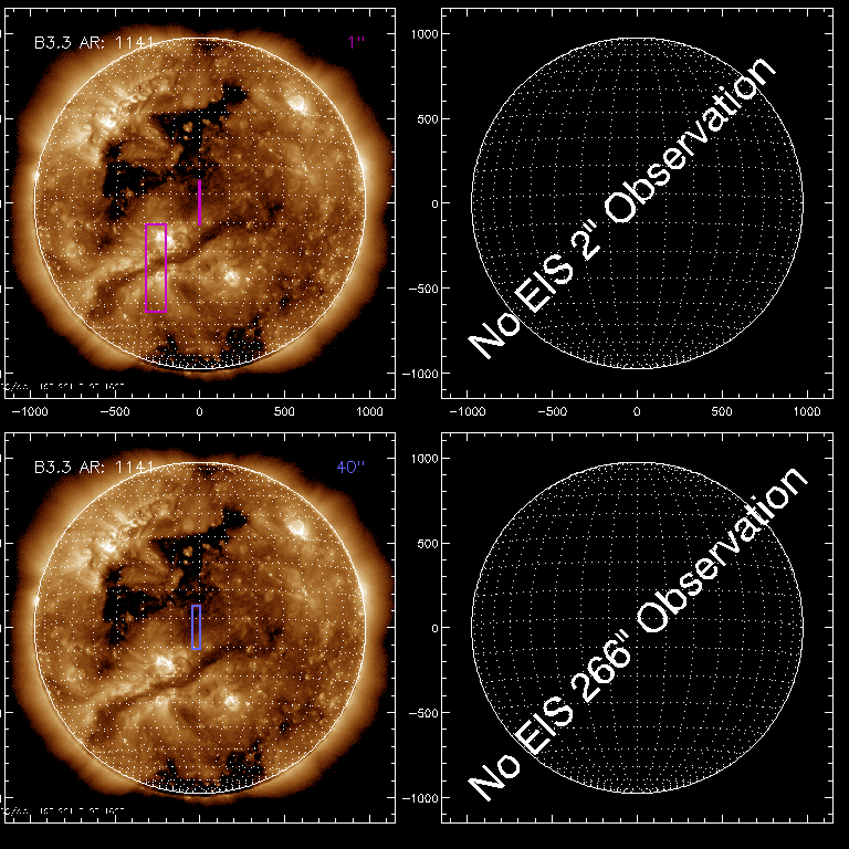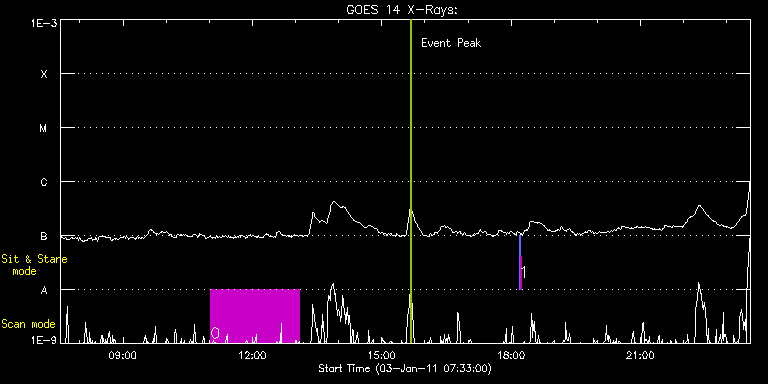 EIS Observation timeline overlay to GOES-Xray curve Code 1" 2" 40" 266" EIS Observations list for this event: STUDY ACRONYM ID DATE OBSERVED DESCRIPTION NOAA# TARGET 0 HPW021_VEL_240x512v1 | 20518 | 2011/01/03 11:01:56 | AR obs. | 1142 | Active Region TIMELINE ID DATE OBSERVED FITS FILE XCEN (+W/-E) YCEN (+N/-S) DUR ----------------------------------------------------------------------------------------------------------------- 20518 | 2011/01/03 11:01:56.000 | eis_l0_20110103_110156.fits.gz | -258.66 | -384.73 | 2h3m48s 1 SYNOP005_A | 20504 | 2011/01/03 18:11:32 | | | Quiet Sun TIMELINE ID DATE OBSERVED FITS FILE XCEN (+W/-E) YCEN (+N/-S) DUR ----------------------------------------------------------------------------------------------------------------- 20504 | 2011/01/03 18:11:32.000 | eis_l0_20110103_181132.fits.gz | -19.44 | -0.50 | 1m30s 20504 | 2011/01/03 18:13:13.000 | eis_l0_20110103_181313.fits.gz | -0.02 | -0.35 | 1m30s : Check study information : Download file : View thumbnails For this event, also check for: