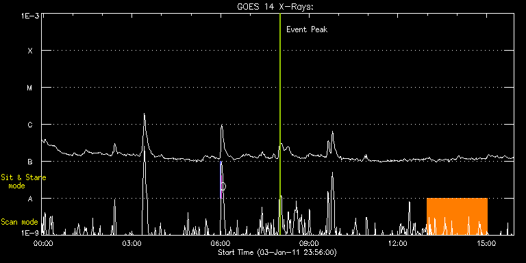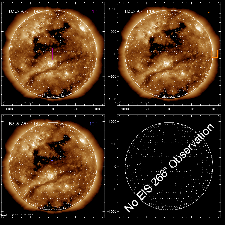 EIS Observation timeline overlay to GOES-Xray curve Code 1" 2" 40" 266" EIS Observations list for this event: STUDY ACRONYM ID DATE OBSERVED DESCRIPTION NOAA# TARGET 0 SYNOP005_A | 20505 | 2011/01/04 05:58:31 | | | Quiet Sun TIMELINE ID DATE OBSERVED FITS FILE XCEN (+W/-E) YCEN (+N/-S) DUR ----------------------------------------------------------------------------------------------------------------- 20505 | 2011/01/04 05:58:31.000 | eis_l0_20110104_055831.fits.gz | -19.52 | -0.58 | 1m30s 20505 | 2011/01/04 06:00:12.000 | eis_l0_20110104_060012.fits.gz | -0.10 | -0.58 | 1m30s 1 Atlas_120 | 20546 | 2011/01/04 12:59:27 | West limb spectral atlas | | Quiet Sun TIMELINE ID DATE OBSERVED FITS FILE XCEN (+W/-E) YCEN (+N/-S) DUR ----------------------------------------------------------------------------------------------------------------- 20546 | 2011/01/04 12:59:27.000 | eis_l0_20110104_125927.fits.gz | 1019.75 | -0.50 | 2h1m39s : Check study information : Download file : View thumbnails For this event, also check for: