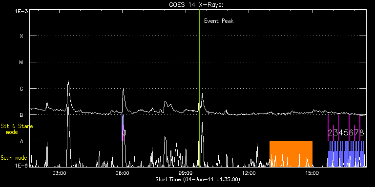 EIS Observation timeline overlay to GOES-Xray curve Code 1" 2" 40" 266" EIS Observations list for this event: STUDY ACRONYM ID DATE OBSERVED DESCRIPTION NOAA# TARGET 0 SYNOP005_A | 20505 | 2011/01/04 05:58:31 | | | Quiet Sun TIMELINE ID DATE OBSERVED FITS FILE XCEN (+W/-E) YCEN (+N/-S) DUR ----------------------------------------------------------------------------------------------------------------- 20505 | 2011/01/04 05:58:31.000 | eis_l0_20110104_055831.fits.gz | -19.52 | -0.58 | 1m30s 20505 | 2011/01/04 06:00:12.000 | eis_l0_20110104_060012.fits.gz | -0.10 | -0.58 | 1m30s 1 Atlas_120 | 20546 | 2011/01/04 12:59:27 | West limb spectral atlas | | Quiet Sun TIMELINE ID DATE OBSERVED FITS FILE XCEN (+W/-E) YCEN (+N/-S) DUR ----------------------------------------------------------------------------------------------------------------- 20546 | 2011/01/04 12:59:27.000 | eis_l0_20110104_125927.fits.gz | 1019.75 | -0.50 | 2h1m39s 2 Alignment_modify_v2 | 20553 | 2011/01/04 15:45:28 | Hinode instrument coalignment program | | Quiet Sun TIMELINE ID DATE OBSERVED FITS FILE XCEN (+W/-E) YCEN (+N/-S) DUR ----------------------------------------------------------------------------------------------------------------- 20553 | 2011/01/04 15:45:28.000 | eis_l0_20110104_154528.fits.gz | -0.02 | 944.55 | 1m 20553 | 2011/01/04 15:46:53.000 | eis_l0_20110104_154653.fits.gz | -9.58 | 944.62 | 2m34s 20553 | 2011/01/04 15:50:01.000 | eis_l0_20110104_155001.fits.gz | -9.58 | 944.55 | 2m34s 20553 | 2011/01/04 15:53:08.000 | eis_l0_20110104_155308.fits.gz | -9.50 | 944.55 | 2m34s 20553 | 2011/01/04 15:56:16.000 | eis_l0_20110104_155616.fits.gz | -9.50 | 944.55 | 2m34s 3 Alignment_modify_v2 | 20554 | 2011/01/04 16:00:20 | Hinode instrument coalignment program | | Quiet Sun TIMELINE ID DATE OBSERVED FITS FILE XCEN (+W/-E) YCEN (+N/-S) DUR ----------------------------------------------------------------------------------------------------------------- 20554 | 2011/01/04 16:00:20.000 | eis_l0_20110104_160020.fits.gz | -0.10 | 944.62 | 1m 20554 | 2011/01/04 16:01:45.000 | eis_l0_20110104_160145.fits.gz | -9.58 | 944.62 | 2m34s 20554 | 2011/01/04 16:04:53.000 | eis_l0_20110104_160453.fits.gz | -9.58 | 944.55 | 2m33s 20554 | 2011/01/04 16:08:00.000 | eis_l0_20110104_160800.fits.gz | -9.58 | 944.39 | 2m34s 20554 | 2011/01/04 16:11:08.000 | eis_l0_20110104_161108.fits.gz | -9.58 | 944.55 | 2m34s 4 Alignment_modify_v2 | 20555 | 2011/01/04 16:15:20 | Hinode instrument coalignment program | | Quiet Sun TIMELINE ID DATE OBSERVED FITS FILE XCEN (+W/-E) YCEN (+N/-S) DUR ----------------------------------------------------------------------------------------------------------------- 20555 | 2011/01/04 16:15:20.000 | eis_l0_20110104_161520.fits.gz | -0.02 | 944.47 | 1m 20555 | 2011/01/04 16:16:45.000 | eis_l0_20110104_161645.fits.gz | -9.58 | 944.55 | 2m34s 20555 | 2011/01/04 16:19:53.000 | eis_l0_20110104_161953.fits.gz | -9.50 | 944.39 | 2m34s 20555 | 2011/01/04 16:23:01.000 | eis_l0_20110104_162301.fits.gz | -9.58 | 944.47 | 2m33s 20555 | 2011/01/04 16:26:08.000 | eis_l0_20110104_162608.fits.gz | -9.58 | 944.55 | 2m34s 5 Alignment_modify_v2 | 20556 | 2011/01/04 16:30:20 | Hinode instrument coalignment program | | Quiet Sun TIMELINE ID DATE OBSERVED FITS FILE XCEN (+W/-E) YCEN (+N/-S) DUR ----------------------------------------------------------------------------------------------------------------- 20556 | 2011/01/04 16:30:20.000 | eis_l0_20110104_163020.fits.gz | -0.02 | 944.47 | 1m 20556 | 2011/01/04 16:31:45.000 | eis_l0_20110104_163145.fits.gz | -9.58 | 944.47 | 2m34s 20556 | 2011/01/04 16:34:53.000 | eis_l0_20110104_163453.fits.gz | -9.50 | 944.47 | 2m34s 20556 | 2011/01/04 16:38:00.000 | eis_l0_20110104_163800.fits.gz | -9.58 | 944.62 | 2m34s 20556 | 2011/01/04 16:41:08.000 | eis_l0_20110104_164108.fits.gz | -9.58 | 944.55 | 2m34s 6 Alignment_modify_v2 | 20557 | 2011/01/04 16:45:20 | Hinode instrument coalignment program | | Quiet Sun TIMELINE ID DATE OBSERVED FITS FILE XCEN (+W/-E) YCEN (+N/-S) DUR ----------------------------------------------------------------------------------------------------------------- 20557 | 2011/01/04 16:45:20.000 | eis_l0_20110104_164520.fits.gz | -0.18 | 944.39 | 1m 20557 | 2011/01/04 16:46:45.000 | eis_l0_20110104_164645.fits.gz | -9.50 | 944.62 | 2m34s 20557 | 2011/01/04 16:49:53.000 | eis_l0_20110104_164953.fits.gz | -9.58 | 944.55 | 2m34s 20557 | 2011/01/04 16:53:00.000 | eis_l0_20110104_165300.fits.gz | -9.50 | 944.55 | 2m34s 20557 | 2011/01/04 16:56:08.000 | eis_l0_20110104_165608.fits.gz | -9.50 | 944.47 | 2m34s 7 Alignment_modify_v2 | 20558 | 2011/01/04 17:00:20 | Hinode instrument coalignment program | | Quiet Sun TIMELINE ID DATE OBSERVED FITS FILE XCEN (+W/-E) YCEN (+N/-S) DUR ----------------------------------------------------------------------------------------------------------------- 20558 | 2011/01/04 17:00:20.000 | eis_l0_20110104_170020.fits.gz | -0.10 | 944.62 | 1m 20558 | 2011/01/04 17:01:45.000 | eis_l0_20110104_170145.fits.gz | -9.50 | 944.47 | 2m34s 20558 | 2011/01/04 17:04:53.000 | eis_l0_20110104_170453.fits.gz | -9.66 | 944.55 | 2m33s 20558 | 2011/01/04 17:08:00.000 | eis_l0_20110104_170800.fits.gz | -9.58 | 944.62 | 2m34s 20558 | 2011/01/04 17:11:08.000 | eis_l0_20110104_171108.fits.gz | -9.43 | 944.39 | 2m33s 8 Alignment_modify_v2 | 20559 | 2011/01/04 17:15:20 | Hinode instrument coalignment program | | Quiet Sun TIMELINE ID DATE OBSERVED FITS FILE XCEN (+W/-E) YCEN (+N/-S) DUR ----------------------------------------------------------------------------------------------------------------- 20559 | 2011/01/04 17:15:20.000 | eis_l0_20110104_171520.fits.gz | -0.10 | 944.39 | 1m 20559 | 2011/01/04 17:16:45.000 | eis_l0_20110104_171645.fits.gz | -9.58 | 944.55 | 2m34s 20559 | 2011/01/04 17:19:53.000 | eis_l0_20110104_171953.fits.gz | -9.58 | 944.55 | 2m34s 20559 | 2011/01/04 17:23:01.000 | eis_l0_20110104_172301.fits.gz | -9.58 | 944.55 | 2m33s 20559 | 2011/01/04 
