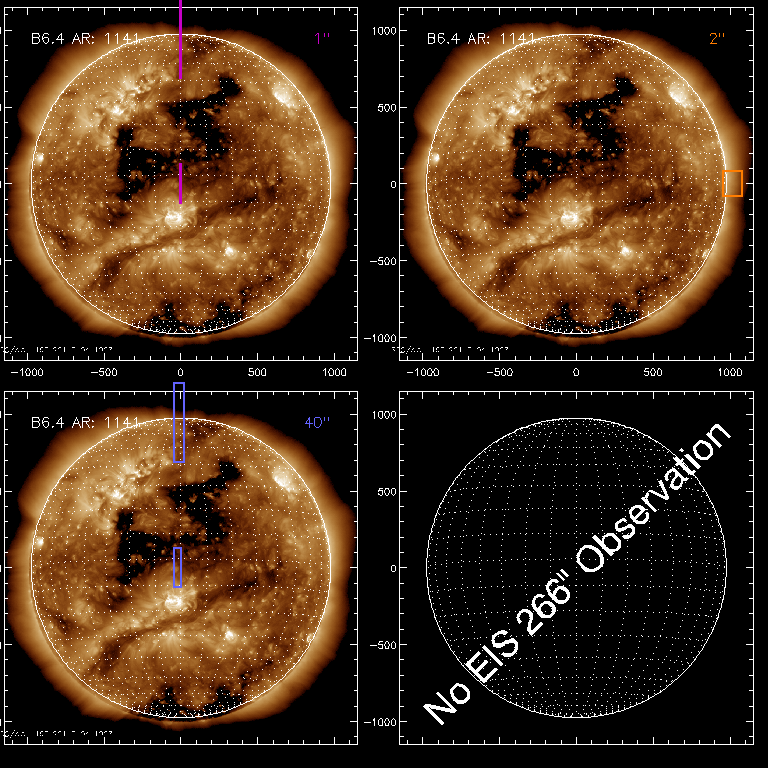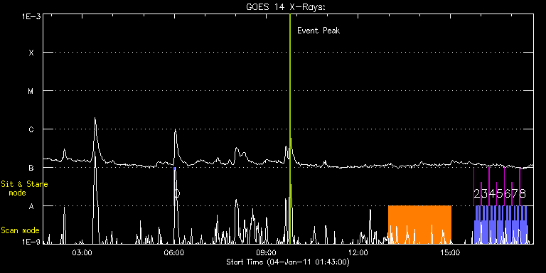 EIS Observation timeline overlay to GOES-Xray curve Code 1" 2" 40" 266" EIS Observations list for this event: STUDY ACRONYM ID DATE OBSERVED DESCRIPTION NOAA# TARGET 0 SYNOP005_A | 20505 | 2011/01/04 05:58:31 | | | Quiet Sun TIMELINE ID DATE OBSERVED FITS FILE XCEN (+W/-E) YCEN (+N/-S) DUR ----------------------------------------------------------------------------------------------------------------- 20505 | 2011/01/04 05:58:31.000 | eis_l0_20110104_055831.fits.gz | -19.52 | -0.58 | 1m30s 20505 | 2011/01/04 06:00:12.000 | eis_l0_20110104_060012.fits.gz | -0.10 | -0.58 | 1m30s 1 Atlas_120 | 20546 | 2011/01/04 12:59:27 | West limb spectral atlas | | Quiet Sun TIMELINE ID DATE OBSERVED FITS FILE XCEN (+W/-E) YCEN (+N/-S) DUR ----------------------------------------------------------------------------------------------------------------- 20546 | 2011/01/04 12:59:27.000 | eis_l0_20110104_125927.fits.gz | 1019.75 | -0.50 | 2h1m39s 2 Alignment_modify_v2 | 20553 | 2011/01/04 15:45:28 | Hinode instrument coalignment program | | Quiet Sun TIMELINE ID DATE OBSERVED FITS FILE XCEN (+W/-E) YCEN (+N/-S) DUR ----------------------------------------------------------------------------------------------------------------- 20553 | 2011/01/04 15:45:28.000 | eis_l0_20110104_154528.fits.gz | -0.02 | 944.55 | 1m 20553 | 2011/01/04 15:46:53.000 | eis_l0_20110104_154653.fits.gz | -9.58 | 944.62 | 2m34s 20553 | 2011/01/04 15:50:01.000 | eis_l0_20110104_155001.fits.gz | -9.58 | 944.55 | 2m34s 20553 | 2011/01/04 15:53:08.000 | eis_l0_20110104_155308.fits.gz | -9.50 | 944.55 | 2m34s 20553 | 2011/01/04 15:56:16.000 | eis_l0_20110104_155616.fits.gz | -9.50 | 944.55 | 2m34s 3 Alignment_modify_v2 | 20554 | 2011/01/04 16:00:20 | Hinode instrument coalignment program | | Quiet Sun TIMELINE ID DATE OBSERVED FITS FILE XCEN (+W/-E) YCEN (+N/-S) DUR ----------------------------------------------------------------------------------------------------------------- 20554 | 2011/01/04 16:00:20.000 | eis_l0_20110104_160020.fits.gz | -0.10 | 944.62 | 1m 20554 | 2011/01/04 16:01:45.000 | eis_l0_20110104_160145.fits.gz | -9.58 | 944.62 | 2m34s 20554 | 2011/01/04 16:04:53.000 | eis_l0_20110104_160453.fits.gz | -9.58 | 944.55 | 2m33s 20554 | 2011/01/04 16:08:00.000 | eis_l0_20110104_160800.fits.gz | -9.58 | 944.39 | 2m34s 20554 | 2011/01/04 16:11:08.000 | eis_l0_20110104_161108.fits.gz | -9.58 | 944.55 | 2m34s 4 Alignment_modify_v2 | 20555 | 2011/01/04 16:15:20 | Hinode instrument coalignment program | | Quiet Sun TIMELINE ID DATE OBSERVED FITS FILE XCEN (+W/-E) YCEN (+N/-S) DUR ----------------------------------------------------------------------------------------------------------------- 20555 | 2011/01/04 16:15:20.000 | eis_l0_20110104_161520.fits.gz | -0.02 | 944.47 | 1m 20555 | 2011/01/04 16:16:45.000 | eis_l0_20110104_161645.fits.gz | -9.58 | 944.55 | 2m34s 20555 | 2011/01/04 16:19:53.000 | eis_l0_20110104_161953.fits.gz | -9.50 | 944.39 | 2m34s 20555 | 2011/01/04 16:23:01.000 | eis_l0_20110104_162301.fits.gz | -9.58 | 944.47 | 2m33s 20555 | 2011/01/04 16:26:08.000 | eis_l0_20110104_162608.fits.gz | -9.58 | 944.55 | 2m34s 5 Alignment_modify_v2 | 20556 | 2011/01/04 16:30:20 | Hinode instrument coalignment program | | Quiet Sun TIMELINE ID DATE OBSERVED FITS FILE XCEN (+W/-E) YCEN (+N/-S) DUR ----------------------------------------------------------------------------------------------------------------- 20556 | 2011/01/04 16:30:20.000 | eis_l0_20110104_163020.fits.gz | -0.02 | 944.47 | 1m 20556 | 2011/01/04 16:31:45.000 | eis_l0_20110104_163145.fits.gz | -9.58 | 944.47 | 2m34s 20556 | 2011/01/04 16:34:53.000 | eis_l0_20110104_163453.fits.gz | -9.50 | 944.47 | 2m34s 20556 | 2011/01/04 16:38:00.000 | eis_l0_20110104_163800.fits.gz | -9.58 | 944.62 | 2m34s 20556 | 2011/01/04 16:41:08.000 | eis_l0_20110104_164108.fits.gz | -9.58 | 944.55 | 2m34s 6 Alignment_modify_v2 | 20557 | 2011/01/04 16:45:20 | Hinode instrument coalignment program | | Quiet Sun TIMELINE ID DATE OBSERVED FITS FILE XCEN (+W/-E) YCEN (+N/-S) DUR ----------------------------------------------------------------------------------------------------------------- 20557 | 2011/01/04 16:45:20.000 | eis_l0_20110104_164520.fits.gz | -0.18 | 944.39 | 1m 20557 | 2011/01/04 16:46:45.000 | eis_l0_20110104_164645.fits.gz | -9.50 | 944.62 | 2m34s 20557 | 2011/01/04 16:49:53.000 | eis_l0_20110104_164953.fits.gz | -9.58 | 944.55 | 2m34s 20557 | 2011/01/04 16:53:00.000 | eis_l0_20110104_165300.fits.gz | -9.50 | 944.55 | 2m34s 20557 | 2011/01/04 16:56:08.000 | eis_l0_20110104_165608.fits.gz | -9.50 | 944.47 | 2m34s 7 Alignment_modify_v2 | 20558 | 2011/01/04 17:00:20 | Hinode instrument coalignment program | | Quiet Sun TIMELINE ID DATE OBSERVED FITS FILE XCEN (+W/-E) YCEN (+N/-S) DUR ----------------------------------------------------------------------------------------------------------------- 20558 | 2011/01/04 17:00:20.000 | eis_l0_20110104_170020.fits.gz | -0.10 | 944.62 | 1m 20558 | 2011/01/04 17:01:45.000 | eis_l0_20110104_170145.fits.gz | -9.50 | 944.47 | 2m34s 20558 | 2011/01/04 17:04:53.000 | eis_l0_20110104_170453.fits.gz | -9.66 | 944.55 | 2m33s 20558 | 2011/01/04 17:08:00.000 | eis_l0_20110104_170800.fits.gz | -9.58 | 944.62 | 2m34s 20558 | 2011/01/04 17:11:08.000 | eis_l0_20110104_171108.fits.gz | -9.43 | 944.39 | 2m33s 8 Alignment_modify_v2 | 20559 | 2011/01/04 17:15:20 | Hinode instrument coalignment program | | Quiet Sun TIMELINE ID DATE OBSERVED FITS FILE XCEN (+W/-E) YCEN (+N/-S) DUR ----------------------------------------------------------------------------------------------------------------- 20559 | 2011/01/04 17:15:20.000 | eis_l0_20110104_171520.fits.gz | -0.10 | 944.39 | 1m 20559 | 2011/01/04 17:16:45.000 | eis_l0_20110104_171645.fits.gz | -9.58 | 944.55 | 2m34s 20559 | 2011/01/04 17:19:53.000 | eis_l0_20110104_171953.fits.gz | -9.58 | 944.55 | 2m34s 20559 | 2011/01/04 17:23:01.000 | eis_l0_20110104_172301.fits.gz | -9.58 | 944.55 | 2m33s 20559 | 2011/01/04 