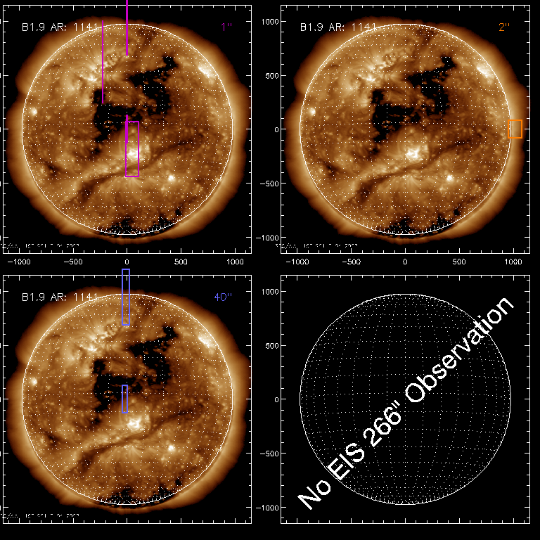 EIS Observation timeline overlay to GOES-Xray curve Code 1" 2" 40" 266" EIS Observations list for this event: STUDY ACRONYM ID DATE OBSERVED DESCRIPTION NOAA# TARGET 0 Atlas_120 | 20546 | 2011/01/04 12:59:27 | West limb spectral atlas | | Quiet Sun TIMELINE ID DATE OBSERVED FITS FILE XCEN (+W/-E) YCEN (+N/-S) DUR ----------------------------------------------------------------------------------------------------------------- 20546 | 2011/01/04 12:59:27.000 | eis_l0_20110104_125927.fits.gz | 1019.75 | -0.50 | 2h1m39s 1 Alignment_modify_v2 | 20553 | 2011/01/04 15:45:28 | Hinode instrument coalignment program | | Quiet Sun TIMELINE ID DATE OBSERVED FITS FILE XCEN (+W/-E) YCEN (+N/-S) DUR ----------------------------------------------------------------------------------------------------------------- 20553 | 2011/01/04 15:45:28.000 | eis_l0_20110104_154528.fits.gz | -0.02 | 944.55 | 1m 20553 | 2011/01/04 15:46:53.000 | eis_l0_20110104_154653.fits.gz | -9.58 | 944.62 | 2m34s 20553 | 2011/01/04 15:50:01.000 | eis_l0_20110104_155001.fits.gz | -9.58 | 944.55 | 2m34s 20553 | 2011/01/04 15:53:08.000 | eis_l0_20110104_155308.fits.gz | -9.50 | 944.55 | 2m34s 20553 | 2011/01/04 15:56:16.000 | eis_l0_20110104_155616.fits.gz | -9.50 | 944.55 | 2m34s 2 Alignment_modify_v2 | 20554 | 2011/01/04 16:00:20 | Hinode instrument coalignment program | | Quiet Sun TIMELINE ID DATE OBSERVED FITS FILE XCEN (+W/-E) YCEN (+N/-S) DUR ----------------------------------------------------------------------------------------------------------------- 20554 | 2011/01/04 16:00:20.000 | eis_l0_20110104_160020.fits.gz | -0.10 | 944.62 | 1m 20554 | 2011/01/04 16:01:45.000 | eis_l0_20110104_160145.fits.gz | -9.58 | 944.62 | 2m34s 20554 | 2011/01/04 16:04:53.000 | eis_l0_20110104_160453.fits.gz | -9.58 | 944.55 | 2m33s 20554 | 2011/01/04 16:08:00.000 | eis_l0_20110104_160800.fits.gz | -9.58 | 944.39 | 2m34s 20554 | 2011/01/04 16:11:08.000 | eis_l0_20110104_161108.fits.gz | -9.58 | 944.55 | 2m34s 3 Alignment_modify_v2 | 20555 | 2011/01/04 16:15:20 | Hinode instrument coalignment program | | Quiet Sun TIMELINE ID DATE OBSERVED FITS FILE XCEN (+W/-E) YCEN (+N/-S) DUR ----------------------------------------------------------------------------------------------------------------- 20555 | 2011/01/04 16:15:20.000 | eis_l0_20110104_161520.fits.gz | -0.02 | 944.47 | 1m 20555 | 2011/01/04 16:16:45.000 | eis_l0_20110104_161645.fits.gz | -9.58 | 944.55 | 2m34s 20555 | 2011/01/04 16:19:53.000 | eis_l0_20110104_161953.fits.gz | -9.50 | 944.39 | 2m34s 20555 | 2011/01/04 16:23:01.000 | eis_l0_20110104_162301.fits.gz | -9.58 | 944.47 | 2m33s 20555 | 2011/01/04 16:26:08.000 | eis_l0_20110104_162608.fits.gz | -9.58 | 944.55 | 2m34s 4 Alignment_modify_v2 | 20556 | 2011/01/04 16:30:20 | Hinode instrument coalignment program | | Quiet Sun TIMELINE ID DATE OBSERVED FITS FILE XCEN (+W/-E) YCEN (+N/-S) DUR ----------------------------------------------------------------------------------------------------------------- 20556 | 2011/01/04 16:30:20.000 | eis_l0_20110104_163020.fits.gz | -0.02 | 944.47 | 1m 20556 | 2011/01/04 16:31:45.000 | eis_l0_20110104_163145.fits.gz | -9.58 | 944.47 | 2m34s 20556 | 2011/01/04 16:34:53.000 | eis_l0_20110104_163453.fits.gz | -9.50 | 944.47 | 2m34s 20556 | 2011/01/04 16:38:00.000 | eis_l0_20110104_163800.fits.gz | -9.58 | 944.62 | 2m34s 20556 | 2011/01/04 16:41:08.000 | eis_l0_20110104_164108.fits.gz | -9.58 | 944.55 | 2m34s 5 Alignment_modify_v2 | 20557 | 2011/01/04 16:45:20 | Hinode instrument coalignment program | | Quiet Sun TIMELINE ID DATE OBSERVED FITS FILE XCEN (+W/-E) YCEN (+N/-S) DUR ----------------------------------------------------------------------------------------------------------------- 20557 | 2011/01/04 16:45:20.000 | eis_l0_20110104_164520.fits.gz | -0.18 | 944.39 | 1m 20557 | 2011/01/04 16:46:45.000 | eis_l0_20110104_164645.fits.gz | -9.50 | 944.62 | 2m34s 20557 | 2011/01/04 16:49:53.000 | eis_l0_20110104_164953.fits.gz | -9.58 | 944.55 | 2m34s 20557 | 2011/01/04 16:53:00.000 | eis_l0_20110104_165300.fits.gz | -9.50 | 944.55 | 2m34s 20557 | 2011/01/04 16:56:08.000 | eis_l0_20110104_165608.fits.gz | -9.50 | 944.47 | 2m34s 6 Alignment_modify_v2 | 20558 | 2011/01/04 17:00:20 | Hinode instrument coalignment program | | Quiet Sun TIMELINE ID DATE OBSERVED FITS FILE XCEN (+W/-E) YCEN (+N/-S) DUR ----------------------------------------------------------------------------------------------------------------- 20558 | 2011/01/04 17:00:20.000 | eis_l0_20110104_170020.fits.gz | -0.10 | 944.62 | 1m 20558 | 2011/01/04 17:01:45.000 | eis_l0_20110104_170145.fits.gz | -9.50 | 944.47 | 2m34s 20558 | 2011/01/04 17:04:53.000 | eis_l0_20110104_170453.fits.gz | -9.66 | 944.55 | 2m33s 20558 | 2011/01/04 17:08:00.000 | eis_l0_20110104_170800.fits.gz | -9.58 | 944.62 | 2m34s 20558 | 2011/01/04 17:11:08.000 | eis_l0_20110104_171108.fits.gz | -9.43 | 944.39 | 2m33s 7 Alignment_modify_v2 | 20559 | 2011/01/04 17:15:20 | Hinode instrument coalignment program | | Quiet Sun TIMELINE ID DATE OBSERVED FITS FILE XCEN (+W/-E) YCEN (+N/-S) DUR ----------------------------------------------------------------------------------------------------------------- 20559 | 2011/01/04 17:15:20.000 | eis_l0_20110104_171520.fits.gz | -0.10 | 944.39 | 1m 20559 | 2011/01/04 17:16:45.000 | eis_l0_20110104_171645.fits.gz | -9.58 | 944.55 | 2m34s 20559 | 2011/01/04 17:19:53.000 | eis_l0_20110104_171953.fits.gz | -9.58 | 944.55 | 2m34s 20559 | 2011/01/04 17:23:01.000 | eis_l0_20110104_172301.fits.gz | -9.58 | 944.55 | 2m33s 20559 | 2011/01/04 17:26:08.000 | eis_l0_20110104_172608.fits.gz | -9.58 | 944.62 | 2m34s 8 SYNOP005_A | 20547 | 2011/01/04 17:59:43 | Sensitivity monitoring during XRT syno | | Quiet Sun TIMELINE ID DATE OBSERVED FITS FILE XCEN (+W/-E) YCEN (+N/-S) DUR ----------------------------------------------------------------------------------------------------------------- 20547 | 2011/01/04 17:59:43.000 | eis_l0_20110104_175943.fits.gz | -1