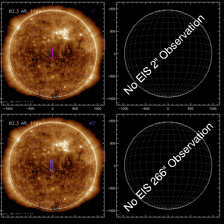 EIS Observation timeline overlay to GOES-Xray curve Code 1" 2" 40" 266" EIS Observations list for this event: STUDY ACRONYM ID DATE OBSERVED DESCRIPTION NOAA# TARGET 0 SYNOP005_A | 20813 | 2011/01/22 17:41:20 | Synoptic | | Quiet Sun TIMELINE ID DATE OBSERVED FITS FILE XCEN (+W/-E) YCEN (+N/-S) DUR ----------------------------------------------------------------------------------------------------------------- 20813 | 2011/01/22 17:41:20.000 | eis_l0_20110122_174120.fits.gz | -19.52 | -0.50 | 1m30s 20813 | 2011/01/22 17:43:01.000 | eis_l0_20110122_174301.fits.gz | -0.18 | -0.50 | 1m30s 1 SYNOP005_A | 20814 | 2011/01/23 06:01:34 | Synoptic | | Quiet Sun TIMELINE ID DATE OBSERVED FITS FILE XCEN (+W/-E) YCEN (+N/-S) DUR ----------------------------------------------------------------------------------------------------------------- 20814 | 2011/01/23 06:01:34.000 | eis_l0_20110123_060134.fits.gz | -19.52 | -0.58 | 1m30s 20814 | 2011/01/23 06:03:15.000 | eis_l0_20110123_060315.fits.gz | -0.10 | -0.42 | 1m30s : Check study information : Download file : View thumbnails For this event, also check for: