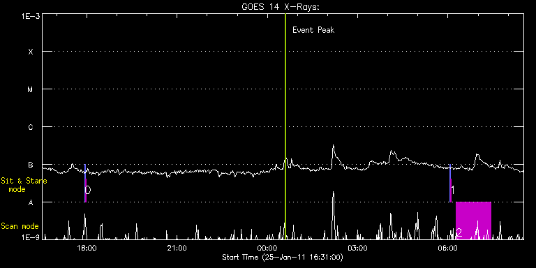 EIS Observation timeline overlay to GOES-Xray curve Code 1" 2" 40" 266" EIS Observations list for this event: STUDY ACRONYM ID DATE OBSERVED DESCRIPTION NOAA# TARGET 0 SYNOP005_A | 20830 | 2011/01/25 17:55:14 | Synoptic observations | | Quiet Sun TIMELINE ID DATE OBSERVED FITS FILE XCEN (+W/-E) YCEN (+N/-S) DUR ----------------------------------------------------------------------------------------------------------------- 20830 | 2011/01/25 17:55:14.000 | eis_l0_20110125_175514.fits.gz | -19.52 | -0.50 | 1m30s 20830 | 2011/01/25 17:56:55.000 | eis_l0_20110125_175655.fits.gz | -0.02 | -0.50 | 1m30s 1 SYNOP005_A | 20831 | 2011/01/26 06:03:34 | Synoptic observations | | Quiet Sun TIMELINE ID DATE OBSERVED FITS FILE XCEN (+W/-E) YCEN (+N/-S) DUR ----------------------------------------------------------------------------------------------------------------- 20831 | 2011/01/26 06:03:34.000 | eis_l0_20110126_060334.fits.gz | -19.52 | -0.73 | 1m30s 20831 | 2011/01/26 06:05:15.000 | eis_l0_20110126_060515.fits.gz | -0.02 | -0.50 | 1m31s 2 prom_rast_v1 | 20827 | 2011/01/26 06:15:40 | Prominence observation - Berger | | Eruptive Filame TIMELINE ID DATE OBSERVED FITS FILE XCEN (+W/-E) YCEN (+N/-S) DUR ----------------------------------------------------------------------------------------------------------------- 20827 | 2011/01/26 06:15:40.000 | eis_l0_20110126_061540.fits.gz | 698.07 | -655.25 | 1h9m45s : Check study information : Download file : View thumbnails For this event, also check for: