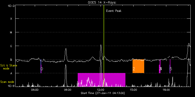 EIS Observation timeline overlay to GOES-Xray curve Code 1" 2" 40" 266" EIS Observations list for this event: STUDY ACRONYM ID DATE OBSERVED DESCRIPTION NOAA# TARGET 0 SYNOP005_A | 20833 | 2011/01/27 06:31:33 | Synoptic observations | | Quiet Sun TIMELINE ID DATE OBSERVED FITS FILE XCEN (+W/-E) YCEN (+N/-S) DUR ----------------------------------------------------------------------------------------------------------------- 20833 | 2011/01/27 06:31:33.000 | eis_l0_20110127_063133.fits.gz | -19.60 | -0.58 | 1m30s 20833 | 2011/01/27 06:33:14.000 | eis_l0_20110127_063314.fits.gz | -0.02 | -0.58 | 1m30s 1 PRY_loop_velocity | 20848 | 2011/01/27 09:55:40 | Outflows from Small Active Regions - Y | 1147 | Active Region TIMELINE ID DATE OBSERVED FITS FILE XCEN (+W/-E) YCEN (+N/-S) DUR ----------------------------------------------------------------------------------------------------------------- 20848 | 2011/01/27 09:55:40.000 | eis_l0_20110127_095540.fits.gz | 870.27 | 359.55 | 4h19m31s 2 vhh_slowar_sas_1h6m | 20855 | 2011/01/27 14:55:57 | Outflows and Oscillations at the edge | | Active Region TIMELINE ID DATE OBSERVED FITS FILE XCEN (+W/-E) YCEN (+N/-S) DUR ----------------------------------------------------------------------------------------------------------------- 20855 | 2011/01/27 14:55:57.000 | eis_l0_20110127_145557.fits.gz | 802.64 | 499.55 | 1h2m51s 3 regcal071 | 20849 | 2011/01/27 17:20:11 | Dark exposures, CCD bottom rows (100s | | Engineering TIMELINE ID DATE OBSERVED FITS FILE XCEN (+W/-E) YCEN (+N/-S) DUR ----------------------------------------------------------------------------------------------------------------- 20849 | 2011/01/27 17:20:11.000 | eis_l0_20110127_172011.fits.gz | 884.63 | 54.63 | 3m22s 4 regcal072 | 20850 | 2011/01/27 17:24:00 | Dark exposures, top CCD rows (100s exp | | Engineering TIMELINE ID DATE OBSERVED FITS FILE XCEN (+W/-E) YCEN (+N/-S) DUR ----------------------------------------------------------------------------------------------------------------- 20850 | 2011/01/27 17:24:00.000 | eis_l0_20110127_172400.fits.gz | 884.63 | 565.63 | 3m22s 5 SYNOP005_A | 20844 | 2011/01/27 18:18:21 | Synoptic observation | | Quiet Sun TIMELINE ID DATE OBSERVED FITS FILE XCEN (+W/-E) YCEN (+N/-S) DUR ----------------------------------------------------------------------------------------------------------------- 20844 | 2011/01/27 18:18:21.000 | eis_l0_20110127_181821.fits.gz | -19.60 | -0.58 | 1m30s 20844 | 2011/01/27 18:20:02.000 | eis_l0_20110127_182002.fits.gz | -0.02 | -0.58 | 1m30s : Check study information : Download file : View thumbnails For this event, also check for: