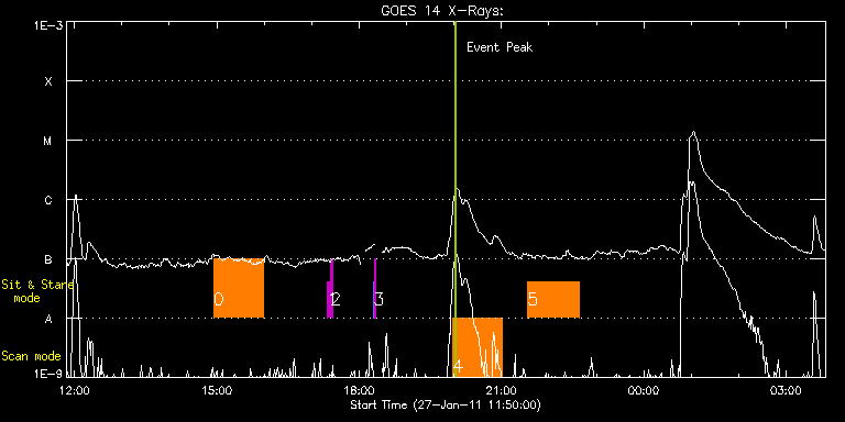 EIS Observation timeline overlay to GOES-Xray curve Code 1" 2" 40" 266" EIS Observations list for this event: STUDY ACRONYM ID DATE OBSERVED DESCRIPTION NOAA# TARGET 0 vhh_slowar_sas_1h6m | 20855 | 2011/01/27 14:55:57 | Outflows and Oscillations at the edge | | Active Region TIMELINE ID DATE OBSERVED FITS FILE XCEN (+W/-E) YCEN (+N/-S) DUR ----------------------------------------------------------------------------------------------------------------- 20855 | 2011/01/27 14:55:57.000 | eis_l0_20110127_145557.fits.gz | 802.64 | 499.55 | 1h2m51s 1 regcal071 | 20849 | 2011/01/27 17:20:11 | Dark exposures, CCD bottom rows (100s | | Engineering TIMELINE ID DATE OBSERVED FITS FILE XCEN (+W/-E) YCEN (+N/-S) DUR ----------------------------------------------------------------------------------------------------------------- 20849 | 2011/01/27 17:20:11.000 | eis_l0_20110127_172011.fits.gz | 884.63 | 54.63 | 3m22s 2 regcal072 | 20850 | 2011/01/27 17:24:00 | Dark exposures, top CCD rows (100s exp | | Engineering TIMELINE ID DATE OBSERVED FITS FILE XCEN (+W/-E) YCEN (+N/-S) DUR ----------------------------------------------------------------------------------------------------------------- 20850 | 2011/01/27 17:24:00.000 | eis_l0_20110127_172400.fits.gz | 884.63 | 565.63 | 3m22s 3 SYNOP005_A | 20844 | 2011/01/27 18:18:21 | Synoptic observation | | Quiet Sun TIMELINE ID DATE OBSERVED FITS FILE XCEN (+W/-E) YCEN (+N/-S) DUR ----------------------------------------------------------------------------------------------------------------- 20844 | 2011/01/27 18:18:21.000 | eis_l0_20110127_181821.fits.gz | -19.60 | -0.58 | 1m30s 20844 | 2011/01/27 18:20:02.000 | eis_l0_20110127_182002.fits.gz | -0.02 | -0.58 | 1m30s 4 Atlas_60 | 20851 | 2011/01/27 19:58:53 | EIS Spectral Atlas Synoptic Programme | 1147 | Quiet Sun TIMELINE ID DATE OBSERVED FITS FILE XCEN (+W/-E) YCEN (+N/-S) DUR ----------------------------------------------------------------------------------------------------------------- 20851 | 2011/01/27 19:58:53.000 | eis_l0_20110127_195853.fits.gz | 869.61 | 359.40 | 1h1m40s 5 inn_ar_lmb_ss03 | 20856 | 2011/01/27 21:33:12 | Oscillations and Outflows in AR at the | | Active Region TIMELINE ID DATE OBSERVED FITS FILE XCEN (+W/-E) YCEN (+N/-S) DUR ----------------------------------------------------------------------------------------------------------------- 20856 | 2011/01/27 21:33:12.000 | eis_l0_20110127_213312.fits.gz | 817.61 | 503.40 | 1h4m30s : Check study information : Download file : View thumbnails For this event, also check for: