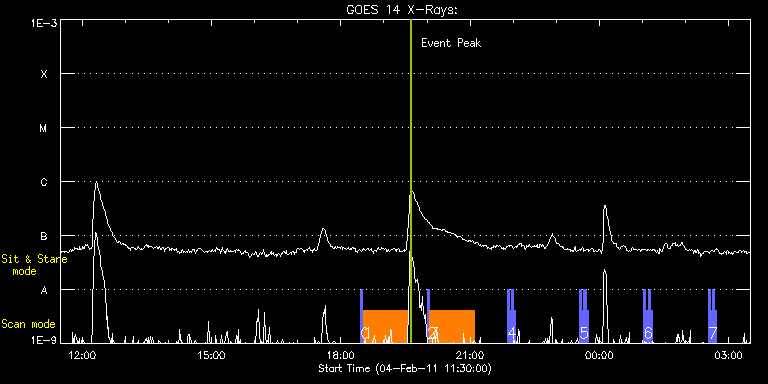 EIS Observation timeline overlay to GOES-Xray curve Code 1" 2" 40" 266" EIS Observations list for this event: STUDY ACRONYM ID DATE OBSERVED DESCRIPTION NOAA# TARGET 0 PRY_slot_context_v3 | 21009 | 2011/02/04 18:27:44 | Slot context for study 447 test on sma | 1153 | Active Region TIMELINE ID DATE OBSERVED FITS FILE XCEN (+W/-E) YCEN (+N/-S) DUR ----------------------------------------------------------------------------------------------------------------- 21009 | 2011/02/04 18:27:44.000 | eis_l0_20110204_182744.fits.gz | 83.79 | 154.69 | 2m57s 1 GDZ_300x384_S2S3_35 | 21010 | 2011/02/04 18:31:06 | test run for study 447 - small AR | | Active Region TIMELINE ID DATE OBSERVED FITS FILE XCEN (+W/-E) YCEN (+N/-S) DUR ----------------------------------------------------------------------------------------------------------------- 21010 | 2011/02/04 18:31:06.000 | eis_l0_20110204_183106.fits.gz | 106.62 | 606.43 | 1h1m43s 2 PRY_slot_context_v3 | 21011 | 2011/02/04 20:00:33 | Slot context for study 447 test on AR | 1153 | Active Region TIMELINE ID DATE OBSERVED FITS FILE XCEN (+W/-E) YCEN (+N/-S) DUR ----------------------------------------------------------------------------------------------------------------- 21011 | 2011/02/04 20:00:33.000 | eis_l0_20110204_200033.fits.gz | 354.46 | 203.28 | 2m55s 3 GDZ_300x384_S2S3_35 | 21012 | 2011/02/04 20:03:53 | test run for study 447 - AR 11150 | 1150 | Active Region TIMELINE ID DATE OBSERVED FITS FILE XCEN (+W/-E) YCEN (+N/-S) DUR ----------------------------------------------------------------------------------------------------------------- 21012 | 2011/02/04 20:03:53.000 | eis_l0_20110204_200353.fits.gz | 369.18 | -264.84 | 1h1m44s 4 PRY_slot_contextLITE | 21013 | 2011/02/04 21:51:26 | slot obs AR 11150 | 1150 | Active Region TIMELINE ID DATE OBSERVED FITS FILE XCEN (+W/-E) YCEN (+N/-S) DUR ----------------------------------------------------------------------------------------------------------------- 21013 | 2011/02/04 21:51:26.000 | eis_l0_20110204_215126.fits.gz | 368.60 | -265.46 | 2m57s 21013 | 2011/02/04 21:54:26.000 | eis_l0_20110204_215426.fits.gz | 368.98 | -265.46 | 2m57s 21013 | 2011/02/04 21:57:27.000 | eis_l0_20110204_215727.fits.gz | 369.37 | -265.54 | 2m55s 21013 | 2011/02/04 22:00:26.000 | eis_l0_20110204_220026.fits.gz | 369.68 | -265.46 | 2m56s 5 PRY_slot_contextLITE | 21014 | 2011/02/04 23:32:12 | slot obs AR 11150 | 1150 | Active Region TIMELINE ID DATE OBSERVED FITS FILE XCEN (+W/-E) YCEN (+N/-S) DUR ----------------------------------------------------------------------------------------------------------------- 21014 | 2011/02/04 23:32:12.000 | eis_l0_20110204_233212.fits.gz | 381.58 | -266.08 | 2m56s 21014 | 2011/02/04 23:35:12.000 | eis_l0_20110204_233512.fits.gz | 382.04 | -266.15 | 2m56s 21014 | 2011/02/04 23:38:12.000 | eis_l0_20110204_233812.fits.gz | 382.42 | -266.00 | 2m56s 21014 | 2011/02/04 23:41:12.000 | eis_l0_20110204_234112.fits.gz | 382.73 | -266.15 | 2m56s 6 PRY_slot_contextLITE | 21015 | 2011/02/05 01:01:35 | slot obs AR 11150 | 1150 | Active Region TIMELINE ID DATE OBSERVED FITS FILE XCEN (+W/-E) YCEN (+N/-S) DUR ----------------------------------------------------------------------------------------------------------------- 21015 | 2011/02/05 01:01:35.000 | eis_l0_20110205_010135.fits.gz | 393.08 | -266.62 | 2m56s 21015 | 2011/02/05 01:04:35.000 | eis_l0_20110205_010435.fits.gz | 393.55 | -266.62 | 2m56s 21015 | 2011/02/05 01:07:35.000 | eis_l0_20110205_010735.fits.gz | 393.93 | -266.62 | 2m56s 21015 | 2011/02/05 01:10:35.000 | eis_l0_20110205_011035.fits.gz | 394.24 | -266.70 | 2m56s 7 PRY_slot_contextLITE | 21016 | 2011/02/05 02:30:59 | slot obs AR 11150 | 1150 | Active Region TIMELINE ID DATE OBSERVED FITS FILE XCEN (+W/-E) YCEN (+N/-S) DUR ----------------------------------------------------------------------------------------------------------------- 21016 | 2011/02/05 02:30:59.000 | eis_l0_20110205_023059.fits.gz | 404.60 | -267.16 | 2m56s 21016 | 2011/02/05 02:33:59.000 | eis_l0_20110205_023359.fits.gz | 404.90 | -267.16 | 2m56s 21016 | 2011/02/05 02:36:59.000 | eis_l0_20110205_023659.fits.gz | 405.37 | -267.31 | 2m56s 21016 | 2011/02/05 02:39:59.000 | eis_l0_20110205_023959.fits.gz | 405.60 | -267.24 | 2m56s : Check study information : Download file : View thumbnails For this event, also check for: