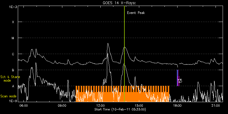 EIS Observation timeline overlay to GOES-Xray curve Code 1" 2" 40" 266" EIS Observations list for this event: STUDY ACRONYM ID DATE OBSERVED DESCRIPTION NOAA# TARGET 0 HH_Flare_180x160_v2 | 21054 | 2011/02/10 10:04:14 | Observe flaring AR on the west limb | 1153 | Flare TIMELINE ID DATE OBSERVED FITS FILE XCEN (+W/-E) YCEN (+N/-S) DUR ----------------------------------------------------------------------------------------------------------------- 21054 | 2011/02/10 10:04:14.000 | eis_l0_20110210_100414.fits.gz | -217.51 | -493.00 | 5m47s 21054 | 2011/02/10 10:10:03.000 | eis_l0_20110210_101003.fits.gz | -217.51 | -493.00 | 5m47s 21054 | 2011/02/10 10:15:53.000 | eis_l0_20110210_101553.fits.gz | -217.51 | -493.00 | 5m47s 21054 | 2011/02/10 10:21:43.000 | eis_l0_20110210_102143.fits.gz | -217.51 | -493.00 | 5m47s 21054 | 2011/02/10 10:27:33.000 | eis_l0_20110210_102733.fits.gz | -217.51 | -493.00 | 5m46s 21054 | 2011/02/10 10:33:22.000 | eis_l0_20110210_103322.fits.gz | -217.51 | -493.00 | 5m47s 21054 | 2011/02/10 10:39:12.000 | eis_l0_20110210_103912.fits.gz | -217.51 | -493.00 | 5m46s 21054 | 2011/02/10 10:45:01.000 | eis_l0_20110210_104501.fits.gz | 934.02 | 278.32 | 5m47s 21054 | 2011/02/10 10:50:51.000 | eis_l0_20110210_105051.fits.gz | 934.09 | 278.47 | 5m46s 21054 | 2011/02/10 10:56:40.000 | eis_l0_20110210_105640.fits.gz | 934.02 | 278.47 | 5m46s 21054 | 2011/02/10 11:02:29.000 | eis_l0_20110210_110229.fits.gz | 934.02 | 278.32 | 5m46s 21054 | 2011/02/10 11:08:18.000 | eis_l0_20110210_110818.fits.gz | 934.02 | 278.32 | 5m46s 21054 | 2011/02/10 11:14:06.000 | eis_l0_20110210_111406.fits.gz | 934.02 | 278.32 | 5m47s 21054 | 2011/02/10 11:19:55.000 | eis_l0_20110210_111955.fits.gz | 934.02 | 278.32 | 5m47s 21054 | 2011/02/10 11:25:45.000 | eis_l0_20110210_112545.fits.gz | 934.02 | 278.32 | 5m47s 21054 | 2011/02/10 11:31:35.000 | eis_l0_20110210_113135.fits.gz | 934.02 | 278.32 | 5m46s 21054 | 2011/02/10 11:37:24.000 | eis_l0_20110210_113724.fits.gz | 934.02 | 278.32 | 5m47s 21054 | 2011/02/10 11:43:14.000 | eis_l0_20110210_114314.fits.gz | 934.02 | 278.32 | 5m47s 21054 | 2011/02/10 11:49:04.000 | eis_l0_20110210_114904.fits.gz | 934.02 | 278.32 | 5m46s 21054 | 2011/02/10 11:54:53.000 | eis_l0_20110210_115453.fits.gz | 934.02 | 278.32 | 5m47s 21054 | 2011/02/10 12:00:43.000 | eis_l0_20110210_120043.fits.gz | 934.02 | 278.47 | 5m46s 21054 | 2011/02/10 12:06:32.000 | eis_l0_20110210_120632.fits.gz | 934.09 | 278.40 | 5m47s 21054 | 2011/02/10 12:12:21.000 | eis_l0_20110210_121221.fits.gz | 934.09 | 278.40 | 5m47s 21054 | 2011/02/10 12:18:10.000 | eis_l0_20110210_121810.fits.gz | 934.09 | 278.32 | 5m47s 21054 | 2011/02/10 12:24:00.000 | eis_l0_20110210_122400.fits.gz | 934.02 | 278.47 | 5m46s 21054 | 2011/02/10 12:29:49.000 | eis_l0_20110210_122949.fits.gz | 934.02 | 278.47 | 5m46s 21054 | 2011/02/10 12:35:37.000 | eis_l0_20110210_123537.fits.gz | 934.02 | 278.47 | 5m46s 21054 | 2011/02/10 12:41:26.000 | eis_l0_20110210_124126.fits.gz | 934.02 | 278.47 | 5m47s 21054 | 2011/02/10 12:47:16.000 | eis_l0_20110210_124716.fits.gz | 934.02 | 278.47 | 5m47s 21054 | 2011/02/10 12:53:05.000 | eis_l0_20110210_125305.fits.gz | 934.02 | 278.47 | 5m47s 21054 | 2011/02/10 12:58:55.000 | eis_l0_20110210_125855.fits.gz | 934.02 | 278.47 | 5m46s 21054 | 2011/02/10 13:04:44.000 | eis_l0_20110210_130444.fits.gz | 934.02 | 278.47 | 5m47s 21054 | 2011/02/10 13:10:33.000 | eis_l0_20110210_131033.fits.gz | 934.02 | 278.47 | 5m47s 21054 | 2011/02/10 13:16:23.000 | eis_l0_20110210_131623.fits.gz | 934.02 | 278.47 | 5m46s 21054 | 2011/02/10 13:22:12.000 | eis_l0_20110210_132212.fits.gz | 934.02 | 278.47 | 5m46s 21054 | 2011/02/10 13:28:01.000 | eis_l0_20110210_132801.fits.gz | 934.02 | 278.47 | 5m46s 21054 | 2011/02/10 13:33:50.000 | eis_l0_20110210_133350.fits.gz | 934.02 | 278.47 | 5m46s 21054 | 2011/02/10 13:39:39.000 | eis_l0_20110210_133939.fits.gz | 934.02 | 278.47 | 5m46s 21054 | 2011/02/10 13:45:28.000 | eis_l0_20110210_134528.fits.gz | 934.09 | 278.40 | 5m47s 21054 | 2011/02/10 13:51:18.000 | eis_l0_20110210_135118.fits.gz | 934.02 | 278.32 | 5m46s 21054 | 2011/02/10 13:57:07.000 | eis_l0_20110210_135707.fits.gz | 933.94 | 278.32 | 5m47s 21054 | 2011/02/10 14:02:57.000 | eis_l0_20110210_140257.fits.gz | 934.09 | 278.40 | 5m47s 21054 | 2011/02/10 14:08:46.000 | eis_l0_20110210_140846.fits.gz | 934.09 | 278.40 | 5m47s 21054 | 2011/02/10 14:14:36.000 | eis_l0_20110210_141436.fits.gz | 934.09 | 278.40 | 5m46s 21054 | 2011/02/10 14:20:25.000 | eis_l0_20110210_142025.fits.gz | 934.09 | 278.40 | 5m46s 21054 | 2011/02/10 14:26:14.000 | eis_l0_20110210_142614.fits.gz | 934.09 | 278.40 | 5m46s 21054 | 2011/02/10 14:32:03.000 | eis_l0_20110210_143203.fits.gz | 934.09 | 278.40 | 5m47s 21054 | 2011/02/10 14:37:53.000 | eis_l0_20110210_143753.fits.gz | 934.09 | 278.40 | 5m47s 21054 | 2011/02/10 14:43:42.000 | eis_l0_20110210_144342.fits.gz | 934.09 | 278.40 | 5m46s 21054 | 2011/02/10 14:49:31.000 | eis_l0_20110210_144931.fits.gz | 934.09 | 278.40 | 5m46s 21054 | 2011/02/10 14:55:20.000 | eis_l0_20110210_145520.fits.gz | 934.09 | 278.40 | 5m47s 21054 | 2011/02/10 15:01:09.000 | eis_l0_20110210_150109.fits.gz | 934.09 | 278.40 | 5m47s 21054 | 2011/02/10 15:06:59.000 | eis_l0_20110210_150659.fits.gz | 934.09 | 278.40 | 5m47s 21054 | 2011/02/10 15:12:49.000 | eis_l0_20110210_151249.fits.gz | 934.09 | 278.40 | 5m46s 21054 | 2011/02/10 15:18:38.000 | eis_l0_20110210_151838.fits.gz | 934.09 | 278.40 | 5m46s 21054 | 2011/02/10 15:24:27.000 | eis_l0_20110210_152427.fits.gz | 934.09 | 278.40 | 5m47s 21054 | 2011/02/10 15:30:16.000 | eis_l0_20110210_153016.fits.gz | 934.09 | 278.40 | 5m48s 21054 | 2011/02/10 15:36:06.000 | eis_l0_20110210_153606.fits.gz | 934.02 | 278.32 | 5m47s 21054 | 2011/02/10 15:41:56.000 | eis_l0_20110210_154156.fits.gz | 934.02 | 278.32 | 5m47s 21054 | 2011/02/10 15:47:45.000 | eis_l0_20110210_154745.fits.gz | 934.02 | 278.40 | 5m47s 21054 | 2011/02/10 15:53:34.000 | eis_l0_20110210_155334.fits.gz | 934.02 |
