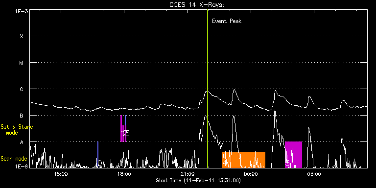 EIS Observation timeline overlay to GOES-Xray curve Code 1" 2" 40" 266" EIS Observations list for this event: STUDY ACRONYM ID DATE OBSERVED DESCRIPTION NOAA# TARGET 0 eis:eitwave_context | 21053 | 2011/02/11 16:43:52 | Dynamics and physical properties of la | | Quiet Sun TIMELINE ID DATE OBSERVED FITS FILE XCEN (+W/-E) YCEN (+N/-S) DUR ----------------------------------------------------------------------------------------------------------------- 21053 | 2011/02/11 16:43:52.000 | eis_l0_20110211_164352.fits.gz | 14.65 | 100.31 | 1m32s 1 regcal071 | 21046 | 2011/02/11 17:49:41 | Dark exposures, CCD bottom rows (100s | | Engineering TIMELINE ID DATE OBSERVED FITS FILE XCEN (+W/-E) YCEN (+N/-S) DUR ----------------------------------------------------------------------------------------------------------------- 21046 | 2011/02/11 17:49:41.000 | eis_l0_20110211_174941.fits.gz | 59.24 | -204.69 | 3m22s 2 regcal072 | 21047 | 2011/02/11 17:56:01 | Dark exposures, top CCD rows (100s exp | | Engineering TIMELINE ID DATE OBSERVED FITS FILE XCEN (+W/-E) YCEN (+N/-S) DUR ----------------------------------------------------------------------------------------------------------------- 21047 | 2011/02/11 17:56:01.000 | eis_l0_20110211_175601.fits.gz | 60.09 | 306.46 | 3m22s 3 SYNOP005_A | 21048 | 2011/02/11 18:02:23 | Sensitivity monitoring during XRT syno | | Quiet Sun TIMELINE ID DATE OBSERVED FITS FILE XCEN (+W/-E) YCEN (+N/-S) DUR ----------------------------------------------------------------------------------------------------------------- 21048 | 2011/02/11 18:02:23.000 | eis_l0_20110211_180223.fits.gz | -19.68 | -0.50 | 1m30s 21048 | 2011/02/11 18:04:04.000 | eis_l0_20110211_180404.fits.gz | -0.02 | -0.50 | 1m30s 4 Atlas_120 | 21055 | 2011/02/11 22:38:56 | Spectral Atlas of a coronal hole at ce | | Quiet Sun TIMELINE ID DATE OBSERVED FITS FILE XCEN (+W/-E) YCEN (+N/-S) DUR ----------------------------------------------------------------------------------------------------------------- 21055 | 2011/02/11 22:38:56.000 | eis_l0_20110211_223856.fits.gz | 15.14 | -508.38 | 2h1m39s 5 HPW021_VEL_120x512v2 | 21056 | 2011/02/12 01:37:26 | Diagnostic scan of AR | 1156 | Active Region TIMELINE ID DATE OBSERVED FITS FILE XCEN (+W/-E) YCEN (+N/-S) DUR ----------------------------------------------------------------------------------------------------------------- 21056 | 2011/02/12 01:37:26.000 | eis_l0_20110212_013726.fits.gz | 44.26 | -173.31 | 46m54s : Check study information : Download file : View thumbnails For this event, also check for: