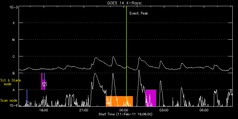 EIS Observation timeline overlay to GOES-Xray curve Code 1" 2" 40" 266" EIS Observations list for this event: STUDY ACRONYM ID DATE OBSERVED DESCRIPTION NOAA# TARGET 0 eis:eitwave_context | 21053 | 2011/02/11 16:43:52 | Dynamics and physical properties of la | | Quiet Sun TIMELINE ID DATE OBSERVED FITS FILE XCEN (+W/-E) YCEN (+N/-S) DUR ----------------------------------------------------------------------------------------------------------------- 21053 | 2011/02/11 16:43:52.000 | eis_l0_20110211_164352.fits.gz | 14.65 | 100.31 | 1m32s 1 regcal071 | 21046 | 2011/02/11 17:49:41 | Dark exposures, CCD bottom rows (100s | | Engineering TIMELINE ID DATE OBSERVED FITS FILE XCEN (+W/-E) YCEN (+N/-S) DUR ----------------------------------------------------------------------------------------------------------------- 21046 | 2011/02/11 17:49:41.000 | eis_l0_20110211_174941.fits.gz | 59.24 | -204.69 | 3m22s 2 regcal072 | 21047 | 2011/02/11 17:56:01 | Dark exposures, top CCD rows (100s exp | | Engineering TIMELINE ID DATE OBSERVED FITS FILE XCEN (+W/-E) YCEN (+N/-S) DUR ----------------------------------------------------------------------------------------------------------------- 21047 | 2011/02/11 17:56:01.000 | eis_l0_20110211_175601.fits.gz | 60.09 | 306.46 | 3m22s 3 SYNOP005_A | 21048 | 2011/02/11 18:02:23 | Sensitivity monitoring during XRT syno | | Quiet Sun TIMELINE ID DATE OBSERVED FITS FILE XCEN (+W/-E) YCEN (+N/-S) DUR ----------------------------------------------------------------------------------------------------------------- 21048 | 2011/02/11 18:02:23.000 | eis_l0_20110211_180223.fits.gz | -19.68 | -0.50 | 1m30s 21048 | 2011/02/11 18:04:04.000 | eis_l0_20110211_180404.fits.gz | -0.02 | -0.50 | 1m30s 4 Atlas_120 | 21055 | 2011/02/11 22:38:56 | Spectral Atlas of a coronal hole at ce | | Quiet Sun TIMELINE ID DATE OBSERVED FITS FILE XCEN (+W/-E) YCEN (+N/-S) DUR ----------------------------------------------------------------------------------------------------------------- 21055 | 2011/02/11 22:38:56.000 | eis_l0_20110211_223856.fits.gz | 15.14 | -508.38 | 2h1m39s 5 HPW021_VEL_120x512v2 | 21056 | 2011/02/12 01:37:26 | Diagnostic scan of AR | 1156 | Active Region TIMELINE ID DATE OBSERVED FITS FILE XCEN (+W/-E) YCEN (+N/-S) DUR ----------------------------------------------------------------------------------------------------------------- 21056 | 2011/02/12 01:37:26.000 | eis_l0_20110212_013726.fits.gz | 44.26 | -173.31 | 46m54s : Check study information : Download file : View thumbnails For this event, also check for: