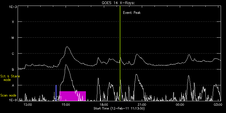 EIS Observation timeline overlay to GOES-Xray curve Code 1" 2" 40" 266" EIS Observations list for this event: STUDY ACRONYM ID DATE OBSERVED DESCRIPTION NOAA# TARGET 0 eis:eitwave_context | 21059 | 2011/02/12 14:13:10 | HOP 180 EIT WAVES | | Quiet Sun TIMELINE ID DATE OBSERVED FITS FILE XCEN (+W/-E) YCEN (+N/-S) DUR ----------------------------------------------------------------------------------------------------------------- 21059 | 2011/02/12 14:13:10.000 | eis_l0_20110212_141310.fits.gz | -334.78 | -31.73 | 1m32s 1 HPW021_VEL_240x512v1 | 21066 | 2011/02/12 14:30:19 | EIS Velocity/DEM Study | 1158 | Active Region TIMELINE ID DATE OBSERVED FITS FILE XCEN (+W/-E) YCEN (+N/-S) DUR ----------------------------------------------------------------------------------------------------------------- 21066 | 2011/02/12 14:30:19.000 | eis_l0_20110212_143019.fits.gz | -311.99 | -165.65 | 2h3m49s : Check study information : Download file : View thumbnails For this event, also check for: