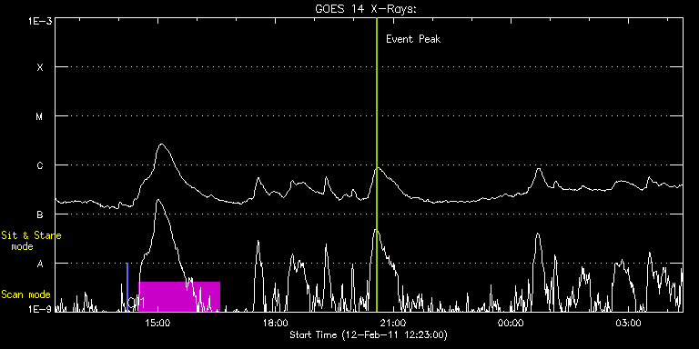 EIS Observation timeline overlay to GOES-Xray curve Code 1" 2" 40" 266" EIS Observations list for this event: STUDY ACRONYM ID DATE OBSERVED DESCRIPTION NOAA# TARGET 0 eis:eitwave_context | 21059 | 2011/02/12 14:13:10 | HOP 180 EIT WAVES | | Quiet Sun TIMELINE ID DATE OBSERVED FITS FILE XCEN (+W/-E) YCEN (+N/-S) DUR ----------------------------------------------------------------------------------------------------------------- 21059 | 2011/02/12 14:13:10.000 | eis_l0_20110212_141310.fits.gz | -334.78 | -31.73 | 1m32s 1 HPW021_VEL_240x512v1 | 21066 | 2011/02/12 14:30:19 | EIS Velocity/DEM Study | 1158 | Active Region TIMELINE ID DATE OBSERVED FITS FILE XCEN (+W/-E) YCEN (+N/-S) DUR ----------------------------------------------------------------------------------------------------------------- 21066 | 2011/02/12 14:30:19.000 | eis_l0_20110212_143019.fits.gz | -311.99 | -165.65 | 2h3m49s : Check study information : Download file : View thumbnails For this event, also check for: