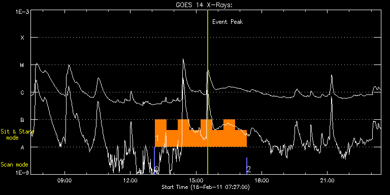 EIS Observation timeline overlay to GOES-Xray curve Code 1" 2" 40" 266" EIS Observations list for this event: STUDY ACRONYM ID DATE OBSERVED DESCRIPTION NOAA# TARGET 0 eis:eitwave_context | 21078 | 2011/02/16 13:05:19 | HOP 180 EIT Waves Context Raster | 1158 | Quiet Sun TIMELINE ID DATE OBSERVED FITS FILE XCEN (+W/-E) YCEN (+N/-S) DUR ----------------------------------------------------------------------------------------------------------------- 21078 | 2011/02/16 13:05:19.000 | eis_l0_20110216_130519.fits.gz | 402.74 | -37.29 | 1m33s 1 eis:eitwave_obssns | 21079 | 2011/02/16 13:07:17 | HOP 180 EIT Waves | | Quiet Sun TIMELINE ID DATE OBSERVED FITS FILE XCEN (+W/-E) YCEN (+N/-S) DUR ----------------------------------------------------------------------------------------------------------------- 21079 | 2011/02/16 13:07:17.000 | eis_l0_20110216_130717.fits.gz | 422.70 | -37.29 | 31m15s 21079 | 2011/02/16 13:38:36.000 | eis_l0_20110216_133836.fits.gz | 426.57 | -37.60 | 31m16s 21079 | 2011/02/16 14:09:55.000 | eis_l0_20110216_140955.fits.gz | 430.43 | -37.91 | 31m15s 21079 | 2011/02/16 14:41:13.000 | eis_l0_20110216_144113.fits.gz | 434.29 | -38.06 | 31m15s 21079 | 2011/02/16 15:12:31.000 | eis_l0_20110216_151231.fits.gz | 438.07 | -38.37 | 31m16s 21079 | 2011/02/16 15:43:51.000 | eis_l0_20110216_154351.fits.gz | 441.94 | -38.68 | 31m15s 21079 | 2011/02/16 16:15:10.000 | eis_l0_20110216_161510.fits.gz | 445.72 | -38.83 | 31m15s 21079 | 2011/02/16 16:46:28.000 | eis_l0_20110216_164628.fits.gz | 449.51 | -39.22 | 31m15s 2 eis:eitwave_context | 21080 | 2011/02/16 17:17:55 | HOP 180 EIT Waves Context Raster | | Quiet Sun TIMELINE ID DATE OBSERVED FITS FILE XCEN (+W/-E) YCEN (+N/-S) DUR ----------------------------------------------------------------------------------------------------------------- 21080 | 2011/02/16 17:17:55.000 | eis_l0_20110216_171755.fits.gz | 482.31 | -39.30 | 1m32s : Check study information : Download file : View thumbnails For this event, also check for: