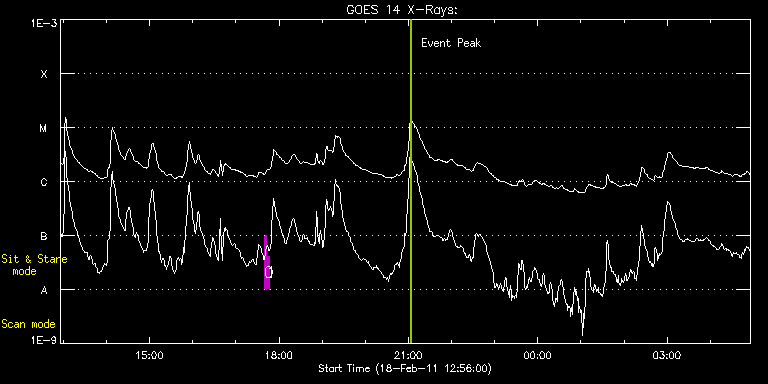 EIS Observation timeline overlay to GOES-Xray curve Code 1" 2" 40" 266" EIS Observations list for this event: STUDY ACRONYM ID DATE OBSERVED DESCRIPTION NOAA# TARGET 0 regcal071 | 21088 | 2011/02/18 17:39:14 | Dark exposures, CCD bottom rows (100s | | Engineering TIMELINE ID DATE OBSERVED FITS FILE XCEN (+W/-E) YCEN (+N/-S) DUR ----------------------------------------------------------------------------------------------------------------- 21088 | 2011/02/18 17:39:14.000 | eis_l0_20110218_173914.fits.gz | 801.59 | -585.45 | 3m22s 1 regcal072 | 21089 | 2011/02/18 17:43:03 | Dark exposures, top CCD rows (100s exp | | Engineering TIMELINE ID DATE OBSERVED FITS FILE XCEN (+W/-E) YCEN (+N/-S) DUR ----------------------------------------------------------------------------------------------------------------- 21089 | 2011/02/18 17:43:03.000 | eis_l0_20110218_174303.fits.gz | 801.74 | -74.60 | 3m22s : Check study information : Download file : View thumbnails For this event, also check for: