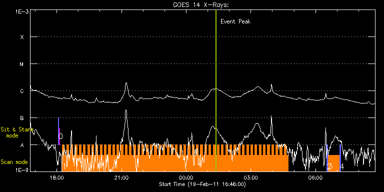 EIS Observation timeline overlay to GOES-Xray curve Code 1" 2" 40" 266" EIS Observations list for this event: STUDY ACRONYM ID DATE OBSERVED DESCRIPTION NOAA# TARGET 0 SYNOP005_A | 21094 | 2011/02/19 18:04:20 | | | Quiet Sun TIMELINE ID DATE OBSERVED FITS FILE XCEN (+W/-E) YCEN (+N/-S) DUR ----------------------------------------------------------------------------------------------------------------- 21094 | 2011/02/19 18:04:20.000 | eis_l0_20110219_180420.fits.gz | -19.68 | -0.58 | 1m30s 21094 | 2011/02/19 18:06:01.000 | eis_l0_20110219_180601.fits.gz | -0.10 | -0.50 | 1m30s 1 HH_Flare_180x160_v2 | 21105 | 2011/02/19 18:15:27 | Fast Scan Observations of AR 11162 | 1162 | Flare TIMELINE ID DATE OBSERVED FITS FILE XCEN (+W/-E) YCEN (+N/-S) DUR ----------------------------------------------------------------------------------------------------------------- 21105 | 2011/02/19 18:15:27.000 | eis_l0_20110219_181527.fits.gz | 232.07 | 407.21 | 5m47s 21105 | 2011/02/19 18:21:16.000 | eis_l0_20110219_182116.fits.gz | 232.77 | 407.29 | 5m46s 21105 | 2011/02/19 18:27:05.000 | eis_l0_20110219_182705.fits.gz | 233.70 | 407.21 | 5m46s 21105 | 2011/02/19 18:32:54.000 | eis_l0_20110219_183254.fits.gz | 234.47 | 407.14 | 5m47s 21105 | 2011/02/19 18:38:43.000 | eis_l0_20110219_183843.fits.gz | 235.16 | 407.21 | 5m46s 21105 | 2011/02/19 18:44:32.000 | eis_l0_20110219_184432.fits.gz | 236.09 | 407.21 | 5m46s 21105 | 2011/02/19 18:50:21.000 | eis_l0_20110219_185021.fits.gz | 236.94 | 407.06 | 5m47s 21105 | 2011/02/19 18:56:10.000 | eis_l0_20110219_185610.fits.gz | 237.71 | 407.21 | 5m47s 21105 | 2011/02/19 19:02:00.000 | eis_l0_20110219_190200.fits.gz | 238.64 | 407.14 | 5m47s 21105 | 2011/02/19 19:07:50.000 | eis_l0_20110219_190750.fits.gz | 239.49 | 407.21 | 5m47s 21105 | 2011/02/19 19:13:40.000 | eis_l0_20110219_191340.fits.gz | 240.18 | 407.21 | 5m47s 21105 | 2011/02/19 19:19:29.000 | eis_l0_20110219_191929.fits.gz | 241.11 | 406.98 | 5m47s 21105 | 2011/02/19 19:25:19.000 | eis_l0_20110219_192519.fits.gz | 241.96 | 406.98 | 5m47s 21105 | 2011/02/19 19:31:09.000 | eis_l0_20110219_193109.fits.gz | 242.73 | 406.90 | 5m46s 21105 | 2011/02/19 19:36:58.000 | eis_l0_20110219_193658.fits.gz | 243.58 | 406.90 | 5m46s 21105 | 2011/02/19 19:42:47.000 | eis_l0_20110219_194247.fits.gz | 244.43 | 406.90 | 5m46s 21105 | 2011/02/19 19:48:36.000 | eis_l0_20110219_194836.fits.gz | 245.21 | 406.90 | 5m46s 21105 | 2011/02/19 19:54:25.000 | eis_l0_20110219_195425.fits.gz | 245.98 | 406.75 | 5m46s 21105 | 2011/02/19 20:00:14.000 | eis_l0_20110219_200014.fits.gz | 246.91 | 406.67 | 5m46s 21105 | 2011/02/19 20:06:03.000 | eis_l0_20110219_200603.fits.gz | 247.76 | 406.75 | 5m46s 21105 | 2011/02/19 20:11:52.000 | eis_l0_20110219_201152.fits.gz | 248.60 | 406.75 | 5m47s 21105 | 2011/02/19 20:17:42.000 | eis_l0_20110219_201742.fits.gz | 249.38 | 406.67 | 5m47s 21105 | 2011/02/19 20:23:32.000 | eis_l0_20110219_202332.fits.gz | 250.23 | 406.67 | 5m47s 21105 | 2011/02/19 20:29:22.000 | eis_l0_20110219_202922.fits.gz | 251.00 | 406.90 | 5m46s 21105 | 2011/02/19 20:35:11.000 | eis_l0_20110219_203511.fits.gz | 251.85 | 406.67 | 5m47s 21105 | 2011/02/19 20:41:01.000 | eis_l0_20110219_204101.fits.gz | 252.70 | 406.60 | 5m46s 21105 | 2011/02/19 20:46:50.000 | eis_l0_20110219_204650.fits.gz | 253.47 | 406.67 | 5m47s 21105 | 2011/02/19 20:52:40.000 | eis_l0_20110219_205240.fits.gz | 254.32 | 406.60 | 5m47s 21105 | 2011/02/19 20:58:30.000 | eis_l0_20110219_205830.fits.gz | 255.09 | 406.60 | 5m46s 21105 | 2011/02/19 21:04:19.000 | eis_l0_20110219_210419.fits.gz | 255.94 | 406.60 | 5m46s 21105 | 2011/02/19 21:10:08.000 | eis_l0_20110219_211008.fits.gz | 256.79 | 406.52 | 5m46s 21105 | 2011/02/19 21:15:57.000 | eis_l0_20110219_211557.fits.gz | 257.64 | 406.44 | 5m46s 21105 | 2011/02/19 21:21:46.000 | eis_l0_20110219_212146.fits.gz | 258.49 | 406.36 | 5m46s 21105 | 2011/02/19 21:27:34.000 | eis_l0_20110219_212734.fits.gz | 259.19 | 406.44 | 5m47s 21105 | 2011/02/19 21:33:24.000 | eis_l0_20110219_213324.fits.gz | 260.04 | 406.36 | 5m46s 21105 | 2011/02/19 21:39:13.000 | eis_l0_20110219_213913.fits.gz | 260.96 | 406.36 | 5m47s 21105 | 2011/02/19 21:45:03.000 | eis_l0_20110219_214503.fits.gz | 261.82 | 406.29 | 5m47s 21105 | 2011/02/19 21:50:52.000 | eis_l0_20110219_215052.fits.gz | 262.59 | 406.21 | 5m47s 21105 | 2011/02/19 21:56:42.000 | eis_l0_20110219_215642.fits.gz | 263.44 | 406.13 | 5m47s 21105 | 2011/02/19 22:02:32.000 | eis_l0_20110219_220232.fits.gz | 264.13 | 406.29 | 5m47s 21105 | 2011/02/19 22:08:21.000 | eis_l0_20110219_220821.fits.gz | 265.06 | 406.13 | 5m47s 21105 | 2011/02/19 22:14:11.000 | eis_l0_20110219_221411.fits.gz | 265.83 | 406.21 | 5m46s 21105 | 2011/02/19 22:20:00.000 | eis_l0_20110219_222000.fits.gz | 266.68 | 406.05 | 5m46s 21105 | 2011/02/19 22:25:49.000 | eis_l0_20110219_222549.fits.gz | 267.45 | 406.21 | 5m46s 21105 | 2011/02/19 22:31:37.000 | eis_l0_20110219_223137.fits.gz | 268.30 | 406.13 | 5m46s 21105 | 2011/02/19 22:37:26.000 | eis_l0_20110219_223726.fits.gz | 269.15 | 406.05 | 5m46s 21105 | 2011/02/19 22:43:15.000 | eis_l0_20110219_224315.fits.gz | 269.93 | 406.13 | 5m47s 21105 | 2011/02/19 22:49:05.000 | eis_l0_20110219_224905.fits.gz | 270.70 | 405.98 | 5m46s 21105 | 2011/02/19 22:54:54.000 | eis_l0_20110219_225454.fits.gz | 271.55 | 405.98 | 5m47s 21105 | 2011/02/19 23:00:44.000 | eis_l0_20110219_230044.fits.gz | 272.40 | 405.82 | 5m47s 21105 | 2011/02/19 23:06:34.000 | eis_l0_20110219_230634.fits.gz | 273.17 | 405.98 | 5m46s 21105 | 2011/02/19 23:12:23.000 | eis_l0_20110219_231223.fits.gz | 274.10 | 405.82 | 5m47s 21105 | 2011/02/19 23:18:13.000 | eis_l0_20110219_231813.fits.gz | 274.87 | 405.74 | 5m47s 21105 | 2011/02/19 23:24:03.000 | eis_l0_20110219_232403.fits.gz | 275.72 | 405.74 | 5m46s 21105 | 2011/02/19 23:29:52.000 | eis_l0_20110219_232952.fits.gz | 276.57 | 405.82 | 5m47s 21105 | 2011/02/19 23:35:42.000 | eis_l0_20110219_233542.fits.gz | 277.34 | 405.67 | 5m46s 21105 | 2011/02/19 23:41:31.000 | ei