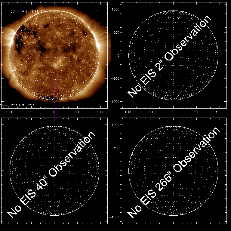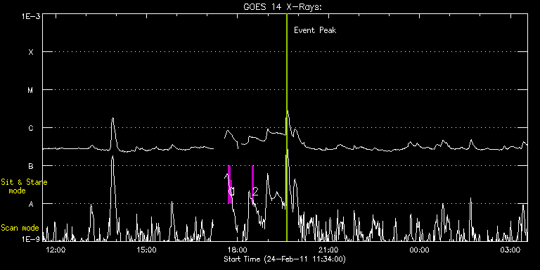 EIS Observation timeline overlay to GOES-Xray curve Code 1" 2" 40" 266" EIS Observations list for this event: STUDY ACRONYM ID DATE OBSERVED DESCRIPTION NOAA# TARGET 0 regcal071 | 21188 | 2011/02/24 17:41:42 | Dark exposures, CCD bottom rows (100s | | Engineering TIMELINE ID DATE OBSERVED FITS FILE XCEN (+W/-E) YCEN (+N/-S) DUR ----------------------------------------------------------------------------------------------------------------- 21188 | 2011/02/24 17:41:42.000 | eis_l0_20110224_174142.fits.gz | -1.32 | -1232.55 | 3m22s 1 regcal072 | 21189 | 2011/02/24 17:45:31 | Dark exposures, top CCD rows (100s exp | | Engineering TIMELINE ID DATE OBSERVED FITS FILE XCEN (+W/-E) YCEN (+N/-S) DUR ----------------------------------------------------------------------------------------------------------------- 21189 | 2011/02/24 17:45:31.000 | eis_l0_20110224_174531.fits.gz | -1.17 | -721.47 | 3m22s 2 regcal071 | 21190 | 2011/02/24 18:28:42 | Dark exposures, CCD bottom rows (100s | | Engineering TIMELINE ID DATE OBSERVED FITS FILE XCEN (+W/-E) YCEN (+N/-S) DUR ----------------------------------------------------------------------------------------------------------------- 21190 | 2011/02/24 18:28:42.000 | eis_l0_20110224_182842.fits.gz | -1.25 | -1232.55 | 3m22s : Check study information : Download file : View thumbnails For this event, also check for: