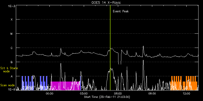 EIS Observation timeline overlay to GOES-Xray curve Code 1" 2" 40" 266" EIS Observations list for this event: STUDY ACRONYM ID DATE OBSERVED DESCRIPTION NOAA# TARGET 0 full_sun_slot_scan_1 | 21231 | 2011/02/25 21:33:43 | HOP 130: Full Sun Scan (top) 8/15 | | Quiet Sun TIMELINE ID DATE OBSERVED FITS FILE XCEN (+W/-E) YCEN (+N/-S) DUR ----------------------------------------------------------------------------------------------------------------- 21231 | 2011/02/25 21:33:43.000 | eis_l0_20110225_213343.fits.gz | -15.32 | 1126.61 | 5m27s 1 full_sun_slot_scan_1 | 21232 | 2011/02/25 21:39:15 | HOP 130: Full Sun Scan (bottom) 8/15 | | Quiet Sun TIMELINE ID DATE OBSERVED FITS FILE XCEN (+W/-E) YCEN (+N/-S) DUR ----------------------------------------------------------------------------------------------------------------- 21232 | 2011/02/25 21:39:15.000 | eis_l0_20110225_213915.fits.gz | -15.32 | 654.53 | 5m26s 2 full_sun_slot_scan_1 | 21233 | 2011/02/25 21:49:43 | HOP 130: Full Sun Scan (top) 9/15 | | Quiet Sun TIMELINE ID DATE OBSERVED FITS FILE XCEN (+W/-E) YCEN (+N/-S) DUR ----------------------------------------------------------------------------------------------------------------- 21233 | 2011/02/25 21:49:43.000 | eis_l0_20110225_214943.fits.gz | -426.51 | 1032.44 | 5m27s 3 full_sun_slot_scan_1 | 21234 | 2011/02/25 21:55:15 | HOP 130: Full Sun Scan (bottom) 9/15 | | Quiet Sun TIMELINE ID DATE OBSERVED FITS FILE XCEN (+W/-E) YCEN (+N/-S) DUR ----------------------------------------------------------------------------------------------------------------- 21234 | 2011/02/25 21:55:15.000 | eis_l0_20110225_215515.fits.gz | -426.36 | 560.60 | 5m27s 4 full_sun_slot_scan_1 | 21235 | 2011/02/25 22:05:43 | HOP 130: Full Sun Scan (top only) 10/ | 1164 | Quiet Sun TIMELINE ID DATE OBSERVED FITS FILE XCEN (+W/-E) YCEN (+N/-S) DUR ----------------------------------------------------------------------------------------------------------------- 21235 | 2011/02/25 22:05:43.000 | eis_l0_20110225_220543.fits.gz | -830.36 | 655.63 | 5m27s 5 full_sun_slot_scan_1 | 21236 | 2011/02/25 22:15:43 | HOP 130: Full Sun Scan (bottom only) | | Quiet Sun TIMELINE ID DATE OBSERVED FITS FILE XCEN (+W/-E) YCEN (+N/-S) DUR ----------------------------------------------------------------------------------------------------------------- 21236 | 2011/02/25 22:15:43.000 | eis_l0_20110225_221543.fits.gz | 798.56 | -756.94 | 5m26s 6 full_sun_slot_scan_1 | 21237 | 2011/02/25 22:25:43 | HOP 130: Full Sun Scan (top) 12/15 | | Quiet Sun TIMELINE ID DATE OBSERVED FITS FILE XCEN (+W/-E) YCEN (+N/-S) DUR ----------------------------------------------------------------------------------------------------------------- 21237 | 2011/02/25 22:25:43.000 | eis_l0_20110225_222543.fits.gz | 395.79 | -661.75 | 5m27s 7 full_sun_slot_scan_1 | 21238 | 2011/02/25 22:31:15 | HOP 130: Full Sun Scan (bottom) 12/15 | | Quiet Sun TIMELINE ID DATE OBSERVED FITS FILE XCEN (+W/-E) YCEN (+N/-S) DUR ----------------------------------------------------------------------------------------------------------------- 21238 | 2011/02/25 22:31:15.000 | eis_l0_20110225_223115.fits.gz | 395.87 | -1133.52 | 5m27s 8 full_sun_slot_scan_1 | 21239 | 2011/02/25 23:09:13 | HOP 130: Full Sun Scan (top) 13/15 | | Quiet Sun TIMELINE ID DATE OBSERVED FITS FILE XCEN (+W/-E) YCEN (+N/-S) DUR ----------------------------------------------------------------------------------------------------------------- 21239 | 2011/02/25 23:09:13.000 | eis_l0_20110225_230913.fits.gz | -15.32 | -755.53 | 5m27s 9 full_sun_slot_scan_1 | 21240 | 2011/02/25 23:14:45 | HOP 130: Full Sun Scan (bottom) 13/15 | | Quiet Sun TIMELINE ID DATE OBSERVED FITS FILE XCEN (+W/-E) YCEN (+N/-S) DUR ----------------------------------------------------------------------------------------------------------------- 21240 | 2011/02/25 23:14:45.000 | eis_l0_20110225_231445.fits.gz | -15.25 | -1227.61 | 5m26s 10 full_sun_slot_scan_1 | 21241 | 2011/02/25 23:25:13 | HOP 130: Full Sun Scan (top) 14/15 | | Quiet Sun TIMELINE ID DATE OBSERVED FITS FILE XCEN (+W/-E) YCEN (+N/-S) DUR ----------------------------------------------------------------------------------------------------------------- 21241 | 2011/02/25 23:25:13.000 | eis_l0_20110225_232513.fits.gz | -426.36 | -661.44 | 5m27s 11 full_sun_slot_scan_1 | 21242 | 2011/02/25 23:30:45 | HOP 130: Full Sun Scan (bottom) 14/15 | | Quiet Sun TIMELINE ID DATE OBSERVED FITS FILE XCEN (+W/-E) YCEN (+N/-S) DUR ----------------------------------------------------------------------------------------------------------------- 21242 | 2011/02/25 23:30:45.000 | eis_l0_20110225_233045.fits.gz | -426.36 | -1133.52 | 5m27s 12 full_sun_slot_scan_1 | 21243 | 2011/02/25 23:41:13 | HOP 130: Full Sun Scan (top only) 15/ | | Quiet Sun TIMELINE ID DATE OBSERVED FITS FILE XCEN (+W/-E) YCEN (+N/-S) DUR ----------------------------------------------------------------------------------------------------------------- 21243 | 2011/02/25 23:41:13.000 | eis_l0_20110225_234113.fits.gz | -830.28 | -757.32 | 5m26s 13 HPW015_DETAILED_MAP | 21248 | 2011/02/26 00:05:19 | Active Region STEREO/Cluster Quadratur | | Active Region TIMELINE ID DATE OBSERVED FITS FILE XCEN (+W/-E) YCEN (+N/-S) DUR ----------------------------------------------------------------------------------------------------------------- 21248 | 2011/02/26 00:05:19.000 | eis_l0_20110226_000519.fits.gz | 935.22 | 314.34 | 2h35m35s 14 PRY_slot_context_v3 | 21249 | 2011/02/26 02:41:19 | | | Active Region TIMELINE ID DATE OBSERVED FITS FILE XCEN (+W/-E) YCEN (+N/-S) DUR ----------------------------------------------------------------------------------------------------------------- 21249 | 2011/02/26 02:41:19.000 | eis_l0_20110226_024119.fits.gz | 905.69 | 328.27 | 2m56s 15 HH_Flare_180x160_v2 | 21276 | 2011/02/26 10:35:34 | Fast Scan Flare Observations of AR 111 | 1164 | Flare TIMELINE ID DATE OBSERVED FITS FILE XCEN (+W/-E) YCEN (+N/-S) DUR --------