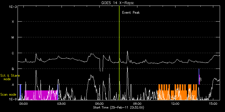 EIS Observation timeline overlay to GOES-Xray curve Code 1" 2" 40" 266" EIS Observations list for this event: STUDY ACRONYM ID DATE OBSERVED DESCRIPTION NOAA# TARGET 0 full_sun_slot_scan_1 | 21243 | 2011/02/25 23:41:13 | HOP 130: Full Sun Scan (top only) 15/ | | Quiet Sun TIMELINE ID DATE OBSERVED FITS FILE XCEN (+W/-E) YCEN (+N/-S) DUR ----------------------------------------------------------------------------------------------------------------- 21243 | 2011/02/25 23:41:13.000 | eis_l0_20110225_234113.fits.gz | -830.28 | -757.32 | 5m26s 1 HPW015_DETAILED_MAP | 21248 | 2011/02/26 00:05:19 | Active Region STEREO/Cluster Quadratur | | Active Region TIMELINE ID DATE OBSERVED FITS FILE XCEN (+W/-E) YCEN (+N/-S) DUR ----------------------------------------------------------------------------------------------------------------- 21248 | 2011/02/26 00:05:19.000 | eis_l0_20110226_000519.fits.gz | 935.22 | 314.34 | 2h35m35s 2 PRY_slot_context_v3 | 21249 | 2011/02/26 02:41:19 | | | Active Region TIMELINE ID DATE OBSERVED FITS FILE XCEN (+W/-E) YCEN (+N/-S) DUR ----------------------------------------------------------------------------------------------------------------- 21249 | 2011/02/26 02:41:19.000 | eis_l0_20110226_024119.fits.gz | 905.69 | 328.27 | 2m56s 3 HH_Flare_180x160_v2 | 21276 | 2011/02/26 10:35:34 | Fast Scan Flare Observations of AR 111 | 1164 | Flare TIMELINE ID DATE OBSERVED FITS FILE XCEN (+W/-E) YCEN (+N/-S) DUR ----------------------------------------------------------------------------------------------------------------- 21276 | 2011/02/26 10:35:34.000 | eis_l0_20110226_103534.fits.gz | -891.18 | 470.48 | 5m46s 21276 | 2011/02/26 10:41:23.000 | eis_l0_20110226_104123.fits.gz | -890.87 | 470.48 | 5m46s 21276 | 2011/02/26 10:47:11.000 | eis_l0_20110226_104711.fits.gz | -890.64 | 470.56 | 5m47s 21276 | 2011/02/26 10:53:01.000 | eis_l0_20110226_105301.fits.gz | -890.25 | 470.56 | 5m46s 21276 | 2011/02/26 10:58:50.000 | eis_l0_20110226_105850.fits.gz | -890.10 | 470.71 | 5m47s 21276 | 2011/02/26 11:04:40.000 | eis_l0_20110226_110440.fits.gz | -889.87 | 470.79 | 5m46s 21276 | 2011/02/26 11:10:29.000 | eis_l0_20110226_111029.fits.gz | -889.56 | 470.94 | 5m46s 21276 | 2011/02/26 11:16:18.000 | eis_l0_20110226_111618.fits.gz | -889.33 | 471.02 | 5m47s 21276 | 2011/02/26 11:22:07.000 | eis_l0_20110226_112207.fits.gz | -889.09 | 471.10 | 5m47s 21276 | 2011/02/26 11:27:57.000 | eis_l0_20110226_112757.fits.gz | -888.86 | 471.10 | 5m46s 4 HH_AR+FLR_RAS_N03 | 21290 | 2011/02/26 11:40:13 | Scan Flare Observations of AR 11164 | 1164 | Active Region TIMELINE ID DATE OBSERVED FITS FILE XCEN (+W/-E) YCEN (+N/-S) DUR ----------------------------------------------------------------------------------------------------------------- 21290 | 2011/02/26 11:40:13.000 | eis_l0_20110226_114013.fits.gz | -886.82 | 471.33 | 13m19s 5 HH_Flare_180x160_v2 | 21291 | 2011/02/26 11:57:13 | Fast Scan Flare Observations of AR 111 | 1164 | Flare TIMELINE ID DATE OBSERVED FITS FILE XCEN (+W/-E) YCEN (+N/-S) DUR ----------------------------------------------------------------------------------------------------------------- 21291 | 2011/02/26 11:57:13.000 | eis_l0_20110226_115713.fits.gz | -887.55 | 471.64 | 5m47s 21291 | 2011/02/26 12:03:03.000 | eis_l0_20110226_120303.fits.gz | -887.32 | 471.79 | 5m46s 21291 | 2011/02/26 12:08:52.000 | eis_l0_20110226_120852.fits.gz | -887.01 | 471.87 | 5m46s 21291 | 2011/02/26 12:14:41.000 | eis_l0_20110226_121441.fits.gz | -886.78 | 471.95 | 5m47s 21291 | 2011/02/26 12:20:31.000 | eis_l0_20110226_122031.fits.gz | -886.54 | 472.02 | 5m46s 21291 | 2011/02/26 12:26:20.000 | eis_l0_20110226_122620.fits.gz | -886.16 | 472.02 | 5m47s 21291 | 2011/02/26 12:32:10.000 | eis_l0_20110226_123210.fits.gz | -886.01 | 472.18 | 5m46s 21291 | 2011/02/26 12:37:59.000 | eis_l0_20110226_123759.fits.gz | -885.70 | 472.41 | 5m46s 21291 | 2011/02/26 12:43:48.000 | eis_l0_20110226_124348.fits.gz | -885.46 | 472.41 | 5m46s 21291 | 2011/02/26 12:49:37.000 | eis_l0_20110226_124937.fits.gz | -885.23 | 472.56 | 5m47s 6 HH_AR+FLR_RAS_N03 | 21292 | 2011/02/26 13:02:13 | Scan Flare Observations of AR 11164 | 1164 | Active Region TIMELINE ID DATE OBSERVED FITS FILE XCEN (+W/-E) YCEN (+N/-S) DUR ----------------------------------------------------------------------------------------------------------------- 21292 | 2011/02/26 13:02:13.000 | eis_l0_20110226_130213.fits.gz | -883.12 | 472.72 | 13m19s 7 HH_Flare_180x160_v2 | 21293 | 2011/02/26 13:19:14 | Fast Scan Flare Observations of AR 111 | 1164 | Flare TIMELINE ID DATE OBSERVED FITS FILE XCEN (+W/-E) YCEN (+N/-S) DUR ----------------------------------------------------------------------------------------------------------------- 21293 | 2011/02/26 13:19:14.000 | eis_l0_20110226_131914.fits.gz | -883.84 | 472.87 | 5m46s 21293 | 2011/02/26 13:25:03.000 | eis_l0_20110226_132503.fits.gz | -883.61 | 473.18 | 5m47s 21293 | 2011/02/26 13:30:53.000 | eis_l0_20110226_133053.fits.gz | -883.22 | 473.11 | 5m46s 21293 | 2011/02/26 13:36:42.000 | eis_l0_20110226_133642.fits.gz | -883.07 | 473.18 | 5m47s 8 SYNOP005_A | 21277 | 2011/02/26 13:52:20 | Synoptic | | Quiet Sun TIMELINE ID DATE OBSERVED FITS FILE XCEN (+W/-E) YCEN (+N/-S) DUR ----------------------------------------------------------------------------------------------------------------- 21277 | 2011/02/26 13:52:20.000 | eis_l0_20110226_135220.fits.gz | -19.52 | -0.50 | 1m30s 21277 | 2011/02/26 13:54:01.000 | eis_l0_20110226_135401.fits.gz | -0.02 | -0.42 | 1m30s : Check study information : Download file : View thumbnails For this event, also check for: