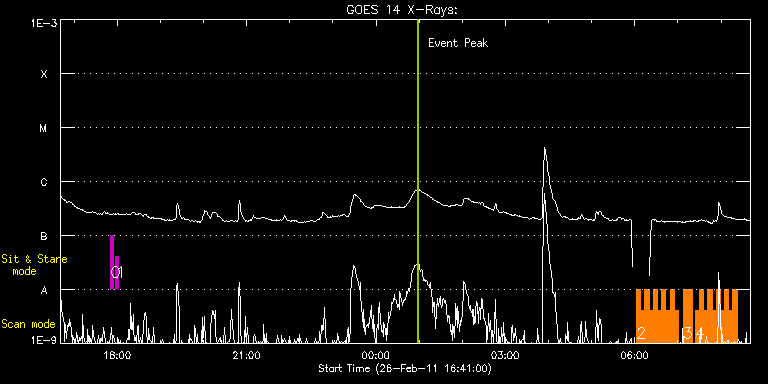 EIS Observation timeline overlay to GOES-Xray curve Code 1" 2" 40" 266" EIS Observations list for this event: STUDY ACRONYM ID DATE OBSERVED DESCRIPTION NOAA# TARGET 0 regcal071 | 21279 | 2011/02/26 17:51:12 | Dark exposures, CCD bottom rows (100s | | Engineering TIMELINE ID DATE OBSERVED FITS FILE XCEN (+W/-E) YCEN (+N/-S) DUR ----------------------------------------------------------------------------------------------------------------- 21279 | 2011/02/26 17:51:12.000 | eis_l0_20110226_175112.fits.gz | -1.25 | -1243.59 | 3m21s 1 regcal072 | 21280 | 2011/02/26 17:58:12 | Dark exposures, top CCD rows (100s exp | | Engineering TIMELINE ID DATE OBSERVED FITS FILE XCEN (+W/-E) YCEN (+N/-S) DUR ----------------------------------------------------------------------------------------------------------------- 21280 | 2011/02/26 17:58:12.000 | eis_l0_20110226_175812.fits.gz | -1.25 | -732.59 | 3m22s 2 HH_Flare_180x160_v2 | 21281 | 2011/02/27 06:02:26 | Fast Scan Flare Observations of AR 111 | 1164 | Flare TIMELINE ID DATE OBSERVED FITS FILE XCEN (+W/-E) YCEN (+N/-S) DUR ----------------------------------------------------------------------------------------------------------------- 21281 | 2011/02/27 06:02:26.000 | eis_l0_20110227_060226.fits.gz | -757.70 | 488.79 | 5m46s 21281 | 2011/02/27 06:08:15.000 | eis_l0_20110227_060815.fits.gz | -757.39 | 488.79 | 5m46s 21281 | 2011/02/27 06:14:04.000 | eis_l0_20110227_061404.fits.gz | -757.00 | 488.79 | 5m46s 21281 | 2011/02/27 06:19:53.000 | eis_l0_20110227_061953.fits.gz | -756.62 | 488.94 | 5m47s 21281 | 2011/02/27 06:25:43.000 | eis_l0_20110227_062543.fits.gz | -756.16 | 488.94 | 5m46s 21281 | 2011/02/27 06:31:32.000 | eis_l0_20110227_063132.fits.gz | -755.92 | 489.10 | 5m47s 21281 | 2011/02/27 06:37:22.000 | eis_l0_20110227_063722.fits.gz | -755.38 | 489.02 | 5m47s 21281 | 2011/02/27 06:43:11.000 | eis_l0_20110227_064311.fits.gz | -755.00 | 489.17 | 5m47s 21281 | 2011/02/27 06:49:01.000 | eis_l0_20110227_064901.fits.gz | -754.69 | 489.33 | 5m47s 21281 | 2011/02/27 06:54:51.000 | eis_l0_20110227_065451.fits.gz | -754.22 | 489.33 | 5m47s 3 HH_AR+FLR_RAS_N03 | 21294 | 2011/02/27 07:07:40 | Scan Flare Observations of AR 11164 | 1163 | Active Region TIMELINE ID DATE OBSERVED FITS FILE XCEN (+W/-E) YCEN (+N/-S) DUR ----------------------------------------------------------------------------------------------------------------- 21294 | 2011/02/27 07:07:40.000 | eis_l0_20110227_070740.fits.gz | -751.95 | 489.64 | 13m18s 4 HH_Flare_180x160_v2 | 21325 | 2011/02/27 07:24:13 | Fast Scan Flare Observations of AR 111 | 1164 | Flare TIMELINE ID DATE OBSERVED FITS FILE XCEN (+W/-E) YCEN (+N/-S) DUR ----------------------------------------------------------------------------------------------------------------- 21325 | 2011/02/27 07:24:13.000 | eis_l0_20110227_072413.fits.gz | -752.37 | 489.95 | 5m47s 21325 | 2011/02/27 07:30:02.000 | eis_l0_20110227_073002.fits.gz | -751.91 | 489.95 | 5m47s 21325 | 2011/02/27 07:35:52.000 | eis_l0_20110227_073552.fits.gz | -751.60 | 490.10 | 5m47s 21325 | 2011/02/27 07:41:41.000 | eis_l0_20110227_074141.fits.gz | -751.29 | 490.25 | 5m47s 21325 | 2011/02/27 07:47:31.000 | eis_l0_20110227_074731.fits.gz | -750.82 | 490.33 | 5m46s 21325 | 2011/02/27 07:53:20.000 | eis_l0_20110227_075320.fits.gz | -750.44 | 490.25 | 5m47s 21325 | 2011/02/27 07:59:09.000 | eis_l0_20110227_075909.fits.gz | -750.05 | 490.49 | 5m47s 21325 | 2011/02/27 08:04:59.000 | eis_l0_20110227_080459.fits.gz | -749.67 | 490.41 | 5m46s 21325 | 2011/02/27 08:10:48.000 | eis_l0_20110227_081048.fits.gz | -749.28 | 490.56 | 5m46s 21325 | 2011/02/27 08:16:37.000 | eis_l0_20110227_081637.fits.gz | -748.82 | 490.56 | 5m46s : Check study information : Download file : View thumbnails For this event, also check for:
