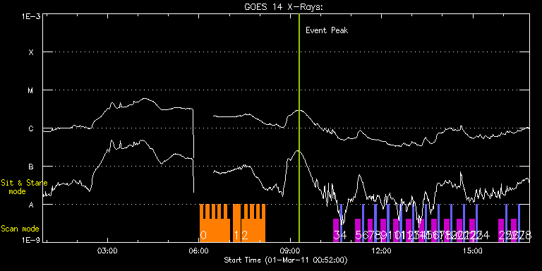 EIS Observation timeline overlay to GOES-Xray curve Code 1" 2" 40" 266" EIS Observations list for this event: STUDY ACRONYM ID DATE OBSERVED DESCRIPTION NOAA# TARGET 0 HH_Flare_180x160_v2 | 21289 | 2011/03/01 06:02:25 | Fast Scan Flare Observations of AR 111 | 1164 | Flare TIMELINE ID DATE OBSERVED FITS FILE XCEN (+W/-E) YCEN (+N/-S) DUR ----------------------------------------------------------------------------------------------------------------- 21289 | 2011/03/01 06:02:25.000 | eis_l0_20110301_060225.fits.gz | -501.16 | 525.56 | 5m46s 21289 | 2011/03/01 06:08:14.000 | eis_l0_20110301_060814.fits.gz | -500.54 | 525.40 | 5m46s 21289 | 2011/03/01 06:14:03.000 | eis_l0_20110301_061403.fits.gz | -499.92 | 525.48 | 5m46s 21289 | 2011/03/01 06:19:52.000 | eis_l0_20110301_061952.fits.gz | -499.31 | 525.48 | 5m46s 21289 | 2011/03/01 06:25:41.000 | eis_l0_20110301_062541.fits.gz | -498.61 | 525.56 | 5m47s 21289 | 2011/03/01 06:31:31.000 | eis_l0_20110301_063131.fits.gz | -497.92 | 525.48 | 5m47s 21289 | 2011/03/01 06:37:21.000 | eis_l0_20110301_063721.fits.gz | -497.30 | 525.56 | 5m46s 21289 | 2011/03/01 06:43:10.000 | eis_l0_20110301_064310.fits.gz | -496.68 | 525.71 | 5m47s 21289 | 2011/03/01 06:48:59.000 | eis_l0_20110301_064859.fits.gz | -495.98 | 525.71 | 5m47s 21289 | 2011/03/01 06:54:49.000 | eis_l0_20110301_065449.fits.gz | -495.37 | 525.86 | 5m46s 1 HH_AR+FLR_RAS_N03 | 21370 | 2011/03/01 07:07:39 | Scan Flare Observations of AR 11164 | 1164 | Active Region TIMELINE ID DATE OBSERVED FITS FILE XCEN (+W/-E) YCEN (+N/-S) DUR ----------------------------------------------------------------------------------------------------------------- 21370 | 2011/03/01 07:07:39.000 | eis_l0_20110301_070739.fits.gz | -492.48 | 525.94 | 13m18s 2 HH_Flare_180x160_v2 | 21371 | 2011/03/01 07:24:12 | Fast Scan Flare Observations of AR 111 | 1164 | Flare TIMELINE ID DATE OBSERVED FITS FILE XCEN (+W/-E) YCEN (+N/-S) DUR ----------------------------------------------------------------------------------------------------------------- 21371 | 2011/03/01 07:24:12.000 | eis_l0_20110301_072412.fits.gz | -492.20 | 526.25 | 5m46s 21371 | 2011/03/01 07:30:01.000 | eis_l0_20110301_073001.fits.gz | -491.50 | 526.25 | 5m47s 21371 | 2011/03/01 07:35:51.000 | eis_l0_20110301_073551.fits.gz | -490.81 | 526.33 | 5m47s 21371 | 2011/03/01 07:41:41.000 | eis_l0_20110301_074141.fits.gz | -490.19 | 526.25 | 5m46s 21371 | 2011/03/01 07:47:30.000 | eis_l0_20110301_074730.fits.gz | -489.57 | 526.41 | 5m47s 21371 | 2011/03/01 07:53:20.000 | eis_l0_20110301_075320.fits.gz | -488.88 | 526.48 | 5m46s 21371 | 2011/03/01 07:59:09.000 | eis_l0_20110301_075909.fits.gz | -488.26 | 526.48 | 5m47s 21371 | 2011/03/01 08:04:59.000 | eis_l0_20110301_080459.fits.gz | -487.57 | 526.48 | 4m58s 21371 | 2011/03/01 08:09:48.000 | eis_l0_20110301_080948.fits.gz | -487.02 | 526.56 | 57s 21371 | 2011/03/01 08:10:48.000 | eis_l0_20110301_081048.fits.gz | -486.95 | 526.56 | 8s 3 SK_DEEP_5x512_SLIT1 | 21374 | 2011/03/01 10:25:27 | HOP79 Irradiance scan | | Quiet Sun TIMELINE ID DATE OBSERVED FITS FILE XCEN (+W/-E) YCEN (+N/-S) DUR ----------------------------------------------------------------------------------------------------------------- 21374 | 2011/03/01 10:25:27.000 | eis_l0_20110301_102527.fits.gz | -0.10 | -945.55 | 10m8s 4 PRY_slot_contextLITE | 21375 | 2011/03/01 10:38:34 | HOP79 Irradiance scan | | Active Region TIMELINE ID DATE OBSERVED FITS FILE XCEN (+W/-E) YCEN (+N/-S) DUR ----------------------------------------------------------------------------------------------------------------- 21375 | 2011/03/01 10:38:34.000 | eis_l0_20110301_103834.fits.gz | -15.32 | -945.39 | 2m56s 5 SK_DEEP_5x512_SLIT1 | 21376 | 2011/03/01 11:08:20 | HOP79 Irradiance scan | | Quiet Sun TIMELINE ID DATE OBSERVED FITS FILE XCEN (+W/-E) YCEN (+N/-S) DUR ----------------------------------------------------------------------------------------------------------------- 21376 | 2011/03/01 11:08:20.000 | eis_l0_20110301_110820.fits.gz | -0.10 | -845.28 | 10m8s 6 PRY_slot_contextLITE | 21377 | 2011/03/01 11:21:34 | HOP79 Irradiance scan | | Active Region TIMELINE ID DATE OBSERVED FITS FILE XCEN (+W/-E) YCEN (+N/-S) DUR ----------------------------------------------------------------------------------------------------------------- 21377 | 2011/03/01 11:21:34.000 | eis_l0_20110301_112134.fits.gz | -15.25 | -845.28 | 2m56s 7 SK_DEEP_5x512_SLIT1 | 21378 | 2011/03/01 11:33:20 | HOP79 Irradiance scan | | Quiet Sun TIMELINE ID DATE OBSERVED FITS FILE XCEN (+W/-E) YCEN (+N/-S) DUR ----------------------------------------------------------------------------------------------------------------- 21378 | 2011/03/01 11:33:20.000 | eis_l0_20110301_113320.fits.gz | -0.10 | -745.01 | 8m6s 8 PRY_slot_contextLITE | 21379 | 2011/03/01 11:46:34 | HOP79 Irradiance scan | | Active Region TIMELINE ID DATE OBSERVED FITS FILE XCEN (+W/-E) YCEN (+N/-S) DUR ----------------------------------------------------------------------------------------------------------------- 21379 | 2011/03/01 11:46:34.000 | eis_l0_20110301_114634.fits.gz | -15.25 | -745.48 | 2m56s 9 SK_DEEP_5x512_SLIT1 | 21380 | 2011/03/01 11:58:20 | HOP79 Irradiance scan | | Quiet Sun TIMELINE ID DATE OBSERVED FITS FILE XCEN (+W/-E) YCEN (+N/-S) DUR ----------------------------------------------------------------------------------------------------------------- 21380 | 2011/03/01 11:58:20.000 | eis_l0_20110301_115820.fits.gz | -0.02 | -645.52 | 10m8s 10 PRY_slot_contextLITE | 21381 | 2011/03/01 12:11:34 | HOP79 Irradiance scan | | Active Region TIMELINE ID DATE OBSERVED FITS FILE XCEN (+W/-E) YCEN (+N/-S) DUR ----------------------------------------------------------------------------------------------------------------- 21381 | 2011/03/01 12:11:34.000 | eis_l0_20110301_121134.fits.gz | -15.32 | -645.59 | 2m56s 11 SK_DEEP_5x512_SLIT1 | 21382 | 2011/03/01 12:23:20 | HOP79 Irradiance scan | | Quiet Sun TIMELINE ID DATE OBSERVED FITS FILE 