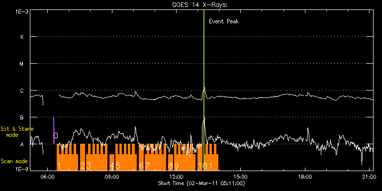 EIS Observation timeline overlay to GOES-Xray curve Code 1" 2" 40" 266" EIS Observations list for this event: STUDY ACRONYM ID DATE OBSERVED DESCRIPTION NOAA# TARGET 0 SYNOP005_A | 21416 | 2011/03/02 06:16:26 | synoptic | | Quiet Sun TIMELINE ID DATE OBSERVED FITS FILE XCEN (+W/-E) YCEN (+N/-S) DUR ----------------------------------------------------------------------------------------------------------------- 21416 | 2011/03/02 06:16:26.000 | eis_l0_20110302_061626.fits.gz | -19.60 | -0.42 | 1m31s 21416 | 2011/03/02 06:18:07.000 | eis_l0_20110302_061807.fits.gz | 0.06 | -0.50 | 1m31s 1 HH_Flare_180x160_v2 | 21429 | 2011/03/02 06:26:26 | Fast Scan Flare Observations of AR 111 | 1164 | Flare TIMELINE ID DATE OBSERVED FITS FILE XCEN (+W/-E) YCEN (+N/-S) DUR ----------------------------------------------------------------------------------------------------------------- 21429 | 2011/03/02 06:26:26.000 | eis_l0_20110302_062626.fits.gz | -304.72 | 518.99 | 5m47s 21429 | 2011/03/02 06:32:16.000 | eis_l0_20110302_063216.fits.gz | -303.95 | 518.99 | 5m46s 21429 | 2011/03/02 06:38:05.000 | eis_l0_20110302_063805.fits.gz | -303.17 | 518.99 | 5m47s 21429 | 2011/03/02 06:43:54.000 | eis_l0_20110302_064354.fits.gz | -302.48 | 518.91 | 5m47s 21429 | 2011/03/02 06:49:44.000 | eis_l0_20110302_064944.fits.gz | -301.71 | 518.99 | 5m46s 21429 | 2011/03/02 06:55:33.000 | eis_l0_20110302_065533.fits.gz | -300.93 | 518.91 | 5m46s 21429 | 2011/03/02 07:01:22.000 | eis_l0_20110302_070122.fits.gz | -300.24 | 519.15 | 5m47s 21429 | 2011/03/02 07:07:12.000 | eis_l0_20110302_070712.fits.gz | -299.47 | 519.15 | 5m46s 21429 | 2011/03/02 07:13:01.000 | eis_l0_20110302_071301.fits.gz | -298.69 | 519.15 | 5m47s 21429 | 2011/03/02 07:18:51.000 | eis_l0_20110302_071851.fits.gz | -298.00 | 519.22 | 5m46s 2 HH_AR+FLR_RAS_N03 | 21430 | 2011/03/02 07:31:13 | Scan Flare Observations of AR 11164 | 1164 | Active Region TIMELINE ID DATE OBSERVED FITS FILE XCEN (+W/-E) YCEN (+N/-S) DUR ----------------------------------------------------------------------------------------------------------------- 21430 | 2011/03/02 07:31:13.000 | eis_l0_20110302_073113.fits.gz | -294.88 | 519.22 | 13m19s 3 HH_Flare_180x160_v2 | 21431 | 2011/03/02 07:48:13 | Fast Scan Flare Observations of AR 111 | 1164 | Flare TIMELINE ID DATE OBSERVED FITS FILE XCEN (+W/-E) YCEN (+N/-S) DUR ----------------------------------------------------------------------------------------------------------------- 21431 | 2011/03/02 07:48:13.000 | eis_l0_20110302_074813.fits.gz | -294.21 | 519.38 | 5m47s 21431 | 2011/03/02 07:54:02.000 | eis_l0_20110302_075402.fits.gz | -293.36 | 519.38 | 5m47s 21431 | 2011/03/02 07:59:52.000 | eis_l0_20110302_075952.fits.gz | -292.75 | 519.45 | 5m46s 21431 | 2011/03/02 08:05:41.000 | eis_l0_20110302_080541.fits.gz | -291.90 | 519.53 | 5m46s 21431 | 2011/03/02 08:11:30.000 | eis_l0_20110302_081130.fits.gz | -291.12 | 519.53 | 5m47s 21431 | 2011/03/02 08:17:20.000 | eis_l0_20110302_081720.fits.gz | -290.35 | 519.45 | 5m47s 21431 | 2011/03/02 08:23:09.000 | eis_l0_20110302_082309.fits.gz | -289.66 | 519.68 | 5m47s 21431 | 2011/03/02 08:28:59.000 | eis_l0_20110302_082859.fits.gz | -288.88 | 519.53 | 5m47s 21431 | 2011/03/02 08:34:49.000 | eis_l0_20110302_083449.fits.gz | -288.11 | 519.61 | 5m46s 21431 | 2011/03/02 08:40:38.000 | eis_l0_20110302_084038.fits.gz | -287.42 | 519.61 | 5m47s 4 HH_AR+FLR_RAS_N03 | 21432 | 2011/03/02 08:53:14 | Scan Flare Observations of AR 11164 | 1164 | Active Region TIMELINE ID DATE OBSERVED FITS FILE XCEN (+W/-E) YCEN (+N/-S) DUR ----------------------------------------------------------------------------------------------------------------- 21432 | 2011/03/02 08:53:14.000 | eis_l0_20110302_085314.fits.gz | -284.30 | 519.76 | 13m18s 5 HH_Flare_180x160_v2 | 21433 | 2011/03/02 09:10:14 | Fast Scan Flare Observations of AR 111 | 1164 | Flare TIMELINE ID DATE OBSERVED FITS FILE XCEN (+W/-E) YCEN (+N/-S) DUR ----------------------------------------------------------------------------------------------------------------- 21433 | 2011/03/02 09:10:14.000 | eis_l0_20110302_091014.fits.gz | -283.48 | 519.84 | 5m46s 21433 | 2011/03/02 09:16:03.000 | eis_l0_20110302_091603.fits.gz | -282.86 | 519.92 | 5m47s 21433 | 2011/03/02 09:21:52.000 | eis_l0_20110302_092152.fits.gz | -282.01 | 519.92 | 5m47s 21433 | 2011/03/02 09:27:42.000 | eis_l0_20110302_092742.fits.gz | -281.31 | 520.07 | 5m46s 21433 | 2011/03/02 09:33:31.000 | eis_l0_20110302_093331.fits.gz | -280.54 | 520.23 | 5m47s 21433 | 2011/03/02 09:39:21.000 | eis_l0_20110302_093921.fits.gz | -279.77 | 520.07 | 5m47s 21433 | 2011/03/02 09:45:11.000 | eis_l0_20110302_094511.fits.gz | -279.00 | 520.07 | 5m46s 21433 | 2011/03/02 09:51:00.000 | eis_l0_20110302_095100.fits.gz | -278.15 | 520.15 | 5m46s 21433 | 2011/03/02 09:56:49.000 | eis_l0_20110302_095649.fits.gz | -277.53 | 520.15 | 5m46s 21433 | 2011/03/02 10:02:38.000 | eis_l0_20110302_100238.fits.gz | -276.76 | 520.15 | 5m46s 6 HH_AR+FLR_RAS_N03 | 21434 | 2011/03/02 10:15:14 | Scan Flare Observations of AR 11164 | 1164 | Active Region TIMELINE ID DATE OBSERVED FITS FILE XCEN (+W/-E) YCEN (+N/-S) DUR ----------------------------------------------------------------------------------------------------------------- 21434 | 2011/03/02 10:15:14.000 | eis_l0_20110302_101514.fits.gz | -273.64 | 520.15 | 13m19s 7 HH_Flare_180x160_v2 | 21435 | 2011/03/02 10:32:14 | Fast Scan Flare Observations of AR 111 | 1164 | Flare TIMELINE ID DATE OBSERVED FITS FILE XCEN (+W/-E) YCEN (+N/-S) DUR ----------------------------------------------------------------------------------------------------------------- 21435 | 2011/03/02 10:32:14.000 | eis_l0_20110302_103214.fits.gz | -272.89 | 520.23 | 5m47s 21435 | 2011/03/02 10:38:03.000 | eis_l0_20110302_103803.fits.gz | -272.20 | 520.38 | 5m47s 21435 | 2011/03/02 10:43:53.000 | eis_l0_20110302_104353.fits.gz | -271.35 | 520.38 | 5m47s 21435 | 2011/03/02 10:49:43.000 | eis_l0_20110302_104943.fits.gz | -