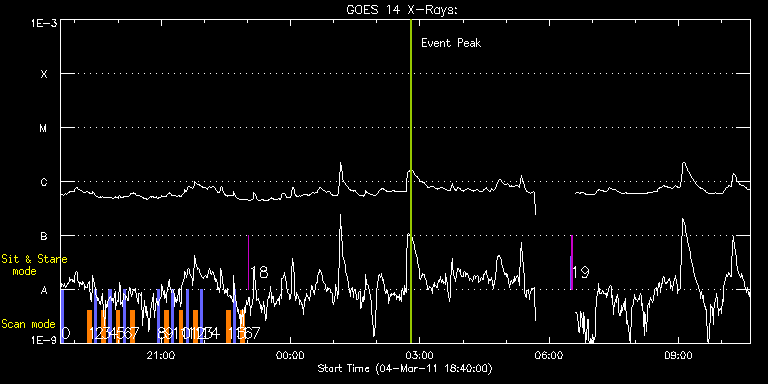 EIS Observation timeline overlay to GOES-Xray curve Code 1" 2" 40" 266" EIS Observations list for this event: STUDY ACRONYM ID DATE OBSERVED DESCRIPTION NOAA# TARGET 0 PRY_slot_contextLITE | 21483 | 2011/03/04 18:40:49 | HOP79 Irradiance scan | | Active Region TIMELINE ID DATE OBSERVED FITS FILE XCEN (+W/-E) YCEN (+N/-S) DUR ----------------------------------------------------------------------------------------------------------------- 21483 | 2011/03/04 18:40:49.000 | eis_l0_20110304_184049.fits.gz | -318.98 | -0.50 | 2m57s 1 SK_DEEP_10x512_SLIT2 | 21484 | 2011/03/04 19:17:33 | HOP79 Irradiance scan | | Quiet Sun TIMELINE ID DATE OBSERVED FITS FILE XCEN (+W/-E) YCEN (+N/-S) DUR ----------------------------------------------------------------------------------------------------------------- 21484 | 2011/03/04 19:17:33.000 | eis_l0_20110304_191733.fits.gz | -104.48 | -0.50 | 5m8s 2 PRY_slot_contextLITE | 21485 | 2011/03/04 19:27:19 | HOP79 Irradiance scan | | Active Region TIMELINE ID DATE OBSERVED FITS FILE XCEN (+W/-E) YCEN (+N/-S) DUR ----------------------------------------------------------------------------------------------------------------- 21485 | 2011/03/04 19:27:19.000 | eis_l0_20110304_192719.fits.gz | 78.76 | -0.42 | 2m57s 3 SK_DEEP_10x512_SLIT2 | 21486 | 2011/03/04 19:37:33 | HOP79 Irradiance scan | | Quiet Sun TIMELINE ID DATE OBSERVED FITS FILE XCEN (+W/-E) YCEN (+N/-S) DUR ----------------------------------------------------------------------------------------------------------------- 21486 | 2011/03/04 19:37:33.000 | eis_l0_20110304_193733.fits.gz | 292.49 | -0.42 | 5m8s 4 PRY_slot_contextLITE | 21487 | 2011/03/04 19:47:19 | HOP79 Irradiance scan | 1165 | Active Region TIMELINE ID DATE OBSERVED FITS FILE XCEN (+W/-E) YCEN (+N/-S) DUR ----------------------------------------------------------------------------------------------------------------- 21487 | 2011/03/04 19:47:19.000 | eis_l0_20110304_194719.fits.gz | 476.90 | -0.42 | 2m57s 5 SK_DEEP_10x512_SLIT2 | 21488 | 2011/03/04 19:57:33 | HOP79 Irradiance scan | | Quiet Sun TIMELINE ID DATE OBSERVED FITS FILE XCEN (+W/-E) YCEN (+N/-S) DUR ----------------------------------------------------------------------------------------------------------------- 21488 | 2011/03/04 19:57:33.000 | eis_l0_20110304_195733.fits.gz | 690.40 | -0.42 | 5m8s 6 PRY_slot_contextLITE | 21489 | 2011/03/04 20:07:20 | HOP79 Irradiance scan | | Active Region TIMELINE ID DATE OBSERVED FITS FILE XCEN (+W/-E) YCEN (+N/-S) DUR ----------------------------------------------------------------------------------------------------------------- 21489 | 2011/03/04 20:07:20.000 | eis_l0_20110304_200720.fits.gz | 874.72 | -0.50 | 2m56s 7 SK_DEEP_10x512_SLIT2 | 21490 | 2011/03/04 20:17:33 | HOP79 Irradiance scan | | Quiet Sun TIMELINE ID DATE OBSERVED FITS FILE XCEN (+W/-E) YCEN (+N/-S) DUR ----------------------------------------------------------------------------------------------------------------- 21490 | 2011/03/04 20:17:33.000 | eis_l0_20110304_201733.fits.gz | -9869.98 | -9963.20 | 5m7s 8 PRY_slot_contextLITE | 21491 | 2011/03/04 20:54:49 | HOP79 Irradiance scan | 1166 | Active Region TIMELINE ID DATE OBSERVED FITS FILE XCEN (+W/-E) YCEN (+N/-S) DUR ----------------------------------------------------------------------------------------------------------------- 21491 | 2011/03/04 20:54:49.000 | eis_l0_20110304_205449.fits.gz | -735.19 | 323.63 | 2m56s 9 SK_DEEP_10x512_SLIT2 | 21492 | 2011/03/04 21:05:03 | HOP79 Irradiance scan | | Quiet Sun TIMELINE ID DATE OBSERVED FITS FILE XCEN (+W/-E) YCEN (+N/-S) DUR ----------------------------------------------------------------------------------------------------------------- 21492 | 2011/03/04 21:05:03.000 | eis_l0_20110304_210503.fits.gz | -534.29 | 345.49 | 5m8s 10 PRY_slot_contextLITE | 21493 | 2011/03/04 21:14:50 | HOP79 Irradiance scan | 1167 | Active Region TIMELINE ID DATE OBSERVED FITS FILE XCEN (+W/-E) YCEN (+N/-S) DUR ----------------------------------------------------------------------------------------------------------------- 21493 | 2011/03/04 21:14:50.000 | eis_l0_20110304_211450.fits.gz | -361.16 | 358.47 | 2m56s 11 SK_DEEP_10x512_SLIT2 | 21494 | 2011/03/04 21:25:03 | HOP79 Irradiance scan | | Quiet Sun TIMELINE ID DATE OBSERVED FITS FILE XCEN (+W/-E) YCEN (+N/-S) DUR ----------------------------------------------------------------------------------------------------------------- 21494 | 2011/03/04 21:25:03.000 | eis_l0_20110304_212503.fits.gz | -155.62 | 365.65 | 5m8s 12 PRY_slot_contextLITE | 21495 | 2011/03/04 21:34:49 | HOP79 Irradiance scan | 1164 | Active Region TIMELINE ID DATE OBSERVED FITS FILE XCEN (+W/-E) YCEN (+N/-S) DUR ----------------------------------------------------------------------------------------------------------------- 21495 | 2011/03/04 21:34:49.000 | eis_l0_20110304_213449.fits.gz | 23.69 | 366.27 | 2m57s 13 SK_DEEP_10x512_SLIT2 | 21496 | 2011/03/04 21:45:03 | HOP79 Irradiance scan | | Quiet Sun TIMELINE ID DATE OBSERVED FITS FILE XCEN (+W/-E) YCEN (+N/-S) DUR ----------------------------------------------------------------------------------------------------------------- 21496 | 2011/03/04 21:45:03.000 | eis_l0_20110304_214503.fits.gz | 154.61 | 365.58 | 5m8s 14 PRY_slot_contextLITE | 21497 | 2011/03/04 21:54:49 | HOP79 Irradiance scan | 1164 | Active Region TIMELINE ID DATE OBSERVED FITS FILE XCEN (+W/-E) YCEN (+N/-S) DUR ----------------------------------------------------------------------------------------------------------------- 21497 | 2011/03/04 21:54:49.000 | eis_l0_20110304_215449.fits.gz | 330.75 | 358.47 | 2m57s 15 SK_DEEP_10x512_SLIT2 | 21498 | 2011/03/04 22:31:03 | HOP79 Irradiance scan | | Quiet Sun TIMELINE ID DATE OBSERVED FITS FILE XCEN (+W/-E) YCEN (+N/-S) DUR ----------------------------------------------------------------------------------------------------------------- 21498 | 2011/03/04 22:31:03.000 | eis_l0_20110304_223103.fits.gz | 533.43 | 