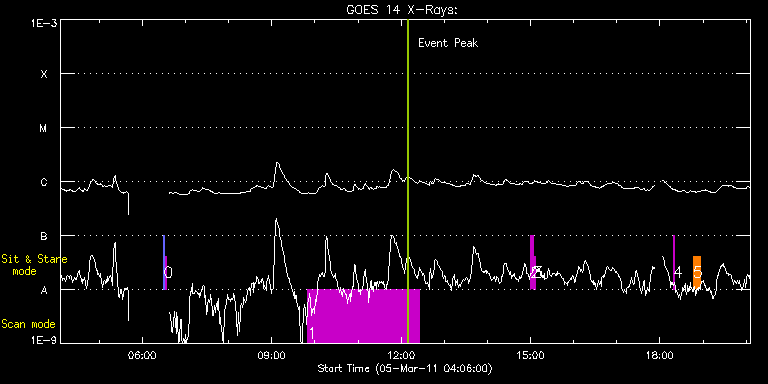 EIS Observation timeline overlay to GOES-Xray curve Code 1" 2" 40" 266" EIS Observations list for this event: STUDY ACRONYM ID DATE OBSERVED DESCRIPTION NOAA# TARGET 0 SYNOP005_A | 21502 | 2011/03/05 06:29:49 | synoptic | | Quiet Sun TIMELINE ID DATE OBSERVED FITS FILE XCEN (+W/-E) YCEN (+N/-S) DUR ----------------------------------------------------------------------------------------------------------------- 21502 | 2011/03/05 06:29:49.000 | eis_l0_20110305_062949.fits.gz | -19.68 | -0.58 | 1m30s 21502 | 2011/03/05 06:31:30.000 | eis_l0_20110305_063130.fits.gz | -0.02 | -0.58 | 1m30s 1 HPW015_DETAILED_MAP | 21511 | 2011/03/05 09:50:14 | Active Region Stereo/Cluster Quadratur | 1164 | Active Region TIMELINE ID DATE OBSERVED FITS FILE XCEN (+W/-E) YCEN (+N/-S) DUR ----------------------------------------------------------------------------------------------------------------- 21511 | 2011/03/05 09:50:14.000 | eis_l0_20110305_095014.fits.gz | 329.27 | 546.95 | 2h35m34s 2 regcal071 | 21583 | 2011/03/05 15:00:12 | Dark exposures, CCD bottom rows (100s | | Engineering TIMELINE ID DATE OBSERVED FITS FILE XCEN (+W/-E) YCEN (+N/-S) DUR ----------------------------------------------------------------------------------------------------------------- 21583 | 2011/03/05 15:00:12.000 | eis_l0_20110305_150012.fits.gz | 392.72 | 201.55 | 3m22s 3 regcal072 | 21584 | 2011/03/05 15:04:01 | Dark exposures, top CCD rows (100s exp | | Engineering TIMELINE ID DATE OBSERVED FITS FILE XCEN (+W/-E) YCEN (+N/-S) DUR ----------------------------------------------------------------------------------------------------------------- 21584 | 2011/03/05 15:04:01.000 | eis_l0_20110305_150401.fits.gz | 393.26 | 712.55 | 3m22s 4 SYNOP005_A | 21505 | 2011/03/05 18:18:15 | synoptic | | Quiet Sun TIMELINE ID DATE OBSERVED FITS FILE XCEN (+W/-E) YCEN (+N/-S) DUR ----------------------------------------------------------------------------------------------------------------- 21505 | 2011/03/05 18:18:15.000 | eis_l0_20110305_181815.fits.gz | -0.10 | -0.50 | 1m30s 5 EL_WHI_CH_limb | 21512 | 2011/03/05 18:46:31 | Ultra deep exposure coronal hole | | Coronal Hole TIMELINE ID DATE OBSERVED FITS FILE XCEN (+W/-E) YCEN (+N/-S) DUR ----------------------------------------------------------------------------------------------------------------- 21512 | 2011/03/05 18:46:31.000 | eis_l0_20110305_184631.fits.gz | -0.62 | -842.67 | 10m : Check study information : Download file : View thumbnails For this event, also check for: