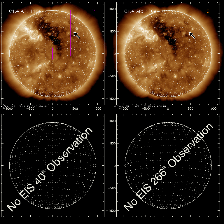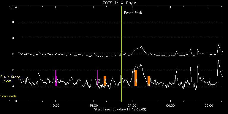 EIS Observation timeline overlay to GOES-Xray curve Code 1" 2" 40" 266" EIS Observations list for this event: STUDY ACRONYM ID DATE OBSERVED DESCRIPTION NOAA# TARGET 0 regcal071 | 21583 | 2011/03/05 15:00:12 | Dark exposures, CCD bottom rows (100s | | Engineering TIMELINE ID DATE OBSERVED FITS FILE XCEN (+W/-E) YCEN (+N/-S) DUR ----------------------------------------------------------------------------------------------------------------- 21583 | 2011/03/05 15:00:12.000 | eis_l0_20110305_150012.fits.gz | 392.72 | 201.55 | 3m22s 1 regcal072 | 21584 | 2011/03/05 15:04:01 | Dark exposures, top CCD rows (100s exp | | Engineering TIMELINE ID DATE OBSERVED FITS FILE XCEN (+W/-E) YCEN (+N/-S) DUR ----------------------------------------------------------------------------------------------------------------- 21584 | 2011/03/05 15:04:01.000 | eis_l0_20110305_150401.fits.gz | 393.26 | 712.55 | 3m22s 2 SYNOP005_A | 21505 | 2011/03/05 18:18:15 | synoptic | | Quiet Sun TIMELINE ID DATE OBSERVED FITS FILE XCEN (+W/-E) YCEN (+N/-S) DUR ----------------------------------------------------------------------------------------------------------------- 21505 | 2011/03/05 18:18:15.000 | eis_l0_20110305_181815.fits.gz | -0.10 | -0.50 | 1m30s 3 EL_WHI_CH_limb | 21512 | 2011/03/05 18:46:31 | Ultra deep exposure coronal hole | | Coronal Hole TIMELINE ID DATE OBSERVED FITS FILE XCEN (+W/-E) YCEN (+N/-S) DUR ----------------------------------------------------------------------------------------------------------------- 21512 | 2011/03/05 18:46:31.000 | eis_l0_20110305_184631.fits.gz | -0.62 | -842.67 | 10m 4 EL_WHI_CH_limb | 21513 | 2011/03/05 21:11:56 | Ultra deep exposure coronal hole | | Coronal Hole TIMELINE ID DATE OBSERVED FITS FILE XCEN (+W/-E) YCEN (+N/-S) DUR ----------------------------------------------------------------------------------------------------------------- 21513 | 2011/03/05 21:11:56.000 | eis_l0_20110305_211156.fits.gz | -0.62 | -1242.59 | 10m 21513 | 2011/03/05 22:12:58.000 | eis_l0_20110305_221258.fits.gz | -0.54 | -1242.75 | 10m1s : Check study information : Download file : View thumbnails For this event, also check for: