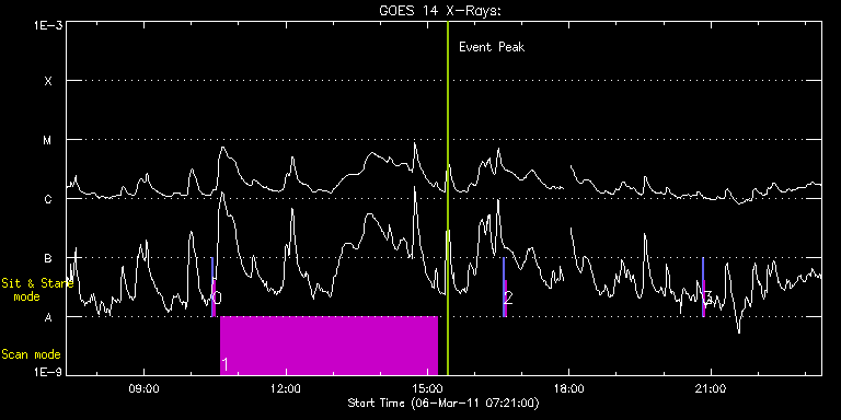 EIS Observation timeline overlay to GOES-Xray curve Code 1" 2" 40" 266" EIS Observations list for this event: STUDY ACRONYM ID DATE OBSERVED DESCRIPTION NOAA# TARGET 0 SYNOP005_A | 21506 | 2011/03/06 10:26:20 | synoptic | | Quiet Sun TIMELINE ID DATE OBSERVED FITS FILE XCEN (+W/-E) YCEN (+N/-S) DUR ----------------------------------------------------------------------------------------------------------------- 21506 | 2011/03/06 10:26:20.000 | eis_l0_20110306_102620.fits.gz | -19.44 | -0.27 | 1m30s 21506 | 2011/03/06 10:28:01.000 | eis_l0_20110306_102801.fits.gz | -0.10 | -0.35 | 1m30s 1 SK_CH_DIAG_320x384 | 21514 | 2011/03/06 10:36:40 | HOP 81 | | Coronal Hole TIMELINE ID DATE OBSERVED FITS FILE XCEN (+W/-E) YCEN (+N/-S) DUR ----------------------------------------------------------------------------------------------------------------- 21514 | 2011/03/06 10:36:40.000 | eis_l0_20110306_103640.fits.gz | 0.15 | -940.45 | 4h35m37s 2 SYNOP005_A | 21507 | 2011/03/06 16:36:33 | synoptic | | Quiet Sun TIMELINE ID DATE OBSERVED FITS FILE XCEN (+W/-E) YCEN (+N/-S) DUR ----------------------------------------------------------------------------------------------------------------- 21507 | 2011/03/06 16:36:33.000 | eis_l0_20110306_163633.fits.gz | -19.52 | -0.27 | 1m31s 21507 | 2011/03/06 16:38:14.000 | eis_l0_20110306_163814.fits.gz | -0.10 | -0.35 | 1m31s 3 SYNOP005_A | 21508 | 2011/03/06 20:49:33 | synoptic | | Quiet Sun TIMELINE ID DATE OBSERVED FITS FILE XCEN (+W/-E) YCEN (+N/-S) DUR ----------------------------------------------------------------------------------------------------------------- 21508 | 2011/03/06 20:49:33.000 | eis_l0_20110306_204933.fits.gz | -19.60 | -0.58 | 1m30s 21508 | 2011/03/06 20:51:14.000 | eis_l0_20110306_205114.fits.gz | -0.10 | -0.58 | 1m31s : Check study information : Download file : View thumbnails For this event, also check for: