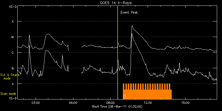 EIS Observation timeline overlay to GOES-Xray curve Code 1" 2" 40" 266" EIS Observations list for this event: STUDY ACRONYM ID DATE OBSERVED DESCRIPTION NOAA# TARGET 0 HH_Flare_180x160_v2 | 21615 | 2011/03/08 10:00:13 | Flare watch AR 11164 | 1164 | Flare TIMELINE ID DATE OBSERVED FITS FILE XCEN (+W/-E) YCEN (+N/-S) DUR ----------------------------------------------------------------------------------------------------------------- 21615 | 2011/03/08 10:00:13.000 | eis_l0_20110308_100013.fits.gz | 787.97 | 470.85 | 5m47s 21615 | 2011/03/08 10:06:03.000 | eis_l0_20110308_100603.fits.gz | 788.28 | 470.85 | 5m47s 21615 | 2011/03/08 10:11:53.000 | eis_l0_20110308_101153.fits.gz | 788.82 | 470.54 | 5m46s 21615 | 2011/03/08 10:17:42.000 | eis_l0_20110308_101742.fits.gz | 789.21 | 470.39 | 5m47s 21615 | 2011/03/08 10:23:32.000 | eis_l0_20110308_102332.fits.gz | 789.44 | 470.46 | 5m46s 21615 | 2011/03/08 10:29:21.000 | eis_l0_20110308_102921.fits.gz | 789.83 | 470.39 | 5m46s 21615 | 2011/03/08 10:35:10.000 | eis_l0_20110308_103510.fits.gz | 790.21 | 470.23 | 5m46s 21615 | 2011/03/08 10:40:59.000 | eis_l0_20110308_104059.fits.gz | 790.60 | 470.15 | 5m46s 21615 | 2011/03/08 10:46:48.000 | eis_l0_20110308_104648.fits.gz | 790.98 | 470.08 | 5m46s 21615 | 2011/03/08 10:52:37.000 | eis_l0_20110308_105237.fits.gz | 791.45 | 469.77 | 5m46s 21615 | 2011/03/08 10:58:26.000 | eis_l0_20110308_105826.fits.gz | 791.76 | 469.92 | 5m47s 21615 | 2011/03/08 11:04:16.000 | eis_l0_20110308_110416.fits.gz | 792.14 | 469.77 | 5m46s 21615 | 2011/03/08 11:10:05.000 | eis_l0_20110308_111005.fits.gz | 792.53 | 469.54 | 5m47s 21615 | 2011/03/08 11:15:55.000 | eis_l0_20110308_111555.fits.gz | 792.92 | 469.61 | 5m46s 21615 | 2011/03/08 11:21:44.000 | eis_l0_20110308_112144.fits.gz | 793.22 | 469.54 | 5m47s 21615 | 2011/03/08 11:27:34.000 | eis_l0_20110308_112734.fits.gz | 793.61 | 469.38 | 5m46s 21615 | 2011/03/08 11:33:23.000 | eis_l0_20110308_113323.fits.gz | 793.92 | 469.46 | 5m46s 21615 | 2011/03/08 11:39:12.000 | eis_l0_20110308_113912.fits.gz | 794.31 | 469.31 | 5m46s 21615 | 2011/03/08 11:45:01.000 | eis_l0_20110308_114501.fits.gz | 794.69 | 469.15 | 5m46s 21615 | 2011/03/08 11:50:50.000 | eis_l0_20110308_115050.fits.gz | 795.08 | 469.00 | 5m46s 21615 | 2011/03/08 11:56:39.000 | eis_l0_20110308_115639.fits.gz | 795.47 | 469.00 | 5m46s 21615 | 2011/03/08 12:02:28.000 | eis_l0_20110308_120228.fits.gz | 795.85 | 468.77 | 5m46s 21615 | 2011/03/08 12:08:17.000 | eis_l0_20110308_120817.fits.gz | 796.24 | 468.69 | 5m46s 21615 | 2011/03/08 12:14:06.000 | eis_l0_20110308_121406.fits.gz | 796.39 | 468.77 | 5m47s 21615 | 2011/03/08 12:19:56.000 | eis_l0_20110308_121956.fits.gz | 796.93 | 468.61 | 5m47s 21615 | 2011/03/08 12:25:46.000 | eis_l0_20110308_122546.fits.gz | 797.32 | 468.38 | 5m47s 21615 | 2011/03/08 12:31:35.000 | eis_l0_20110308_123135.fits.gz | 797.63 | 468.46 | 5m47s 21615 | 2011/03/08 12:37:25.000 | eis_l0_20110308_123725.fits.gz | 798.02 | 468.38 | 5m47s 21615 | 2011/03/08 12:43:15.000 | eis_l0_20110308_124315.fits.gz | 798.32 | 468.07 | 5m46s 21615 | 2011/03/08 12:49:04.000 | eis_l0_20110308_124904.fits.gz | 798.79 | 468.15 | 5m47s 21615 | 2011/03/08 12:54:54.000 | eis_l0_20110308_125454.fits.gz | 799.17 | 467.84 | 5m46s 21615 | 2011/03/08 13:00:42.000 | eis_l0_20110308_130042.fits.gz | 799.56 | 467.92 | 5m47s 21615 | 2011/03/08 13:06:31.000 | eis_l0_20110308_130631.fits.gz | 799.87 | 467.92 | 5m47s 21615 | 2011/03/08 13:12:20.000 | eis_l0_20110308_131220.fits.gz | 800.26 | 467.68 | 5m47s 21615 | 2011/03/08 13:18:09.000 | eis_l0_20110308_131809.fits.gz | 800.56 | 467.68 | 5m47s 21615 | 2011/03/08 13:23:59.000 | eis_l0_20110308_132359.fits.gz | 800.95 | 467.61 | 5m46s 21615 | 2011/03/08 13:29:48.000 | eis_l0_20110308_132948.fits.gz | 801.34 | 467.45 | 5m47s 21615 | 2011/03/08 13:35:38.000 | eis_l0_20110308_133538.fits.gz | 801.72 | 467.22 | 5m47s 21615 | 2011/03/08 13:41:28.000 | eis_l0_20110308_134128.fits.gz | 802.03 | 467.14 | 5m46s 21615 | 2011/03/08 13:47:17.000 | eis_l0_20110308_134717.fits.gz | 802.42 | 467.14 | 5m46s : Check study information : Download file : View thumbnails For this event, also check for: