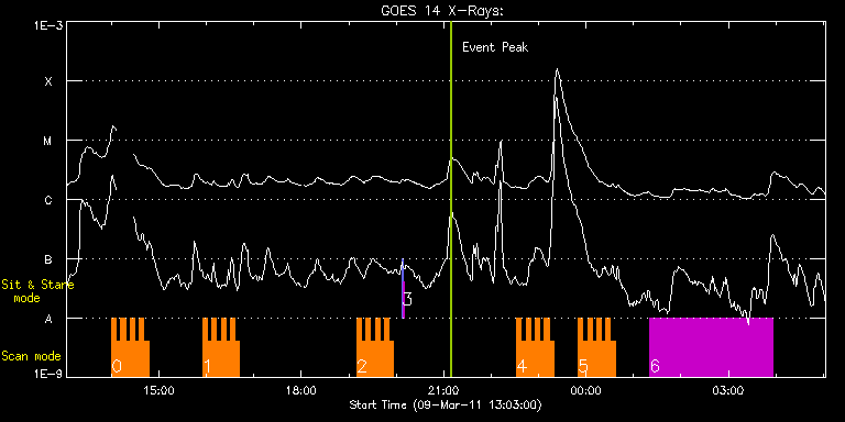 EIS Observation timeline overlay to GOES-Xray curve Code 1" 2" 40" 266" EIS Observations list for this event: STUDY ACRONYM ID DATE OBSERVED DESCRIPTION NOAA# TARGET 0 HH_Flare_180x160_v2 | 21625 | 2011/03/09 14:00:13 | Flare watch AR 11164 | 1164 | Flare TIMELINE ID DATE OBSERVED FITS FILE XCEN (+W/-E) YCEN (+N/-S) DUR ----------------------------------------------------------------------------------------------------------------- 21625 | 2011/03/09 14:00:13.000 | eis_l0_20110309_140013.fits.gz | 872.17 | 413.57 | 5m46s 21625 | 2011/03/09 14:06:02.000 | eis_l0_20110309_140602.fits.gz | 872.17 | 413.49 | 5m46s 21625 | 2011/03/09 14:11:51.000 | eis_l0_20110309_141151.fits.gz | 872.17 | 413.49 | 5m46s 21625 | 2011/03/09 14:17:40.000 | eis_l0_20110309_141740.fits.gz | 872.25 | 413.49 | 5m47s 21625 | 2011/03/09 14:23:29.000 | eis_l0_20110309_142329.fits.gz | 872.09 | 413.49 | 5m47s 21625 | 2011/03/09 14:29:19.000 | eis_l0_20110309_142919.fits.gz | 872.25 | 413.49 | 5m46s 21625 | 2011/03/09 14:35:08.000 | eis_l0_20110309_143508.fits.gz | 872.17 | 413.41 | 5m47s 21625 | 2011/03/09 14:40:57.000 | eis_l0_20110309_144057.fits.gz | 872.17 | 413.49 | 5m47s 1 HH_Flare_180x160_v2 | 21626 | 2011/03/09 15:55:13 | Flare watch AR 11164 | 1164 | Flare TIMELINE ID DATE OBSERVED FITS FILE XCEN (+W/-E) YCEN (+N/-S) DUR ----------------------------------------------------------------------------------------------------------------- 21626 | 2011/03/09 15:55:13.000 | eis_l0_20110309_155513.fits.gz | 872.17 | 413.33 | 5m46s 21626 | 2011/03/09 16:01:02.000 | eis_l0_20110309_160102.fits.gz | 872.25 | 413.41 | 5m46s 21626 | 2011/03/09 16:06:51.000 | eis_l0_20110309_160651.fits.gz | 872.09 | 413.49 | 5m47s 21626 | 2011/03/09 16:12:40.000 | eis_l0_20110309_161240.fits.gz | 872.25 | 413.41 | 5m47s 21626 | 2011/03/09 16:18:30.000 | eis_l0_20110309_161830.fits.gz | 872.17 | 413.49 | 5m46s 21626 | 2011/03/09 16:24:19.000 | eis_l0_20110309_162419.fits.gz | 872.17 | 413.49 | 5m47s 21626 | 2011/03/09 16:30:08.000 | eis_l0_20110309_163008.fits.gz | 872.17 | 413.57 | 5m47s 21626 | 2011/03/09 16:35:58.000 | eis_l0_20110309_163558.fits.gz | 872.17 | 413.57 | 5m47s 2 HH_Flare_180x160_v2 | 21627 | 2011/03/09 19:10:12 | Flare watch AR 11164 | 1164 | Flare TIMELINE ID DATE OBSERVED FITS FILE XCEN (+W/-E) YCEN (+N/-S) DUR ----------------------------------------------------------------------------------------------------------------- 21627 | 2011/03/09 19:10:12.000 | eis_l0_20110309_191012.fits.gz | 872.17 | 413.49 | 5m47s 21627 | 2011/03/09 19:16:02.000 | eis_l0_20110309_191602.fits.gz | 872.25 | 413.33 | 5m47s 21627 | 2011/03/09 19:21:51.000 | eis_l0_20110309_192151.fits.gz | 872.17 | 413.49 | 5m47s 21627 | 2011/03/09 19:27:41.000 | eis_l0_20110309_192741.fits.gz | 872.25 | 413.33 | 5m47s 21627 | 2011/03/09 19:33:31.000 | eis_l0_20110309_193331.fits.gz | 872.17 | 413.49 | 5m46s 21627 | 2011/03/09 19:39:20.000 | eis_l0_20110309_193920.fits.gz | 872.25 | 413.41 | 5m46s 21627 | 2011/03/09 19:45:09.000 | eis_l0_20110309_194509.fits.gz | 872.17 | 413.49 | 5m46s 21627 | 2011/03/09 19:50:58.000 | eis_l0_20110309_195058.fits.gz | 872.25 | 413.49 | 5m46s 3 SYNOP005_A | 21591 | 2011/03/09 20:07:19 | synoptic | | Quiet Sun TIMELINE ID DATE OBSERVED FITS FILE XCEN (+W/-E) YCEN (+N/-S) DUR ----------------------------------------------------------------------------------------------------------------- 21591 | 2011/03/09 20:07:19.000 | eis_l0_20110309_200719.fits.gz | -19.60 | -0.58 | 1m30s 21591 | 2011/03/09 20:09:00.000 | eis_l0_20110309_200900.fits.gz | -0.02 | -0.65 | 1m30s 4 HH_Flare_180x160_v2 | 21628 | 2011/03/09 22:32:26 | Flare watch AR 11164 | 1164 | Flare TIMELINE ID DATE OBSERVED FITS FILE XCEN (+W/-E) YCEN (+N/-S) DUR ----------------------------------------------------------------------------------------------------------------- 21628 | 2011/03/09 22:32:26.000 | eis_l0_20110309_223226.fits.gz | 872.25 | 413.41 | 5m46s 21628 | 2011/03/09 22:38:15.000 | eis_l0_20110309_223815.fits.gz | 872.17 | 413.33 | 5m46s 21628 | 2011/03/09 22:44:04.000 | eis_l0_20110309_224404.fits.gz | 872.17 | 413.49 | 5m46s 21628 | 2011/03/09 22:49:53.000 | eis_l0_20110309_224953.fits.gz | 872.17 | 413.49 | 5m45s 21628 | 2011/03/09 22:55:41.000 | eis_l0_20110309_225541.fits.gz | 872.09 | 413.41 | 5m46s 21628 | 2011/03/09 23:01:30.000 | eis_l0_20110309_230130.fits.gz | 872.25 | 413.49 | 5m46s 21628 | 2011/03/09 23:07:19.000 | eis_l0_20110309_230719.fits.gz | 872.17 | 413.57 | 5m47s 21628 | 2011/03/09 23:13:08.000 | eis_l0_20110309_231308.fits.gz | 872.17 | 413.41 | 5m47s 5 HH_Flare_180x160_v2 | 21629 | 2011/03/09 23:50:12 | Flare watch AR 11164 | 1164 | Flare TIMELINE ID DATE OBSERVED FITS FILE XCEN (+W/-E) YCEN (+N/-S) DUR ----------------------------------------------------------------------------------------------------------------- 21629 | 2011/03/09 23:50:12.000 | eis_l0_20110309_235012.fits.gz | 872.25 | 413.57 | 5m47s 21629 | 2011/03/09 23:56:02.000 | eis_l0_20110309_235602.fits.gz | -9835.29 | -9949.20 | 5m46s 21629 | 2011/03/10 00:01:51.000 | eis_l0_20110310_000151.fits.gz | -9835.29 | -9949.20 | 5m46s 21629 | 2011/03/10 00:07:40.000 | eis_l0_20110310_000740.fits.gz | -9835.29 | -9949.20 | 5m47s 21629 | 2011/03/10 00:13:30.000 | eis_l0_20110310_001330.fits.gz | -9835.29 | -9949.20 | 5m46s 21629 | 2011/03/10 00:19:19.000 | eis_l0_20110310_001919.fits.gz | -9835.29 | -9949.20 | 5m47s 21629 | 2011/03/10 00:25:08.000 | eis_l0_20110310_002508.fits.gz | -9835.29 | -9949.20 | 5m47s 21629 | 2011/03/10 00:30:58.000 | eis_l0_20110310_003058.fits.gz | -9835.29 | -9949.20 | 5m47s 6 HPW015_DETAILED_MAP | 21617 | 2011/03/10 01:20:56 | Active region stereo/cluster quadratur | 1164 | Active Region TIMELINE ID DATE OBSERVED FITS FILE XCEN (+W/-E) YCEN (+N/-S) DUR ----------------------------------------------------------------------------------------------------------------- 21617 | 2011/03/10 01:20:56.000 | eis_l0_20110310_012056.fits.gz | -9844.04 | -9921.20 | 2h35