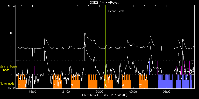 EIS Observation timeline overlay to GOES-Xray curve Code 1" 2" 40" 266" EIS Observations list for this event: STUDY ACRONYM ID DATE OBSERVED DESCRIPTION NOAA# TARGET 0 HH_Flare_180x160_v2 | 21674 | 2011/03/10 16:40:13 | Flare watch AR 11166 | | Flare TIMELINE ID DATE OBSERVED FITS FILE XCEN (+W/-E) YCEN (+N/-S) DUR ----------------------------------------------------------------------------------------------------------------- 21674 | 2011/03/10 16:40:13.000 | eis_l0_20110310_164013.fits.gz | -9861.00 | -9953.20 | 5m46s 21674 | 2011/03/10 16:46:02.000 | eis_l0_20110310_164602.fits.gz | -9861.00 | -9953.20 | 5m46s 21674 | 2011/03/10 16:51:50.000 | eis_l0_20110310_165150.fits.gz | -9861.00 | -9953.20 | 5m47s 21674 | 2011/03/10 16:57:40.000 | eis_l0_20110310_165740.fits.gz | -9861.00 | -9953.20 | 5m46s 21674 | 2011/03/10 17:03:29.000 | eis_l0_20110310_170329.fits.gz | -9861.00 | -9953.20 | 5m47s 21674 | 2011/03/10 17:09:19.000 | eis_l0_20110310_170919.fits.gz | -9861.00 | -9953.20 | 5m46s 21674 | 2011/03/10 17:15:08.000 | eis_l0_20110310_171508.fits.gz | -9861.00 | -9953.20 | 5m47s 21674 | 2011/03/10 17:20:58.000 | eis_l0_20110310_172058.fits.gz | -9861.00 | -9953.20 | 5m46s 1 SYNOP005_A | 21633 | 2011/03/10 18:05:49 | synoptic | | Quiet Sun TIMELINE ID DATE OBSERVED FITS FILE XCEN (+W/-E) YCEN (+N/-S) DUR ----------------------------------------------------------------------------------------------------------------- 21633 | 2011/03/10 18:05:49.000 | eis_l0_20110310_180549.fits.gz | -9889.00 | -9963.20 | 1m31s 21633 | 2011/03/10 18:07:30.000 | eis_l0_20110310_180730.fits.gz | -9869.50 | -9963.20 | 1m31s 2 HH_Flare_180x160_v2 | 21675 | 2011/03/10 19:50:26 | Flare watch AR 11166 | | Flare TIMELINE ID DATE OBSERVED FITS FILE XCEN (+W/-E) YCEN (+N/-S) DUR ----------------------------------------------------------------------------------------------------------------- 21675 | 2011/03/10 19:50:26.000 | eis_l0_20110310_195026.fits.gz | -9861.00 | -9953.20 | 5m47s 21675 | 2011/03/10 19:56:15.000 | eis_l0_20110310_195615.fits.gz | -9861.00 | -9953.20 | 5m46s 21675 | 2011/03/10 20:02:04.000 | eis_l0_20110310_200204.fits.gz | -9861.00 | -9953.20 | 5m47s 21675 | 2011/03/10 20:07:54.000 | eis_l0_20110310_200754.fits.gz | -9861.00 | -9953.20 | 5m46s 21675 | 2011/03/10 20:13:43.000 | eis_l0_20110310_201343.fits.gz | -9861.00 | -9953.20 | 5m47s 21675 | 2011/03/10 20:19:33.000 | eis_l0_20110310_201933.fits.gz | -9861.00 | -9953.20 | 5m46s 21675 | 2011/03/10 20:25:22.000 | eis_l0_20110310_202522.fits.gz | -9861.00 | -9953.20 | 5m47s 21675 | 2011/03/10 20:31:12.000 | eis_l0_20110310_203112.fits.gz | -9861.00 | -9953.20 | 5m47s 3 HH_Flare_180x160_v2 | 21676 | 2011/03/10 21:25:40 | Flare watch AR 11166 | | Flare TIMELINE ID DATE OBSERVED FITS FILE XCEN (+W/-E) YCEN (+N/-S) DUR ----------------------------------------------------------------------------------------------------------------- 21676 | 2011/03/10 21:25:40.000 | eis_l0_20110310_212540.fits.gz | -9861.00 | -9953.20 | 5m46s 21676 | 2011/03/10 21:31:29.000 | eis_l0_20110310_213129.fits.gz | -9861.00 | -9953.20 | 5m46s 21676 | 2011/03/10 21:37:18.000 | eis_l0_20110310_213718.fits.gz | -9861.00 | -9953.20 | 5m46s 21676 | 2011/03/10 21:43:07.000 | eis_l0_20110310_214307.fits.gz | -9861.00 | -9953.20 | 5m46s 21676 | 2011/03/10 21:48:56.000 | eis_l0_20110310_214856.fits.gz | -9861.00 | -9953.20 | 5m47s 21676 | 2011/03/10 21:54:46.000 | eis_l0_20110310_215446.fits.gz | -9861.00 | -9953.20 | 5m46s 21676 | 2011/03/10 22:00:35.000 | eis_l0_20110310_220035.fits.gz | -9861.00 | -9953.20 | 5m47s 21676 | 2011/03/10 22:06:25.000 | eis_l0_20110310_220625.fits.gz | -9861.00 | -9953.20 | 5m47s 4 HH_Flare_180x160_v2 | 21677 | 2011/03/10 23:00:13 | Flare watch AR 11166 | | Flare TIMELINE ID DATE OBSERVED FITS FILE XCEN (+W/-E) YCEN (+N/-S) DUR ----------------------------------------------------------------------------------------------------------------- 21677 | 2011/03/10 23:00:13.000 | eis_l0_20110310_230013.fits.gz | -9861.00 | -9953.20 | 5m46s 21677 | 2011/03/10 23:06:02.000 | eis_l0_20110310_230602.fits.gz | -9861.00 | -9953.20 | 5m46s 21677 | 2011/03/10 23:11:51.000 | eis_l0_20110310_231151.fits.gz | -9861.00 | -9953.20 | 5m46s 21677 | 2011/03/10 23:17:40.000 | eis_l0_20110310_231740.fits.gz | -9861.00 | -9953.20 | 5m47s 21677 | 2011/03/10 23:23:30.000 | eis_l0_20110310_232330.fits.gz | -9861.00 | -9953.20 | 5m46s 21677 | 2011/03/10 23:29:19.000 | eis_l0_20110310_232919.fits.gz | -9861.00 | -9953.20 | 5m46s 21677 | 2011/03/10 23:35:08.000 | eis_l0_20110310_233508.fits.gz | -9861.00 | -9953.20 | 5m46s 21677 | 2011/03/10 23:40:57.000 | eis_l0_20110310_234057.fits.gz | -9861.00 | -9953.20 | 5m47s 5 HH_Flare_180x160_v2 | 21678 | 2011/03/11 00:25:13 | Flare watch AR 11166 | | Flare TIMELINE ID DATE OBSERVED FITS FILE XCEN (+W/-E) YCEN (+N/-S) DUR ----------------------------------------------------------------------------------------------------------------- 21678 | 2011/03/11 00:25:13.000 | eis_l0_20110311_002513.fits.gz | -9861.00 | -9953.20 | 5m46s 21678 | 2011/03/11 00:31:02.000 | eis_l0_20110311_003102.fits.gz | -9861.00 | -9953.20 | 5m46s 21678 | 2011/03/11 00:36:51.000 | eis_l0_20110311_003651.fits.gz | -9861.00 | -9953.20 | 5m46s 21678 | 2011/03/11 00:42:40.000 | eis_l0_20110311_004240.fits.gz | -9861.00 | -9953.20 | 5m46s 21678 | 2011/03/11 00:48:29.000 | eis_l0_20110311_004829.fits.gz | -9861.00 | -9953.20 | 5m46s 21678 | 2011/03/11 00:54:18.000 | eis_l0_20110311_005418.fits.gz | -9861.00 | -9953.20 | 5m47s 21678 | 2011/03/11 01:00:08.000 | eis_l0_20110311_010008.fits.gz | -9861.00 | -9953.20 | 5m47s 21678 | 2011/03/11 01:05:57.000 | eis_l0_20110311_010557.fits.gz | -9861.00 | -9953.20 | 5m47s 6 HH_Flare_180x160_v2 | 21679 | 2011/03/11 02:00:13 | Flare watch AR 11166 | | Flare TIMELINE ID DATE OBSERVED FITS FILE XCEN (+W/-E) YCEN (+N/-S) DUR ----------------------------------------------------------------------------------------------------------------- 21679 