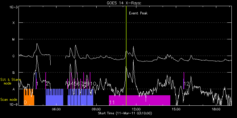 EIS Observation timeline overlay to GOES-Xray curve Code 1" 2" 40" 266" EIS Observations list for this event: STUDY ACRONYM ID DATE OBSERVED DESCRIPTION NOAA# TARGET 0 HH_Flare_180x160_v2 | 21680 | 2011/03/11 03:33:13 | Flare watch AR 11166 | | Flare TIMELINE ID DATE OBSERVED FITS FILE XCEN (+W/-E) YCEN (+N/-S) DUR ----------------------------------------------------------------------------------------------------------------- 21680 | 2011/03/11 03:33:13.000 | eis_l0_20110311_033313.fits.gz | -9861.00 | -9953.20 | 5m46s 21680 | 2011/03/11 03:39:02.000 | eis_l0_20110311_033902.fits.gz | -9861.00 | -9953.20 | 5m47s 21680 | 2011/03/11 03:44:52.000 | eis_l0_20110311_034452.fits.gz | -9861.00 | -9953.20 | 5m46s 21680 | 2011/03/11 03:50:41.000 | eis_l0_20110311_035041.fits.gz | -9861.00 | -9953.20 | 5m47s 21680 | 2011/03/11 03:56:31.000 | eis_l0_20110311_035631.fits.gz | -9861.00 | -9953.20 | 5m46s 21680 | 2011/03/11 04:02:20.000 | eis_l0_20110311_040220.fits.gz | -9861.00 | -9953.20 | 5m46s 21680 | 2011/03/11 04:08:09.000 | eis_l0_20110311_040809.fits.gz | -9861.00 | -9953.20 | 5m46s 21680 | 2011/03/11 04:13:58.000 | eis_l0_20110311_041358.fits.gz | -9861.00 | -9953.20 | 5m46s 1 SYNOP005_A | 21634 | 2011/03/11 04:27:19 | synoptic | | Quiet Sun TIMELINE ID DATE OBSERVED FITS FILE XCEN (+W/-E) YCEN (+N/-S) DUR ----------------------------------------------------------------------------------------------------------------- 21634 | 2011/03/11 04:27:19.000 | eis_l0_20110311_042719.fits.gz | -9889.00 | -9963.20 | 1m30s 21634 | 2011/03/11 04:29:00.000 | eis_l0_20110311_042900.fits.gz | -9869.50 | -9963.20 | 1m31s 2 Alignment_modify_v2 | 21649 | 2011/03/11 05:11:40 | Alignment North Pole | | Quiet Sun TIMELINE ID DATE OBSERVED FITS FILE XCEN (+W/-E) YCEN (+N/-S) DUR ----------------------------------------------------------------------------------------------------------------- 21649 | 2011/03/11 05:11:40.000 | eis_l0_20110311_051140.fits.gz | -9869.50 | -9963.20 | 1m 21649 | 2011/03/11 05:13:05.000 | eis_l0_20110311_051305.fits.gz | -9878.98 | -9963.20 | 2m34s 21649 | 2011/03/11 05:16:13.000 | eis_l0_20110311_051613.fits.gz | -9878.98 | -9963.20 | 2m33s 21649 | 2011/03/11 05:19:20.000 | eis_l0_20110311_051920.fits.gz | -9878.98 | -9963.20 | 2m34s 21649 | 2011/03/11 05:22:28.000 | eis_l0_20110311_052228.fits.gz | -9878.98 | -9963.20 | 2m34s 21649 | 2011/03/11 05:25:35.000 | eis_l0_20110311_052535.fits.gz | -9878.98 | -9963.20 | 2m34s 21649 | 2011/03/11 05:28:43.000 | eis_l0_20110311_052843.fits.gz | -9878.98 | -9963.20 | 2m34s 21649 | 2011/03/11 05:31:50.000 | eis_l0_20110311_053150.fits.gz | -9878.98 | -9963.20 | 2m34s 21649 | 2011/03/11 05:34:58.000 | eis_l0_20110311_053458.fits.gz | -9878.98 | -9963.20 | 2m34s 21649 | 2011/03/11 05:38:05.000 | eis_l0_20110311_053805.fits.gz | -9878.98 | -9963.20 | 2m34s 21649 | 2011/03/11 05:41:13.000 | eis_l0_20110311_054113.fits.gz | -9878.98 | -9963.20 | 2m33s 21649 | 2011/03/11 05:44:20.000 | eis_l0_20110311_054420.fits.gz | -9878.98 | -9963.20 | 2m34s 21649 | 2011/03/11 05:47:28.000 | eis_l0_20110311_054728.fits.gz | -9878.98 | -9963.20 | 2m34s 21649 | 2011/03/11 05:50:35.000 | eis_l0_20110311_055035.fits.gz | -9878.98 | -9963.20 | 2m35s 21649 | 2011/03/11 05:53:43.000 | eis_l0_20110311_055343.fits.gz | -9878.98 | -9963.20 | 2m34s 21649 | 2011/03/11 05:56:51.000 | eis_l0_20110311_055651.fits.gz | -9878.98 | -9963.20 | 2m34s 21649 | 2011/03/11 05:59:58.000 | eis_l0_20110311_055958.fits.gz | -9878.98 | -9963.20 | 2m34s 21649 | 2011/03/11 06:03:06.000 | eis_l0_20110311_060306.fits.gz | -9878.98 | -9963.20 | 2m34s 21649 | 2011/03/11 06:06:13.000 | eis_l0_20110311_060613.fits.gz | -9878.98 | -9963.20 | 2m34s 21649 | 2011/03/11 06:09:21.000 | eis_l0_20110311_060921.fits.gz | -9878.98 | -9963.20 | 2m34s 21649 | 2011/03/11 06:12:29.000 | eis_l0_20110311_061229.fits.gz | -9878.98 | -9963.20 | 2m33s 21649 | 2011/03/11 06:15:36.000 | eis_l0_20110311_061536.fits.gz | -9878.98 | -9963.20 | 2m34s 21649 | 2011/03/11 06:18:44.000 | eis_l0_20110311_061844.fits.gz | -9878.98 | -9963.20 | 2m34s 21649 | 2011/03/11 06:21:51.000 | eis_l0_20110311_062151.fits.gz | -9878.98 | -9963.20 | 2m34s 21649 | 2011/03/11 06:24:59.000 | eis_l0_20110311_062459.fits.gz | -9878.98 | -9963.20 | 2m34s 21649 | 2011/03/11 06:28:06.000 | eis_l0_20110311_062806.fits.gz | -9878.98 | -9963.20 | 2m34s 3 Alignment_modify_v2 | 21650 | 2011/03/11 06:50:19 | Alignment East Limb | | Quiet Sun TIMELINE ID DATE OBSERVED FITS FILE XCEN (+W/-E) YCEN (+N/-S) DUR ----------------------------------------------------------------------------------------------------------------- 21650 | 2011/03/11 06:50:19.000 | eis_l0_20110311_065019.fits.gz | -9854.52 | -9963.20 | 1m1s 21650 | 2011/03/11 06:51:45.000 | eis_l0_20110311_065145.fits.gz | -9893.96 | -9963.20 | 2m34s 21650 | 2011/03/11 06:54:52.000 | eis_l0_20110311_065452.fits.gz | -9893.96 | -9963.20 | 2m34s 21650 | 2011/03/11 06:58:00.000 | eis_l0_20110311_065800.fits.gz | -9893.96 | -9963.20 | 2m34s 21650 | 2011/03/11 07:01:07.000 | eis_l0_20110311_070107.fits.gz | -9893.96 | -9963.20 | 2m34s 4 Alignment_modify_v2 | 21651 | 2011/03/11 07:04:50 | Alignment East Limb | | Quiet Sun TIMELINE ID DATE OBSERVED FITS FILE XCEN (+W/-E) YCEN (+N/-S) DUR ----------------------------------------------------------------------------------------------------------------- 21651 | 2011/03/11 07:04:50.000 | eis_l0_20110311_070450.fits.gz | -9854.52 | -9963.20 | 1m 21651 | 2011/03/11 07:06:15.000 | eis_l0_20110311_070615.fits.gz | -9893.96 | -9963.20 | 2m34s 21651 | 2011/03/11 07:09:23.000 | eis_l0_20110311_070923.fits.gz | -9893.96 | -9963.20 | 2m34s 21651 | 2011/03/11 07:12:30.000 | eis_l0_20110311_071230.fits.gz | -9893.96 | -9963.20 | 2m34s 21651 | 2011/03/11 07:15:38.000 | eis_l0_20110311_071538.fits.gz | -9893.96 | -9963.20 | 2m34s 5 Alignment_modify_v2 | 21652 | 2011/03/11 07:19:20 | Alignment East Limb | | Quiet Sun TIMELINE ID DATE OBSERVED FITS FILE XCEN (+W/-E) YCEN (+N/-S) DUR