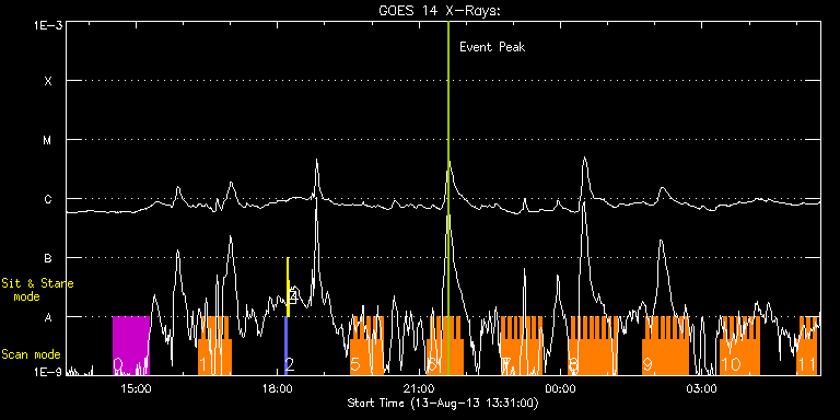 EIS Observation timeline overlay to GOES-Xray curve Code 1" 2" 40" 266" EIS Observations list for this event: STUDY ACRONYM ID DATE OBSERVED DESCRIPTION NOAA# TARGET 0 HPW021_VEL_120x512v2 | 35623 | 2013/08/13 14:30:27 | Active region scan. NOAA 11817. | | Active Region TIMELINE ID DATE OBSERVED FITS FILE XCEN (+W/-E) YCEN (+N/-S) DUR ----------------------------------------------------------------------------------------------------------------- 35623 | 2013/08/13 14:30:27.000 | eis_l0_20130813_143027.fits.gz | -36.17 | -480.97 | 46m53s 1 HH_Flare_162x152 | 35624 | 2013/08/13 16:18:57 | Flare monitoring. NOAA 11817. | 1814 | Flare TIMELINE ID DATE OBSERVED FITS FILE XCEN (+W/-E) YCEN (+N/-S) DUR ----------------------------------------------------------------------------------------------------------------- 35624 | 2013/08/13 16:18:57.000 | eis_l0_20130813_161857.fits.gz | -21.42 | -470.97 | 4m11s 35624 | 2013/08/13 16:23:10.000 | eis_l0_20130813_162310.fits.gz | -20.81 | -471.13 | 4m11s 35624 | 2013/08/13 16:27:24.000 | eis_l0_20130813_162724.fits.gz | -20.27 | -470.90 | 4m10s 35624 | 2013/08/13 16:31:37.000 | eis_l0_20130813_163137.fits.gz | -19.73 | -471.05 | 2m47s 35624 | 2013/08/13 16:34:16.000 | eis_l0_20130813_163416.fits.gz | -19.42 | -470.90 | 1m32s 35624 | 2013/08/13 16:35:51.000 | eis_l0_20130813_163551.fits.gz | -19.03 | -471.13 | 4m10s 35624 | 2013/08/13 16:40:04.000 | eis_l0_20130813_164004.fits.gz | -18.49 | -470.90 | 4m11s 35624 | 2013/08/13 16:44:18.000 | eis_l0_20130813_164418.fits.gz | -17.87 | -470.90 | 4m10s 35624 | 2013/08/13 16:48:31.000 | eis_l0_20130813_164831.fits.gz | -17.33 | -471.05 | 4m11s 35624 | 2013/08/13 16:52:44.000 | eis_l0_20130813_165244.fits.gz | -16.71 | -471.13 | 4m11s 35624 | 2013/08/13 16:56:58.000 | eis_l0_20130813_165658.fits.gz | -16.17 | -470.90 | 4m10s 2 PRY_slot_contextLITE | 35595 | 2013/08/13 18:08:50 | EIS-AIA alignment | | Active Region TIMELINE ID DATE OBSERVED FITS FILE XCEN (+W/-E) YCEN (+N/-S) DUR ----------------------------------------------------------------------------------------------------------------- 35595 | 2013/08/13 18:08:50.000 | eis_l0_20130813_180850.fits.gz | -15.21 | -0.42 | 2m56s 3 Alignment_266 | 35596 | 2013/08/13 18:12:04 | EIS-AIA alignment | | Quiet Sun TIMELINE ID DATE OBSERVED FITS FILE XCEN (+W/-E) YCEN (+N/-S) DUR ----------------------------------------------------------------------------------------------------------------- 35596 | 2013/08/13 18:12:04.000 | eis_l0_20130813_181204.fits.gz | -132.57 | -0.58 | 1m23s 4 XRT_synop_AIA | 35597 | 2013/08/13 18:14:12 | EIS-AIA alignment | | Quiet Sun TIMELINE ID DATE OBSERVED FITS FILE XCEN (+W/-E) YCEN (+N/-S) DUR ----------------------------------------------------------------------------------------------------------------- 35597 | 2013/08/13 18:14:12.000 | eis_l0_20130813_181412.fits.gz | -132.57 | -0.50 | 10s 5 HH_Flare_162x152 | 35606 | 2013/08/13 19:32:20 | Flare monitoring. NOAA 11817. | 1814 | Flare TIMELINE ID DATE OBSERVED FITS FILE XCEN (+W/-E) YCEN (+N/-S) DUR ----------------------------------------------------------------------------------------------------------------- 35606 | 2013/08/13 19:32:20.000 | eis_l0_20130813_193220.fits.gz | 5.38 | -471.13 | 4m10s 35606 | 2013/08/13 19:36:33.000 | eis_l0_20130813_193633.fits.gz | 6.08 | -471.13 | 4m11s 35606 | 2013/08/13 19:40:46.000 | eis_l0_20130813_194046.fits.gz | 6.54 | -471.13 | 4m11s 35606 | 2013/08/13 19:44:59.000 | eis_l0_20130813_194459.fits.gz | 7.08 | -471.05 | 4m11s 35606 | 2013/08/13 19:49:13.000 | eis_l0_20130813_194913.fits.gz | 7.77 | -471.20 | 4m10s 35606 | 2013/08/13 19:53:26.000 | eis_l0_20130813_195326.fits.gz | 8.32 | -471.20 | 4m11s 35606 | 2013/08/13 19:57:40.000 | eis_l0_20130813_195740.fits.gz | 8.86 | -471.13 | 4m10s 35606 | 2013/08/13 20:01:53.000 | eis_l0_20130813_200153.fits.gz | 9.47 | -471.13 | 4m10s 35606 | 2013/08/13 20:06:06.000 | eis_l0_20130813_200606.fits.gz | 10.17 | -471.13 | 4m11s 35606 | 2013/08/13 20:10:20.000 | eis_l0_20130813_201020.fits.gz | 10.63 | -471.05 | 4m10s 6 HH_Flare_162x152 | 35607 | 2013/08/13 21:09:43 | Flare monitoring. NOAA 11817. | 1814 | Flare TIMELINE ID DATE OBSERVED FITS FILE XCEN (+W/-E) YCEN (+N/-S) DUR ----------------------------------------------------------------------------------------------------------------- 35607 | 2013/08/13 21:09:43.000 | eis_l0_20130813_210943.fits.gz | 18.82 | -471.13 | 4m11s 35607 | 2013/08/13 21:13:56.000 | eis_l0_20130813_211356.fits.gz | 19.52 | -471.13 | 4m11s 35607 | 2013/08/13 21:18:10.000 | eis_l0_20130813_211810.fits.gz | 19.98 | -471.13 | 4m10s 35607 | 2013/08/13 21:22:23.000 | eis_l0_20130813_212223.fits.gz | 20.60 | -471.20 | 4m10s 35607 | 2013/08/13 21:26:36.000 | eis_l0_20130813_212636.fits.gz | 21.29 | -471.20 | 4m11s 35607 | 2013/08/13 21:30:50.000 | eis_l0_20130813_213050.fits.gz | 21.76 | -471.20 | 4m10s 35607 | 2013/08/13 21:35:03.000 | eis_l0_20130813_213503.fits.gz | 22.37 | -471.20 | 4m11s 35607 | 2013/08/13 21:39:17.000 | eis_l0_20130813_213917.fits.gz | 22.99 | -471.13 | 4m10s 35607 | 2013/08/13 21:43:30.000 | eis_l0_20130813_214330.fits.gz | 23.53 | -471.05 | 4m11s 35607 | 2013/08/13 21:47:44.000 | eis_l0_20130813_214744.fits.gz | 24.15 | -471.20 | 4m10s 35607 | 2013/08/13 21:51:57.000 | eis_l0_20130813_215157.fits.gz | 24.69 | -471.20 | 4m10s 7 CAM_ARTB_RHESSI_b_2 | 35599 | 2013/08/13 22:45:13 | HOP 128. Coordination with Hida Observ | | Active Region TIMELINE ID DATE OBSERVED FITS FILE XCEN (+W/-E) YCEN (+N/-S) DUR ----------------------------------------------------------------------------------------------------------------- 35599 | 2013/08/13 22:45:13.000 | eis_l0_20130813_224513.fits.gz | -37.09 | -475.83 | 3m53s 35599 | 2013/08/13 22:49:08.000 | eis_l0_20130813_224908.fits.gz | -36.55 | -475.91 | 3m52s 35599 | 2013/08/13 22:53:03.000 | eis_l0_20130813_225303.fits.gz | -36.01 | -475.99 | 3m52s 35599 | 2013/08/13 22:56:57.000 | eis_l0_20130813_225657.fits.gz | -35.54 | -475.91 |