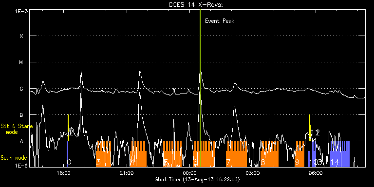 EIS Observation timeline overlay to GOES-Xray curve Code 1" 2" 40" 266" EIS Observations list for this event: STUDY ACRONYM ID DATE OBSERVED DESCRIPTION NOAA# TARGET 0 PRY_slot_contextLITE | 35595 | 2013/08/13 18:08:50 | EIS-AIA alignment | | Active Region TIMELINE ID DATE OBSERVED FITS FILE XCEN (+W/-E) YCEN (+N/-S) DUR ----------------------------------------------------------------------------------------------------------------- 35595 | 2013/08/13 18:08:50.000 | eis_l0_20130813_180850.fits.gz | -15.21 | -0.42 | 2m56s 1 Alignment_266 | 35596 | 2013/08/13 18:12:04 | EIS-AIA alignment | | Quiet Sun TIMELINE ID DATE OBSERVED FITS FILE XCEN (+W/-E) YCEN (+N/-S) DUR ----------------------------------------------------------------------------------------------------------------- 35596 | 2013/08/13 18:12:04.000 | eis_l0_20130813_181204.fits.gz | -132.57 | -0.58 | 1m23s 2 XRT_synop_AIA | 35597 | 2013/08/13 18:14:12 | EIS-AIA alignment | | Quiet Sun TIMELINE ID DATE OBSERVED FITS FILE XCEN (+W/-E) YCEN (+N/-S) DUR ----------------------------------------------------------------------------------------------------------------- 35597 | 2013/08/13 18:14:12.000 | eis_l0_20130813_181412.fits.gz | -132.57 | -0.50 | 10s 3 HH_Flare_162x152 | 35606 | 2013/08/13 19:32:20 | Flare monitoring. NOAA 11817. | 1814 | Flare TIMELINE ID DATE OBSERVED FITS FILE XCEN (+W/-E) YCEN (+N/-S) DUR ----------------------------------------------------------------------------------------------------------------- 35606 | 2013/08/13 19:32:20.000 | eis_l0_20130813_193220.fits.gz | 5.38 | -471.13 | 4m10s 35606 | 2013/08/13 19:36:33.000 | eis_l0_20130813_193633.fits.gz | 6.08 | -471.13 | 4m11s 35606 | 2013/08/13 19:40:46.000 | eis_l0_20130813_194046.fits.gz | 6.54 | -471.13 | 4m11s 35606 | 2013/08/13 19:44:59.000 | eis_l0_20130813_194459.fits.gz | 7.08 | -471.05 | 4m11s 35606 | 2013/08/13 19:49:13.000 | eis_l0_20130813_194913.fits.gz | 7.77 | -471.20 | 4m10s 35606 | 2013/08/13 19:53:26.000 | eis_l0_20130813_195326.fits.gz | 8.32 | -471.20 | 4m11s 35606 | 2013/08/13 19:57:40.000 | eis_l0_20130813_195740.fits.gz | 8.86 | -471.13 | 4m10s 35606 | 2013/08/13 20:01:53.000 | eis_l0_20130813_200153.fits.gz | 9.47 | -471.13 | 4m10s 35606 | 2013/08/13 20:06:06.000 | eis_l0_20130813_200606.fits.gz | 10.17 | -471.13 | 4m11s 35606 | 2013/08/13 20:10:20.000 | eis_l0_20130813_201020.fits.gz | 10.63 | -471.05 | 4m10s 4 HH_Flare_162x152 | 35607 | 2013/08/13 21:09:43 | Flare monitoring. NOAA 11817. | 1814 | Flare TIMELINE ID DATE OBSERVED FITS FILE XCEN (+W/-E) YCEN (+N/-S) DUR ----------------------------------------------------------------------------------------------------------------- 35607 | 2013/08/13 21:09:43.000 | eis_l0_20130813_210943.fits.gz | 18.82 | -471.13 | 4m11s 35607 | 2013/08/13 21:13:56.000 | eis_l0_20130813_211356.fits.gz | 19.52 | -471.13 | 4m11s 35607 | 2013/08/13 21:18:10.000 | eis_l0_20130813_211810.fits.gz | 19.98 | -471.13 | 4m10s 35607 | 2013/08/13 21:22:23.000 | eis_l0_20130813_212223.fits.gz | 20.60 | -471.20 | 4m10s 35607 | 2013/08/13 21:26:36.000 | eis_l0_20130813_212636.fits.gz | 21.29 | -471.20 | 4m11s 35607 | 2013/08/13 21:30:50.000 | eis_l0_20130813_213050.fits.gz | 21.76 | -471.20 | 4m10s 35607 | 2013/08/13 21:35:03.000 | eis_l0_20130813_213503.fits.gz | 22.37 | -471.20 | 4m11s 35607 | 2013/08/13 21:39:17.000 | eis_l0_20130813_213917.fits.gz | 22.99 | -471.13 | 4m10s 35607 | 2013/08/13 21:43:30.000 | eis_l0_20130813_214330.fits.gz | 23.53 | -471.05 | 4m11s 35607 | 2013/08/13 21:47:44.000 | eis_l0_20130813_214744.fits.gz | 24.15 | -471.20 | 4m10s 35607 | 2013/08/13 21:51:57.000 | eis_l0_20130813_215157.fits.gz | 24.69 | -471.20 | 4m10s 5 CAM_ARTB_RHESSI_b_2 | 35599 | 2013/08/13 22:45:13 | HOP 128. Coordination with Hida Observ | | Active Region TIMELINE ID DATE OBSERVED FITS FILE XCEN (+W/-E) YCEN (+N/-S) DUR ----------------------------------------------------------------------------------------------------------------- 35599 | 2013/08/13 22:45:13.000 | eis_l0_20130813_224513.fits.gz | -37.09 | -475.83 | 3m53s 35599 | 2013/08/13 22:49:08.000 | eis_l0_20130813_224908.fits.gz | -36.55 | -475.91 | 3m52s 35599 | 2013/08/13 22:53:03.000 | eis_l0_20130813_225303.fits.gz | -36.01 | -475.99 | 3m52s 35599 | 2013/08/13 22:56:57.000 | eis_l0_20130813_225657.fits.gz | -35.54 | -475.91 | 3m52s 35599 | 2013/08/13 23:00:52.000 | eis_l0_20130813_230052.fits.gz | -34.93 | -475.75 | 3m52s 35599 | 2013/08/13 23:04:46.000 | eis_l0_20130813_230446.fits.gz | -34.38 | -475.99 | 3m52s 35599 | 2013/08/13 23:08:41.000 | eis_l0_20130813_230841.fits.gz | -33.84 | -475.99 | 3m52s 35599 | 2013/08/13 23:12:35.000 | eis_l0_20130813_231235.fits.gz | -33.38 | -475.99 | 3m52s 35599 | 2013/08/13 23:16:30.000 | eis_l0_20130813_231630.fits.gz | -32.76 | -475.91 | 3m51s 35599 | 2013/08/13 23:20:24.000 | eis_l0_20130813_232024.fits.gz | -32.30 | -475.75 | 3m52s 35599 | 2013/08/13 23:24:19.000 | eis_l0_20130813_232419.fits.gz | -31.68 | -475.91 | 3m52s 35599 | 2013/08/13 23:28:14.000 | eis_l0_20130813_232814.fits.gz | -31.14 | -475.99 | 3m52s 35599 | 2013/08/13 23:32:09.000 | eis_l0_20130813_233209.fits.gz | -30.68 | -475.91 | 3m52s 6 CAM_ARTB_RHESSI_b_2 | 35600 | 2013/08/14 00:09:43 | HOP 128. Coordination with Hida Observ | | Active Region TIMELINE ID DATE OBSERVED FITS FILE XCEN (+W/-E) YCEN (+N/-S) DUR ----------------------------------------------------------------------------------------------------------------- 35600 | 2013/08/14 00:09:43.000 | eis_l0_20130814_000943.fits.gz | -25.50 | -475.99 | 3m52s 35600 | 2013/08/14 00:13:38.000 | eis_l0_20130814_001338.fits.gz | -24.88 | -475.83 | 3m52s 35600 | 2013/08/14 00:17:33.000 | eis_l0_20130814_001733.fits.gz | -24.50 | -475.91 | 3m51s 35600 | 2013/08/14 00:21:27.000 | eis_l0_20130814_002127.fits.gz | -23.80 | -475.99 | 3m52s 35600 | 2013/08/14 00:25:22.000 | eis_l0_20130814_002522.fits.gz | -23.18 | -476.06 | 3m52s 35600 | 2013/08/14 00:29:16.000 | eis_l0_20130814_002916.fits.gz | -22.80 | -475