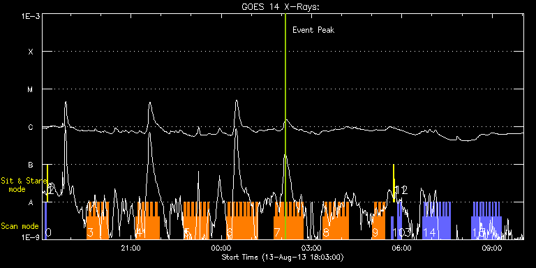 EIS Observation timeline overlay to GOES-Xray curve Code 1" 2" 40" 266" EIS Observations list for this event: STUDY ACRONYM ID DATE OBSERVED DESCRIPTION NOAA# TARGET 0 PRY_slot_contextLITE | 35595 | 2013/08/13 18:08:50 | EIS-AIA alignment | | Active Region TIMELINE ID DATE OBSERVED FITS FILE XCEN (+W/-E) YCEN (+N/-S) DUR ----------------------------------------------------------------------------------------------------------------- 35595 | 2013/08/13 18:08:50.000 | eis_l0_20130813_180850.fits.gz | -15.21 | -0.42 | 2m56s 1 Alignment_266 | 35596 | 2013/08/13 18:12:04 | EIS-AIA alignment | | Quiet Sun TIMELINE ID DATE OBSERVED FITS FILE XCEN (+W/-E) YCEN (+N/-S) DUR ----------------------------------------------------------------------------------------------------------------- 35596 | 2013/08/13 18:12:04.000 | eis_l0_20130813_181204.fits.gz | -132.57 | -0.58 | 1m23s 2 XRT_synop_AIA | 35597 | 2013/08/13 18:14:12 | EIS-AIA alignment | | Quiet Sun TIMELINE ID DATE OBSERVED FITS FILE XCEN (+W/-E) YCEN (+N/-S) DUR ----------------------------------------------------------------------------------------------------------------- 35597 | 2013/08/13 18:14:12.000 | eis_l0_20130813_181412.fits.gz | -132.57 | -0.50 | 10s 3 HH_Flare_162x152 | 35606 | 2013/08/13 19:32:20 | Flare monitoring. NOAA 11817. | 1814 | Flare TIMELINE ID DATE OBSERVED FITS FILE XCEN (+W/-E) YCEN (+N/-S) DUR ----------------------------------------------------------------------------------------------------------------- 35606 | 2013/08/13 19:32:20.000 | eis_l0_20130813_193220.fits.gz | 5.38 | -471.13 | 4m10s 35606 | 2013/08/13 19:36:33.000 | eis_l0_20130813_193633.fits.gz | 6.08 | -471.13 | 4m11s 35606 | 2013/08/13 19:40:46.000 | eis_l0_20130813_194046.fits.gz | 6.54 | -471.13 | 4m11s 35606 | 2013/08/13 19:44:59.000 | eis_l0_20130813_194459.fits.gz | 7.08 | -471.05 | 4m11s 35606 | 2013/08/13 19:49:13.000 | eis_l0_20130813_194913.fits.gz | 7.77 | -471.20 | 4m10s 35606 | 2013/08/13 19:53:26.000 | eis_l0_20130813_195326.fits.gz | 8.32 | -471.20 | 4m11s 35606 | 2013/08/13 19:57:40.000 | eis_l0_20130813_195740.fits.gz | 8.86 | -471.13 | 4m10s 35606 | 2013/08/13 20:01:53.000 | eis_l0_20130813_200153.fits.gz | 9.47 | -471.13 | 4m10s 35606 | 2013/08/13 20:06:06.000 | eis_l0_20130813_200606.fits.gz | 10.17 | -471.13 | 4m11s 35606 | 2013/08/13 20:10:20.000 | eis_l0_20130813_201020.fits.gz | 10.63 | -471.05 | 4m10s 4 HH_Flare_162x152 | 35607 | 2013/08/13 21:09:43 | Flare monitoring. NOAA 11817. | 1814 | Flare TIMELINE ID DATE OBSERVED FITS FILE XCEN (+W/-E) YCEN (+N/-S) DUR ----------------------------------------------------------------------------------------------------------------- 35607 | 2013/08/13 21:09:43.000 | eis_l0_20130813_210943.fits.gz | 18.82 | -471.13 | 4m11s 35607 | 2013/08/13 21:13:56.000 | eis_l0_20130813_211356.fits.gz | 19.52 | -471.13 | 4m11s 35607 | 2013/08/13 21:18:10.000 | eis_l0_20130813_211810.fits.gz | 19.98 | -471.13 | 4m10s 35607 | 2013/08/13 21:22:23.000 | eis_l0_20130813_212223.fits.gz | 20.60 | -471.20 | 4m10s 35607 | 2013/08/13 21:26:36.000 | eis_l0_20130813_212636.fits.gz | 21.29 | -471.20 | 4m11s 35607 | 2013/08/13 21:30:50.000 | eis_l0_20130813_213050.fits.gz | 21.76 | -471.20 | 4m10s 35607 | 2013/08/13 21:35:03.000 | eis_l0_20130813_213503.fits.gz | 22.37 | -471.20 | 4m11s 35607 | 2013/08/13 21:39:17.000 | eis_l0_20130813_213917.fits.gz | 22.99 | -471.13 | 4m10s 35607 | 2013/08/13 21:43:30.000 | eis_l0_20130813_214330.fits.gz | 23.53 | -471.05 | 4m11s 35607 | 2013/08/13 21:47:44.000 | eis_l0_20130813_214744.fits.gz | 24.15 | -471.20 | 4m10s 35607 | 2013/08/13 21:51:57.000 | eis_l0_20130813_215157.fits.gz | 24.69 | -471.20 | 4m10s 5 CAM_ARTB_RHESSI_b_2 | 35599 | 2013/08/13 22:45:13 | HOP 128. Coordination with Hida Observ | | Active Region TIMELINE ID DATE OBSERVED FITS FILE XCEN (+W/-E) YCEN (+N/-S) DUR ----------------------------------------------------------------------------------------------------------------- 35599 | 2013/08/13 22:45:13.000 | eis_l0_20130813_224513.fits.gz | -37.09 | -475.83 | 3m53s 35599 | 2013/08/13 22:49:08.000 | eis_l0_20130813_224908.fits.gz | -36.55 | -475.91 | 3m52s 35599 | 2013/08/13 22:53:03.000 | eis_l0_20130813_225303.fits.gz | -36.01 | -475.99 | 3m52s 35599 | 2013/08/13 22:56:57.000 | eis_l0_20130813_225657.fits.gz | -35.54 | -475.91 | 3m52s 35599 | 2013/08/13 23:00:52.000 | eis_l0_20130813_230052.fits.gz | -34.93 | -475.75 | 3m52s 35599 | 2013/08/13 23:04:46.000 | eis_l0_20130813_230446.fits.gz | -34.38 | -475.99 | 3m52s 35599 | 2013/08/13 23:08:41.000 | eis_l0_20130813_230841.fits.gz | -33.84 | -475.99 | 3m52s 35599 | 2013/08/13 23:12:35.000 | eis_l0_20130813_231235.fits.gz | -33.38 | -475.99 | 3m52s 35599 | 2013/08/13 23:16:30.000 | eis_l0_20130813_231630.fits.gz | -32.76 | -475.91 | 3m51s 35599 | 2013/08/13 23:20:24.000 | eis_l0_20130813_232024.fits.gz | -32.30 | -475.75 | 3m52s 35599 | 2013/08/13 23:24:19.000 | eis_l0_20130813_232419.fits.gz | -31.68 | -475.91 | 3m52s 35599 | 2013/08/13 23:28:14.000 | eis_l0_20130813_232814.fits.gz | -31.14 | -475.99 | 3m52s 35599 | 2013/08/13 23:32:09.000 | eis_l0_20130813_233209.fits.gz | -30.68 | -475.91 | 3m52s 6 CAM_ARTB_RHESSI_b_2 | 35600 | 2013/08/14 00:09:43 | HOP 128. Coordination with Hida Observ | | Active Region TIMELINE ID DATE OBSERVED FITS FILE XCEN (+W/-E) YCEN (+N/-S) DUR ----------------------------------------------------------------------------------------------------------------- 35600 | 2013/08/14 00:09:43.000 | eis_l0_20130814_000943.fits.gz | -25.50 | -475.99 | 3m52s 35600 | 2013/08/14 00:13:38.000 | eis_l0_20130814_001338.fits.gz | -24.88 | -475.83 | 3m52s 35600 | 2013/08/14 00:17:33.000 | eis_l0_20130814_001733.fits.gz | -24.50 | -475.91 | 3m51s 35600 | 2013/08/14 00:21:27.000 | eis_l0_20130814_002127.fits.gz | -23.80 | -475.99 | 3m52s 35600 | 2013/08/14 00:25:22.000 | eis_l0_20130814_002522.fits.gz | -23.18 | -476.06 | 3m52s 35600 | 2013/08/14 00:29:16.000 | eis_l0_20130814_002916.fits.gz | -22.80 | -475