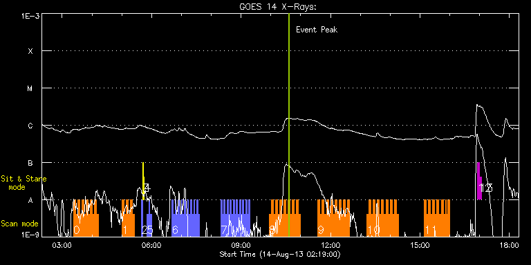EIS Observation timeline overlay to GOES-Xray curve Code 1" 2" 40" 266" EIS Observations list for this event: STUDY ACRONYM ID DATE OBSERVED DESCRIPTION NOAA# TARGET 0 HH_Flare_162x152 | 35608 | 2013/08/14 03:22:43 | Flare monitoring. NOAA 11817. | 1817 | Flare TIMELINE ID DATE OBSERVED FITS FILE XCEN (+W/-E) YCEN (+N/-S) DUR ----------------------------------------------------------------------------------------------------------------- 35608 | 2013/08/14 03:22:43.000 | eis_l0_20130814_032243.fits.gz | 70.42 | -471.13 | 4m11s 35608 | 2013/08/14 03:26:57.000 | eis_l0_20130814_032657.fits.gz | 71.04 | -471.20 | 4m11s 35608 | 2013/08/14 03:31:11.000 | eis_l0_20130814_033111.fits.gz | 71.74 | -471.13 | 4m10s 35608 | 2013/08/14 03:35:24.000 | eis_l0_20130814_033524.fits.gz | 72.28 | -471.13 | 4m10s 35608 | 2013/08/14 03:39:37.000 | eis_l0_20130814_033937.fits.gz | 72.82 | -471.13 | 4m11s 35608 | 2013/08/14 03:43:50.000 | eis_l0_20130814_034350.fits.gz | 73.44 | -471.05 | 4m11s 35608 | 2013/08/14 03:48:04.000 | eis_l0_20130814_034804.fits.gz | 73.98 | -471.05 | 4m10s 35608 | 2013/08/14 03:52:17.000 | eis_l0_20130814_035217.fits.gz | 74.59 | -471.05 | 4m11s 35608 | 2013/08/14 03:56:31.000 | eis_l0_20130814_035631.fits.gz | 75.21 | -470.97 | 4m10s 35608 | 2013/08/14 04:00:44.000 | eis_l0_20130814_040044.fits.gz | 75.68 | -471.13 | 4m11s 35608 | 2013/08/14 04:04:58.000 | eis_l0_20130814_040458.fits.gz | 76.37 | -471.05 | 4m10s 35608 | 2013/08/14 04:09:11.000 | eis_l0_20130814_040911.fits.gz | 76.91 | -471.13 | 4m10s 1 HH_Flare_162x152 | 35609 | 2013/08/14 05:00:43 | Flare monitoring. NOAA 11817. | 1817 | Flare TIMELINE ID DATE OBSERVED FITS FILE XCEN (+W/-E) YCEN (+N/-S) DUR ----------------------------------------------------------------------------------------------------------------- 35609 | 2013/08/14 05:00:43.000 | eis_l0_20130814_050043.fits.gz | 83.86 | -470.90 | 4m11s 35609 | 2013/08/14 05:04:57.000 | eis_l0_20130814_050457.fits.gz | 84.48 | -470.97 | 4m11s 35609 | 2013/08/14 05:09:10.000 | eis_l0_20130814_050910.fits.gz | 85.18 | -470.97 | 4m11s 35609 | 2013/08/14 05:13:24.000 | eis_l0_20130814_051324.fits.gz | 85.79 | -470.97 | 4m10s 35609 | 2013/08/14 05:17:37.000 | eis_l0_20130814_051737.fits.gz | 86.34 | -470.97 | 4m10s 35609 | 2013/08/14 05:21:50.000 | eis_l0_20130814_052150.fits.gz | 86.88 | -470.97 | 4m11s 2 PRY_slot_contextLITE | 35614 | 2013/08/14 05:39:20 | EIS-AIA alignment | 1818 | Active Region TIMELINE ID DATE OBSERVED FITS FILE XCEN (+W/-E) YCEN (+N/-S) DUR ----------------------------------------------------------------------------------------------------------------- 35614 | 2013/08/14 05:39:20.000 | eis_l0_20130814_053920.fits.gz | -15.29 | -0.35 | 2m56s 3 Alignment_266 | 35615 | 2013/08/14 05:42:34 | EIS-AIA alignment | 1818 | Quiet Sun TIMELINE ID DATE OBSERVED FITS FILE XCEN (+W/-E) YCEN (+N/-S) DUR ----------------------------------------------------------------------------------------------------------------- 35615 | 2013/08/14 05:42:34.000 | eis_l0_20130814_054234.fits.gz | -132.64 | -0.42 | 1m22s 4 XRT_synop_AIA | 35616 | 2013/08/14 05:45:09 | EIS-AIA alignment | 1818 | Quiet Sun TIMELINE ID DATE OBSERVED FITS FILE XCEN (+W/-E) YCEN (+N/-S) DUR ----------------------------------------------------------------------------------------------------------------- 35616 | 2013/08/14 05:45:09.000 | eis_l0_20130814_054509.fits.gz | -132.57 | -0.27 | 10s 5 Alignment_modify_v2 | 35603 | 2013/08/14 05:50:59 | Hinode instrument alignment programme | | Quiet Sun TIMELINE ID DATE OBSERVED FITS FILE XCEN (+W/-E) YCEN (+N/-S) DUR ----------------------------------------------------------------------------------------------------------------- 35603 | 2013/08/14 05:50:59.000 | eis_l0_20130814_055059.fits.gz | -9.47 | 944.62 | 2m34s 35603 | 2013/08/14 05:54:06.000 | eis_l0_20130814_055406.fits.gz | -9.63 | 944.62 | 2m34s 35603 | 2013/08/14 05:57:14.000 | eis_l0_20130814_055714.fits.gz | -9.47 | 944.55 | 2m34s 6 Alignment_modify_v2 | 35604 | 2013/08/14 06:40:45 | Hinode instrument alignment programme | | Quiet Sun TIMELINE ID DATE OBSERVED FITS FILE XCEN (+W/-E) YCEN (+N/-S) DUR ----------------------------------------------------------------------------------------------------------------- 35604 | 2013/08/14 06:40:45.000 | eis_l0_20130814_064045.fits.gz | -9.55 | 944.62 | 2m34s 35604 | 2013/08/14 06:43:52.000 | eis_l0_20130814_064352.fits.gz | -9.55 | 944.62 | 2m34s 35604 | 2013/08/14 06:47:00.000 | eis_l0_20130814_064700.fits.gz | -9.55 | 944.55 | 2m34s 35604 | 2013/08/14 06:50:08.000 | eis_l0_20130814_065008.fits.gz | -9.55 | 944.62 | 2m34s 35604 | 2013/08/14 06:53:15.000 | eis_l0_20130814_065315.fits.gz | -9.39 | 944.47 | 2m34s 35604 | 2013/08/14 06:56:23.000 | eis_l0_20130814_065623.fits.gz | -9.39 | 944.55 | 2m34s 35604 | 2013/08/14 06:59:30.000 | eis_l0_20130814_065930.fits.gz | -9.55 | 944.47 | 2m34s 35604 | 2013/08/14 07:02:38.000 | eis_l0_20130814_070238.fits.gz | -9.47 | 944.55 | 2m34s 35604 | 2013/08/14 07:05:45.000 | eis_l0_20130814_070545.fits.gz | -9.55 | 944.47 | 2m34s 35604 | 2013/08/14 07:08:53.000 | eis_l0_20130814_070853.fits.gz | -9.47 | 944.47 | 2m34s 35604 | 2013/08/14 07:12:00.000 | eis_l0_20130814_071200.fits.gz | -9.55 | 944.55 | 2m34s 35604 | 2013/08/14 07:15:08.000 | eis_l0_20130814_071508.fits.gz | -9.55 | 944.47 | 2m34s 35604 | 2013/08/14 07:18:15.000 | eis_l0_20130814_071815.fits.gz | -9.63 | 944.70 | 2m34s 35604 | 2013/08/14 07:21:23.000 | eis_l0_20130814_072123.fits.gz | -9.47 | 944.62 | 2m34s 35604 | 2013/08/14 07:24:30.000 | eis_l0_20130814_072430.fits.gz | -9.47 | 944.47 | 2m34s 35604 | 2013/08/14 07:27:38.000 | eis_l0_20130814_072738.fits.gz | -9.47 | 944.47 | 2m34s 35604 | 2013/08/14 07:30:46.000 | eis_l0_20130814_073046.fits.gz | -9.47 | 944.62 | 2m34s 35604 | 2013/08/14 07:33:53.000 | eis_l0_20130814_073353.fits.gz | -9.47 | 944.55 | 2m34s 7 Alignment_modify_v2 | 35605 | 2013/08/14 08:19:15 | Hinode instrument alignment programme | | Quiet Sun 