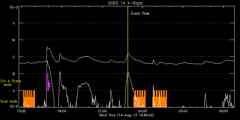 EIS Observation timeline overlay to GOES-Xray curve Code 1" 2" 40" 266" EIS Observations list for this event: STUDY ACRONYM ID DATE OBSERVED DESCRIPTION NOAA# TARGET 0 HH_Flare_162x152 | 35613 | 2013/08/14 15:08:43 | Flare monitoring. NOAA 11817. | | Flare TIMELINE ID DATE OBSERVED FITS FILE XCEN (+W/-E) YCEN (+N/-S) DUR ----------------------------------------------------------------------------------------------------------------- 35613 | 2013/08/14 15:08:43.000 | eis_l0_20130814_150843.fits.gz | 167.37 | -469.97 | 4m10s 35613 | 2013/08/14 15:12:56.000 | eis_l0_20130814_151256.fits.gz | 167.99 | -469.97 | 4m11s 35613 | 2013/08/14 15:17:10.000 | eis_l0_20130814_151710.fits.gz | 168.53 | -469.97 | 4m10s 35613 | 2013/08/14 15:21:23.000 | eis_l0_20130814_152123.fits.gz | 169.07 | -469.74 | 4m11s 35613 | 2013/08/14 15:25:36.000 | eis_l0_20130814_152536.fits.gz | 169.61 | -469.97 | 4m11s 35613 | 2013/08/14 15:29:50.000 | eis_l0_20130814_152950.fits.gz | 170.23 | -469.89 | 4m11s 35613 | 2013/08/14 15:34:03.000 | eis_l0_20130814_153403.fits.gz | 170.77 | -469.89 | 4m11s 35613 | 2013/08/14 15:38:17.000 | eis_l0_20130814_153817.fits.gz | 171.31 | -469.89 | 4m10s 35613 | 2013/08/14 15:42:30.000 | eis_l0_20130814_154230.fits.gz | 171.93 | -469.97 | 4m11s 35613 | 2013/08/14 15:46:44.000 | eis_l0_20130814_154644.fits.gz | 172.54 | -469.89 | 4m10s 35613 | 2013/08/14 15:50:57.000 | eis_l0_20130814_155057.fits.gz | 173.16 | -469.81 | 2m33s 35613 | 2013/08/14 15:52:07.000 | eis_l0_20130814_155207.fits.gz | 173.24 | -469.89 | 3m1s 35613 | 2013/08/14 15:55:11.000 | eis_l0_20130814_155511.fits.gz | 173.70 | -469.81 | 4m11s 1 regcal071 | 35617 | 2013/08/14 16:56:11 | Dark exposures, CCD bottom rows (100s | | Engineering TIMELINE ID DATE OBSERVED FITS FILE XCEN (+W/-E) YCEN (+N/-S) DUR ----------------------------------------------------------------------------------------------------------------- 35617 | 2013/08/14 16:56:11.000 | eis_l0_20130814_165611.fits.gz | 193.96 | -764.74 | 3m22s 2 regcal072 | 35618 | 2013/08/14 17:00:00 | Dark exposures, top CCD rows (100s exp | | Engineering TIMELINE ID DATE OBSERVED FITS FILE XCEN (+W/-E) YCEN (+N/-S) DUR ----------------------------------------------------------------------------------------------------------------- 35618 | 2013/08/14 17:00:00.000 | eis_l0_20130814_170000.fits.gz | 194.57 | -253.66 | 3m22s 3 tr_bright_lo | 35601 | 2013/08/14 23:19:13 | HOP 128. Coordination with Hida Observ | | Quiet Sun TIMELINE ID DATE OBSERVED FITS FILE XCEN (+W/-E) YCEN (+N/-S) DUR ----------------------------------------------------------------------------------------------------------------- 35601 | 2013/08/14 23:19:13.000 | eis_l0_20130814_231913.fits.gz | 633.27 | -551.73 | 5m15s 35601 | 2013/08/14 23:24:31.000 | eis_l0_20130814_232431.fits.gz | 633.65 | -551.73 | 5m15s 35601 | 2013/08/14 23:29:49.000 | eis_l0_20130814_232949.fits.gz | 634.12 | -551.58 | 5m15s 35601 | 2013/08/14 23:35:07.000 | eis_l0_20130814_233507.fits.gz | 634.58 | -551.66 | 5m15s 35601 | 2013/08/14 23:40:25.000 | eis_l0_20130814_234025.fits.gz | 634.81 | -551.50 | 5m14s 35601 | 2013/08/14 23:45:42.000 | eis_l0_20130814_234542.fits.gz | 635.27 | -551.35 | 5m15s 35601 | 2013/08/14 23:51:00.000 | eis_l0_20130814_235100.fits.gz | 635.82 | -551.42 | 5m15s 35601 | 2013/08/14 23:56:18.000 | eis_l0_20130814_235618.fits.gz | 636.28 | -551.27 | 5m15s 35601 | 2013/08/15 00:01:36.000 | eis_l0_20130815_000136.fits.gz | 636.74 | -551.19 | 5m15s 35601 | 2013/08/15 00:06:54.000 | eis_l0_20130815_000654.fits.gz | 637.13 | -551.35 | 5m15s 4 tr_bright_lo | 35602 | 2013/08/15 00:44:13 | HOP 128. Coordination with Hida Observ | | Quiet Sun TIMELINE ID DATE OBSERVED FITS FILE XCEN (+W/-E) YCEN (+N/-S) DUR ----------------------------------------------------------------------------------------------------------------- 35602 | 2013/08/15 00:44:13.000 | eis_l0_20130815_004413.fits.gz | 640.14 | -550.88 | 5m15s 35602 | 2013/08/15 00:49:31.000 | eis_l0_20130815_004931.fits.gz | 640.45 | -550.73 | 5m15s 35602 | 2013/08/15 00:54:49.000 | eis_l0_20130815_005449.fits.gz | 640.91 | -550.65 | 5m15s 35602 | 2013/08/15 01:00:07.000 | eis_l0_20130815_010007.fits.gz | 641.30 | -550.73 | 5m15s 35602 | 2013/08/15 01:05:25.000 | eis_l0_20130815_010525.fits.gz | 641.76 | -550.50 | 5m15s 35602 | 2013/08/15 01:10:43.000 | eis_l0_20130815_011043.fits.gz | 642.15 | -550.57 | 5m15s 35602 | 2013/08/15 01:16:01.000 | eis_l0_20130815_011601.fits.gz | 642.54 | -550.50 | 5m15s 35602 | 2013/08/15 01:21:19.000 | eis_l0_20130815_012119.fits.gz | 643.00 | -550.34 | 5m15s 35602 | 2013/08/15 01:26:37.000 | eis_l0_20130815_012637.fits.gz | 643.31 | -550.34 | 5m15s 35602 | 2013/08/15 01:31:55.000 | eis_l0_20130815_013155.fits.gz | 643.77 | -550.19 | 5m15s 35602 | 2013/08/15 01:37:12.000 | eis_l0_20130815_013712.fits.gz | 644.23 | -550.03 | 5m16s 35602 | 2013/08/15 01:42:30.000 | eis_l0_20130815_014230.fits.gz | 644.62 | -550.19 | 5m15s : Check study information : Download file : View thumbnails For this event, also check for: