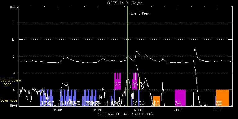 EIS Observation timeline overlay to GOES-Xray curve Code 1" 2" 40" 266" EIS Observations list for this event: STUDY ACRONYM ID DATE OBSERVED DESCRIPTION NOAA# TARGET 0 full_sun_slot_scan_2 | 35626 | 2013/08/15 10:39:20 | HOP 130 (1T/15) | | Quiet Sun TIMELINE ID DATE OBSERVED FITS FILE XCEN (+W/-E) YCEN (+N/-S) DUR ----------------------------------------------------------------------------------------------------------------- 35626 | 2013/08/15 10:39:20.000 | eis_l0_20130815_103920.fits.gz | 920.87 | 185.65 | 5m28s 1 full_sun_slot_scan_2 | 35627 | 2013/08/15 10:44:53 | HOP 130 (1B/15) | | Quiet Sun TIMELINE ID DATE OBSERVED FITS FILE XCEN (+W/-E) YCEN (+N/-S) DUR ----------------------------------------------------------------------------------------------------------------- 35627 | 2013/08/15 10:44:53.000 | eis_l0_20130815_104453.fits.gz | 920.72 | -286.50 | 5m27s 2 full_sun_slot_scan_2 | 35628 | 2013/08/15 10:55:14 | HOP 130 (2T/15) | | Quiet Sun TIMELINE ID DATE OBSERVED FITS FILE XCEN (+W/-E) YCEN (+N/-S) DUR ----------------------------------------------------------------------------------------------------------------- 35628 | 2013/08/15 10:55:14.000 | eis_l0_20130815_105514.fits.gz | 452.68 | 185.58 | 5m27s 3 full_sun_slot_scan_2 | 35629 | 2013/08/15 11:00:46 | HOP 130 (2B/15) | 1817 | Quiet Sun TIMELINE ID DATE OBSERVED FITS FILE XCEN (+W/-E) YCEN (+N/-S) DUR ----------------------------------------------------------------------------------------------------------------- 35629 | 2013/08/15 11:00:46.000 | eis_l0_20130815_110046.fits.gz | 452.60 | -286.58 | 5m26s 4 full_sun_slot_scan_2 | 35630 | 2013/08/15 11:11:14 | HOP 130 (3T/15) | | Quiet Sun TIMELINE ID DATE OBSERVED FITS FILE XCEN (+W/-E) YCEN (+N/-S) DUR ----------------------------------------------------------------------------------------------------------------- 35630 | 2013/08/15 11:11:14.000 | eis_l0_20130815_111114.fits.gz | -15.44 | 185.58 | 5m27s 5 full_sun_slot_scan_2 | 35631 | 2013/08/15 11:16:46 | HOP 130 (3B/15) | 1818 | Quiet Sun TIMELINE ID DATE OBSERVED FITS FILE XCEN (+W/-E) YCEN (+N/-S) DUR ----------------------------------------------------------------------------------------------------------------- 35631 | 2013/08/15 11:16:46.000 | eis_l0_20130815_111646.fits.gz | -15.21 | -286.50 | 5m27s 6 full_sun_slot_scan_2 | 35632 | 2013/08/15 11:27:14 | HOP 130 (4T/15) | | Quiet Sun TIMELINE ID DATE OBSERVED FITS FILE XCEN (+W/-E) YCEN (+N/-S) DUR ----------------------------------------------------------------------------------------------------------------- 35632 | 2013/08/15 11:27:14.000 | eis_l0_20130815_112714.fits.gz | -483.33 | 185.58 | 5m27s 7 full_sun_slot_scan_2 | 35633 | 2013/08/15 11:32:46 | HOP 130 (4B/15) | 1820 | Quiet Sun TIMELINE ID DATE OBSERVED FITS FILE XCEN (+W/-E) YCEN (+N/-S) DUR ----------------------------------------------------------------------------------------------------------------- 35633 | 2013/08/15 11:32:46.000 | eis_l0_20130815_113246.fits.gz | -483.26 | -286.35 | 5m27s 8 full_sun_slot_scan_2 | 35634 | 2013/08/15 12:11:44 | HOP 130 (5T/15) | | Quiet Sun TIMELINE ID DATE OBSERVED FITS FILE XCEN (+W/-E) YCEN (+N/-S) DUR ----------------------------------------------------------------------------------------------------------------- 35634 | 2013/08/15 12:11:44.000 | eis_l0_20130815_121144.fits.gz | -9884.69 | -9777.20 | 5m27s 9 full_sun_slot_scan_2 | 35635 | 2013/08/15 12:17:16 | HOP 130 (5B/15) | | Quiet Sun TIMELINE ID DATE OBSERVED FITS FILE XCEN (+W/-E) YCEN (+N/-S) DUR ----------------------------------------------------------------------------------------------------------------- 35635 | 2013/08/15 12:17:16.000 | eis_l0_20130815_121716.fits.gz | -9884.69 | -10249.20 | 5m27s 10 full_sun_slot_scan_2 | 35636 | 2013/08/15 12:27:44 | HOP 130 (6/15) | | Quiet Sun TIMELINE ID DATE OBSERVED FITS FILE XCEN (+W/-E) YCEN (+N/-S) DUR ----------------------------------------------------------------------------------------------------------------- 35636 | 2013/08/15 12:27:44.000 | eis_l0_20130815_122744.fits.gz | 741.51 | 655.47 | 5m27s 11 full_sun_slot_scan_2 | 35637 | 2013/08/15 12:37:44 | HOP 130 (7T/15) | | Quiet Sun TIMELINE ID DATE OBSERVED FITS FILE XCEN (+W/-E) YCEN (+N/-S) DUR ----------------------------------------------------------------------------------------------------------------- 35637 | 2013/08/15 12:37:44.000 | eis_l0_20130815_123744.fits.gz | 395.90 | 1032.52 | 5m27s 12 full_sun_slot_scan_2 | 35638 | 2013/08/15 12:43:16 | HOP 130 (7B/15) | | Quiet Sun TIMELINE ID DATE OBSERVED FITS FILE XCEN (+W/-E) YCEN (+N/-S) DUR ----------------------------------------------------------------------------------------------------------------- 35638 | 2013/08/15 12:43:16.000 | eis_l0_20130815_124316.fits.gz | 395.74 | 560.44 | 5m26s 13 full_sun_slot_scan_2 | 35639 | 2013/08/15 12:53:44 | HOP 130 (8T/15) | | Quiet Sun TIMELINE ID DATE OBSERVED FITS FILE XCEN (+W/-E) YCEN (+N/-S) DUR ----------------------------------------------------------------------------------------------------------------- 35639 | 2013/08/15 12:53:44.000 | eis_l0_20130815_125344.fits.gz | -15.29 | 1126.69 | 5m27s 14 full_sun_slot_scan_2 | 35640 | 2013/08/15 12:59:16 | HOP 130 (8B/15) | | Quiet Sun TIMELINE ID DATE OBSERVED FITS FILE XCEN (+W/-E) YCEN (+N/-S) DUR ----------------------------------------------------------------------------------------------------------------- 35640 | 2013/08/15 12:59:16.000 | eis_l0_20130815_125916.fits.gz | -15.29 | 654.53 | 5m27s 15 full_sun_slot_scan_2 | 35641 | 2013/08/15 13:09:44 | HOP 130 (9T/15) | | Quiet Sun TIMELINE ID DATE OBSERVED FITS FILE XCEN (+W/-E) YCEN (+N/-S) DUR ----------------------------------------------------------------------------------------------------------------- 35641 | 2013/08/15 13:09:44.000 | eis_l0_20130815_130944.fits.gz | -426.32 | 1032.29 | 5m27s 16 full_sun_slot_scan_2 | 35642 | 2013/08/15 13:15:16 | HOP 130 (9B/15) | | Quiet Sun TIMELINE ID D