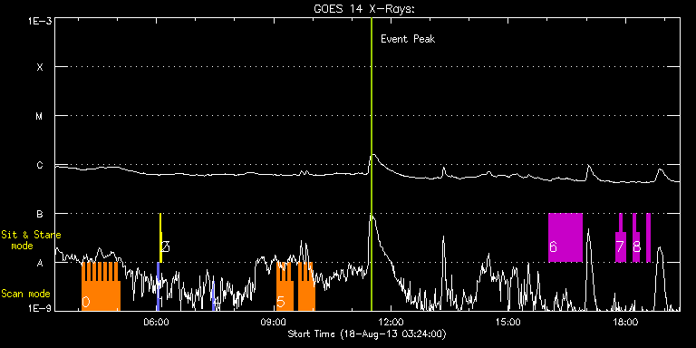 EIS Observation timeline overlay to GOES-Xray curve Code 1" 2" 40" 266" EIS Observations list for this event: STUDY ACRONYM ID DATE OBSERVED DESCRIPTION NOAA# TARGET 0 HH_Flare_162x152 | 35717 | 2013/08/18 04:05:13 | AR Observations | 1818 | Flare TIMELINE ID DATE OBSERVED FITS FILE XCEN (+W/-E) YCEN (+N/-S) DUR ----------------------------------------------------------------------------------------------------------------- 35717 | 2013/08/18 04:05:13.000 | eis_l0_20130818_040513.fits.gz | 525.47 | -205.75 | 4m11s 35717 | 2013/08/18 04:09:27.000 | eis_l0_20130818_040927.fits.gz | 526.09 | -205.67 | 4m10s 35717 | 2013/08/18 04:13:40.000 | eis_l0_20130818_041340.fits.gz | 526.55 | -205.59 | 4m11s 35717 | 2013/08/18 04:17:53.000 | eis_l0_20130818_041753.fits.gz | 527.17 | -205.51 | 4m11s 35717 | 2013/08/18 04:22:07.000 | eis_l0_20130818_042207.fits.gz | 527.56 | -205.44 | 4m11s 35717 | 2013/08/18 04:26:20.000 | eis_l0_20130818_042620.fits.gz | 528.17 | -205.36 | 4m11s 35717 | 2013/08/18 04:30:34.000 | eis_l0_20130818_043034.fits.gz | 528.79 | -205.51 | 4m10s 35717 | 2013/08/18 04:34:47.000 | eis_l0_20130818_043447.fits.gz | 529.33 | -205.36 | 4m11s 35717 | 2013/08/18 04:39:01.000 | eis_l0_20130818_043901.fits.gz | 529.80 | -205.28 | 4m10s 35717 | 2013/08/18 04:43:14.000 | eis_l0_20130818_044314.fits.gz | 530.41 | -205.28 | 4m11s 35717 | 2013/08/18 04:47:27.000 | eis_l0_20130818_044727.fits.gz | 530.88 | -205.51 | 4m11s 35717 | 2013/08/18 04:51:41.000 | eis_l0_20130818_045141.fits.gz | 531.42 | -205.36 | 4m10s 35717 | 2013/08/18 04:55:54.000 | eis_l0_20130818_045554.fits.gz | 531.80 | -205.05 | 4m11s 35717 | 2013/08/18 05:00:08.000 | eis_l0_20130818_050008.fits.gz | 532.50 | -205.13 | 4m10s 1 PRY_slot_contextLITE | 35684 | 2013/08/18 06:01:20 | Change of EIS pointing and alignment w | | Active Region TIMELINE ID DATE OBSERVED FITS FILE XCEN (+W/-E) YCEN (+N/-S) DUR ----------------------------------------------------------------------------------------------------------------- 35684 | 2013/08/18 06:01:20.000 | eis_l0_20130818_060120.fits.gz | -15.37 | -0.19 | 2m56s 2 Alignment_266 | 35685 | 2013/08/18 06:05:26 | Change of EIS pointing and alignment w | | Quiet Sun TIMELINE ID DATE OBSERVED FITS FILE XCEN (+W/-E) YCEN (+N/-S) DUR ----------------------------------------------------------------------------------------------------------------- 35685 | 2013/08/18 06:05:26.000 | eis_l0_20130818_060526.fits.gz | -132.57 | -0.42 | 1m23s 3 XRT_synop_AIA | 35686 | 2013/08/18 06:08:40 | Change of EIS pointing and alignment w | | Quiet Sun TIMELINE ID DATE OBSERVED FITS FILE XCEN (+W/-E) YCEN (+N/-S) DUR ----------------------------------------------------------------------------------------------------------------- 35686 | 2013/08/18 06:08:40.000 | eis_l0_20130818_060840.fits.gz | -132.49 | -0.50 | 10s 4 PRY_slot_context_v3 | 35718 | 2013/08/18 07:26:27 | EIS Spectral Atlas | 1817 | Active Region TIMELINE ID DATE OBSERVED FITS FILE XCEN (+W/-E) YCEN (+N/-S) DUR ----------------------------------------------------------------------------------------------------------------- 35718 | 2013/08/18 07:26:27.000 | eis_l0_20130818_072627.fits.gz | 536.49 | -203.66 | 2m56s 5 HH_Flare_162x152 | 35720 | 2013/08/18 09:04:14 | AR Observations | 1818 | Flare TIMELINE ID DATE OBSERVED FITS FILE XCEN (+W/-E) YCEN (+N/-S) DUR ----------------------------------------------------------------------------------------------------------------- 35720 | 2013/08/18 09:04:14.000 | eis_l0_20130818_090414.fits.gz | 562.78 | -202.73 | 4m10s 35720 | 2013/08/18 09:08:27.000 | eis_l0_20130818_090827.fits.gz | 563.17 | -202.58 | 4m11s 35720 | 2013/08/18 09:12:41.000 | eis_l0_20130818_091241.fits.gz | 563.78 | -202.58 | 4m11s 35720 | 2013/08/18 09:16:54.000 | eis_l0_20130818_091654.fits.gz | 564.40 | -202.43 | 4m11s 35720 | 2013/08/18 09:21:08.000 | eis_l0_20130818_092108.fits.gz | 564.87 | -202.66 | 4m10s 35720 | 2013/08/18 09:25:21.000 | eis_l0_20130818_092521.fits.gz | 565.33 | -202.58 | 4m11s 35720 | 2013/08/18 09:38:01.000 | eis_l0_20130818_093801.fits.gz | 566.80 | -202.27 | 4m11s 35720 | 2013/08/18 09:42:14.000 | eis_l0_20130818_094214.fits.gz | 567.34 | -202.27 | 4m11s 35720 | 2013/08/18 09:46:28.000 | eis_l0_20130818_094628.fits.gz | 567.96 | -202.27 | 4m11s 35720 | 2013/08/18 09:50:42.000 | eis_l0_20130818_095042.fits.gz | 568.42 | -202.19 | 4m11s 35720 | 2013/08/18 09:54:55.000 | eis_l0_20130818_095455.fits.gz | 568.81 | -202.12 | 4m11s 35720 | 2013/08/18 09:59:09.000 | eis_l0_20130818_095909.fits.gz | 569.35 | -202.04 | 4m11s 6 HPW002_QS_SAS_060m | 35706 | 2013/08/18 16:02:26 | CH velocity structure | | Quiet Sun TIMELINE ID DATE OBSERVED FITS FILE XCEN (+W/-E) YCEN (+N/-S) DUR ----------------------------------------------------------------------------------------------------------------- 35706 | 2013/08/18 16:02:26.000 | eis_l0_20130818_160226.fits.gz | 8.28 | -61.99 | 51m33s 7 HPW023_FULLCCD_V2 | 35707 | 2013/08/18 17:44:40 | CH velocity structure | | Quiet Sun TIMELINE ID DATE OBSERVED FITS FILE XCEN (+W/-E) YCEN (+N/-S) DUR ----------------------------------------------------------------------------------------------------------------- 35707 | 2013/08/18 17:44:40.000 | eis_l0_20130818_174440.fits.gz | 23.96 | -62.07 | 5m 35707 | 2013/08/18 17:50:07.000 | eis_l0_20130818_175007.fits.gz | 24.81 | -61.99 | 5m 35707 | 2013/08/18 17:55:35.000 | eis_l0_20130818_175535.fits.gz | 25.58 | -61.99 | 5m 8 HPW023_FULLCCD_V2 | 35708 | 2013/08/18 18:11:13 | CH velocity structure | | Quiet Sun TIMELINE ID DATE OBSERVED FITS FILE XCEN (+W/-E) YCEN (+N/-S) DUR ----------------------------------------------------------------------------------------------------------------- 35708 | 2013/08/18 18:11:13.000 | eis_l0_20130818_181113.fits.gz | 158.10 | -61.91 | 5m1s 35708 | 2013/08/18 18:16:41.000 | eis_l0_20130818_181641.fits.gz | 158.94 | -61.99 | 5m 35708 | 2013/08/18 18:33:02.000 | eis_l0_20130818_183302.fits.gz | 161.42 | -61.91 | 5m1s : 