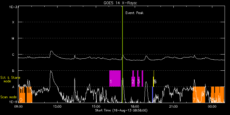 EIS Observation timeline overlay to GOES-Xray curve Code 1" 2" 40" 266" EIS Observations list for this event: STUDY ACRONYM ID DATE OBSERVED DESCRIPTION NOAA# TARGET 0 HH_Flare_162x152 | 35720 | 2013/08/18 09:04:14 | AR Observations | 1818 | Flare TIMELINE ID DATE OBSERVED FITS FILE XCEN (+W/-E) YCEN (+N/-S) DUR ----------------------------------------------------------------------------------------------------------------- 35720 | 2013/08/18 09:04:14.000 | eis_l0_20130818_090414.fits.gz | 562.78 | -202.73 | 4m10s 35720 | 2013/08/18 09:08:27.000 | eis_l0_20130818_090827.fits.gz | 563.17 | -202.58 | 4m11s 35720 | 2013/08/18 09:12:41.000 | eis_l0_20130818_091241.fits.gz | 563.78 | -202.58 | 4m11s 35720 | 2013/08/18 09:16:54.000 | eis_l0_20130818_091654.fits.gz | 564.40 | -202.43 | 4m11s 35720 | 2013/08/18 09:21:08.000 | eis_l0_20130818_092108.fits.gz | 564.87 | -202.66 | 4m10s 35720 | 2013/08/18 09:25:21.000 | eis_l0_20130818_092521.fits.gz | 565.33 | -202.58 | 4m11s 35720 | 2013/08/18 09:38:01.000 | eis_l0_20130818_093801.fits.gz | 566.80 | -202.27 | 4m11s 35720 | 2013/08/18 09:42:14.000 | eis_l0_20130818_094214.fits.gz | 567.34 | -202.27 | 4m11s 35720 | 2013/08/18 09:46:28.000 | eis_l0_20130818_094628.fits.gz | 567.96 | -202.27 | 4m11s 35720 | 2013/08/18 09:50:42.000 | eis_l0_20130818_095042.fits.gz | 568.42 | -202.19 | 4m11s 35720 | 2013/08/18 09:54:55.000 | eis_l0_20130818_095455.fits.gz | 568.81 | -202.12 | 4m11s 35720 | 2013/08/18 09:59:09.000 | eis_l0_20130818_095909.fits.gz | 569.35 | -202.04 | 4m11s 1 HPW002_QS_SAS_060m | 35706 | 2013/08/18 16:02:26 | CH velocity structure | | Quiet Sun TIMELINE ID DATE OBSERVED FITS FILE XCEN (+W/-E) YCEN (+N/-S) DUR ----------------------------------------------------------------------------------------------------------------- 35706 | 2013/08/18 16:02:26.000 | eis_l0_20130818_160226.fits.gz | 8.28 | -61.99 | 51m33s 2 HPW023_FULLCCD_V2 | 35707 | 2013/08/18 17:44:40 | CH velocity structure | | Quiet Sun TIMELINE ID DATE OBSERVED FITS FILE XCEN (+W/-E) YCEN (+N/-S) DUR ----------------------------------------------------------------------------------------------------------------- 35707 | 2013/08/18 17:44:40.000 | eis_l0_20130818_174440.fits.gz | 23.96 | -62.07 | 5m 35707 | 2013/08/18 17:50:07.000 | eis_l0_20130818_175007.fits.gz | 24.81 | -61.99 | 5m 35707 | 2013/08/18 17:55:35.000 | eis_l0_20130818_175535.fits.gz | 25.58 | -61.99 | 5m 3 HPW023_FULLCCD_V2 | 35708 | 2013/08/18 18:11:13 | CH velocity structure | | Quiet Sun TIMELINE ID DATE OBSERVED FITS FILE XCEN (+W/-E) YCEN (+N/-S) DUR ----------------------------------------------------------------------------------------------------------------- 35708 | 2013/08/18 18:11:13.000 | eis_l0_20130818_181113.fits.gz | 158.10 | -61.91 | 5m1s 35708 | 2013/08/18 18:16:41.000 | eis_l0_20130818_181641.fits.gz | 158.94 | -61.99 | 5m 35708 | 2013/08/18 18:33:02.000 | eis_l0_20130818_183302.fits.gz | 161.42 | -61.91 | 5m1s 4 PRY_slot_contextLITE | 35687 | 2013/08/18 19:21:34 | Change of EIS pointing and alignment w | | Active Region TIMELINE ID DATE OBSERVED FITS FILE XCEN (+W/-E) YCEN (+N/-S) DUR ----------------------------------------------------------------------------------------------------------------- 35687 | 2013/08/18 19:21:34.000 | eis_l0_20130818_192134.fits.gz | -15.29 | -0.50 | 2m56s 5 Alignment_266 | 35688 | 2013/08/18 19:25:26 | Change of EIS pointing and alignment w | | Quiet Sun TIMELINE ID DATE OBSERVED FITS FILE XCEN (+W/-E) YCEN (+N/-S) DUR ----------------------------------------------------------------------------------------------------------------- 35688 | 2013/08/18 19:25:26.000 | eis_l0_20130818_192526.fits.gz | -132.49 | -0.42 | 1m22s 6 XRT_synop_AIA | 35689 | 2013/08/18 19:28:40 | Change of EIS pointing and alignment w | | Quiet Sun TIMELINE ID DATE OBSERVED FITS FILE XCEN (+W/-E) YCEN (+N/-S) DUR ----------------------------------------------------------------------------------------------------------------- 35689 | 2013/08/18 19:28:40.000 | eis_l0_20130818_192840.fits.gz | -132.49 | -0.42 | 10s 7 DRW_Alf_01 | 35701 | 2013/08/18 22:29:20 | Coordinated Observations with Hida Obs | | Active Region TIMELINE ID DATE OBSERVED FITS FILE XCEN (+W/-E) YCEN (+N/-S) DUR ----------------------------------------------------------------------------------------------------------------- 35701 | 2013/08/18 22:29:20.000 | eis_l0_20130818_222920.fits.gz | 819.28 | -365.80 | 1m9s 35701 | 2013/08/18 22:30:31.000 | eis_l0_20130818_223031.fits.gz | 819.28 | -365.88 | 1m9s 35701 | 2013/08/18 22:31:42.000 | eis_l0_20130818_223142.fits.gz | 819.20 | -365.73 | 1m9s 35701 | 2013/08/18 22:32:54.000 | eis_l0_20130818_223254.fits.gz | 819.20 | -365.80 | 1m8s 35701 | 2013/08/18 22:34:05.000 | eis_l0_20130818_223405.fits.gz | 819.28 | -365.96 | 1m8s 35701 | 2013/08/18 22:35:16.000 | eis_l0_20130818_223516.fits.gz | 819.20 | -365.80 | 1m9s 35701 | 2013/08/18 22:36:28.000 | eis_l0_20130818_223628.fits.gz | 819.12 | -365.80 | 1m8s 35701 | 2013/08/18 22:37:39.000 | eis_l0_20130818_223739.fits.gz | 819.20 | -365.88 | 1m9s 35701 | 2013/08/18 22:38:50.000 | eis_l0_20130818_223850.fits.gz | 819.20 | -365.88 | 1m9s 35701 | 2013/08/18 22:40:02.000 | eis_l0_20130818_224002.fits.gz | 819.20 | -365.80 | 1m8s 35701 | 2013/08/18 22:41:13.000 | eis_l0_20130818_224113.fits.gz | 819.28 | -365.80 | 1m8s 35701 | 2013/08/18 22:42:24.000 | eis_l0_20130818_224224.fits.gz | 819.20 | -365.88 | 1m9s 35701 | 2013/08/18 22:43:35.000 | eis_l0_20130818_224335.fits.gz | 819.20 | -365.88 | 1m9s 35701 | 2013/08/18 22:44:46.000 | eis_l0_20130818_224446.fits.gz | 819.12 | -365.73 | 1m9s 35701 | 2013/08/18 22:45:58.000 | eis_l0_20130818_224558.fits.gz | 819.20 | -365.73 | 1m8s 35701 | 2013/08/18 22:47:09.000 | eis_l0_20130818_224709.fits.gz | 819.20 | -365.88 | 1m8s 35701 | 2013/08/18 22:48:20.000 | eis_l0_20130818_224820.fits.gz | 819.12 | -365.73 | 1m8s 35701 | 2013/08/18 22:49:31.000 | eis_l0_20130818_224931.fits.gz | 819.20 | -365.80 | 1m8s 