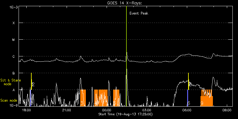 EIS Observation timeline overlay to GOES-Xray curve Code 1" 2" 40" 266" EIS Observations list for this event: STUDY ACRONYM ID DATE OBSERVED DESCRIPTION NOAA# TARGET 0 PRY_slot_contextLITE | 35693 | 2013/08/19 18:16:20 | Change of EIS pointing and alignment w | 1822 | Active Region TIMELINE ID DATE OBSERVED FITS FILE XCEN (+W/-E) YCEN (+N/-S) DUR ----------------------------------------------------------------------------------------------------------------- 35693 | 2013/08/19 18:16:20.000 | eis_l0_20130819_181620.fits.gz | -15.21 | -0.19 | 2m56s 1 Alignment_266 | 35694 | 2013/08/19 18:20:26 | Change of EIS pointing and alignment w | 1822 | Quiet Sun TIMELINE ID DATE OBSERVED FITS FILE XCEN (+W/-E) YCEN (+N/-S) DUR ----------------------------------------------------------------------------------------------------------------- 35694 | 2013/08/19 18:20:26.000 | eis_l0_20130819_182026.fits.gz | -132.57 | -0.35 | 1m22s 2 XRT_synop_AIA | 35695 | 2013/08/19 18:23:39 | Change of EIS pointing and alignment w | 1822 | Quiet Sun TIMELINE ID DATE OBSERVED FITS FILE XCEN (+W/-E) YCEN (+N/-S) DUR ----------------------------------------------------------------------------------------------------------------- 35695 | 2013/08/19 18:23:39.000 | eis_l0_20130819_182339.fits.gz | -132.49 | -0.42 | 11s 3 DRW_Alf_01 | 35703 | 2013/08/19 22:01:19 | Coordinated Observations with Hida Obs | | Active Region TIMELINE ID DATE OBSERVED FITS FILE XCEN (+W/-E) YCEN (+N/-S) DUR ----------------------------------------------------------------------------------------------------------------- 35703 | 2013/08/19 22:01:19.000 | eis_l0_20130819_220119.fits.gz | 793.17 | -159.40 | 1m9s 35703 | 2013/08/19 22:02:31.000 | eis_l0_20130819_220231.fits.gz | 793.25 | -159.24 | 1m8s 35703 | 2013/08/19 22:03:41.000 | eis_l0_20130819_220341.fits.gz | 793.32 | -159.17 | 1m9s 35703 | 2013/08/19 22:04:52.000 | eis_l0_20130819_220452.fits.gz | 793.48 | -159.17 | 1m9s 35703 | 2013/08/19 22:06:04.000 | eis_l0_20130819_220604.fits.gz | 793.48 | -159.32 | 1m8s 35703 | 2013/08/19 22:07:15.000 | eis_l0_20130819_220715.fits.gz | 793.63 | -159.17 | 1m8s 35703 | 2013/08/19 22:08:26.000 | eis_l0_20130819_220826.fits.gz | 793.79 | -159.17 | 1m8s 35703 | 2013/08/19 22:09:37.000 | eis_l0_20130819_220937.fits.gz | 793.94 | -159.32 | 1m9s 35703 | 2013/08/19 22:10:49.000 | eis_l0_20130819_221049.fits.gz | 794.02 | -159.01 | 1m8s 35703 | 2013/08/19 22:12:00.000 | eis_l0_20130819_221200.fits.gz | 794.17 | -159.17 | 1m9s 35703 | 2013/08/19 22:13:11.000 | eis_l0_20130819_221311.fits.gz | 794.17 | -159.24 | 1m9s 35703 | 2013/08/19 22:14:23.000 | eis_l0_20130819_221423.fits.gz | 794.25 | -159.09 | 1m8s 35703 | 2013/08/19 22:15:34.000 | eis_l0_20130819_221534.fits.gz | 794.25 | -159.09 | 1m8s 35703 | 2013/08/19 22:16:45.000 | eis_l0_20130819_221645.fits.gz | 794.41 | -159.17 | 1m9s 35703 | 2013/08/19 22:17:57.000 | eis_l0_20130819_221757.fits.gz | 794.48 | -159.09 | 1m8s 35703 | 2013/08/19 22:19:08.000 | eis_l0_20130819_221908.fits.gz | 794.64 | -159.17 | 1m8s 35703 | 2013/08/19 22:20:19.000 | eis_l0_20130819_222019.fits.gz | 794.71 | -159.01 | 1m8s 35703 | 2013/08/19 22:21:30.000 | eis_l0_20130819_222130.fits.gz | 794.79 | -159.01 | 1m9s 35703 | 2013/08/19 22:22:42.000 | eis_l0_20130819_222242.fits.gz | 794.95 | -159.01 | 1m8s 35703 | 2013/08/19 22:23:53.000 | eis_l0_20130819_222353.fits.gz | 795.02 | -159.01 | 1m8s 35703 | 2013/08/19 22:25:04.000 | eis_l0_20130819_222504.fits.gz | 795.10 | -159.09 | 1m8s 4 DRW_Alf_01 | 35704 | 2013/08/19 23:04:40 | Coordinated Observations with Hida Obs | | Active Region TIMELINE ID DATE OBSERVED FITS FILE XCEN (+W/-E) YCEN (+N/-S) DUR ----------------------------------------------------------------------------------------------------------------- 35704 | 2013/08/19 23:04:40.000 | eis_l0_20130819_230440.fits.gz | 798.27 | -158.39 | 1m8s 35704 | 2013/08/19 23:05:51.000 | eis_l0_20130819_230551.fits.gz | 798.42 | -158.32 | 1m9s 35704 | 2013/08/19 23:07:03.000 | eis_l0_20130819_230703.fits.gz | 798.50 | -158.32 | 1m8s 35704 | 2013/08/19 23:08:14.000 | eis_l0_20130819_230814.fits.gz | 798.73 | -158.39 | 1m8s 35704 | 2013/08/19 23:09:25.000 | eis_l0_20130819_230925.fits.gz | 798.73 | -158.39 | 1m8s 35704 | 2013/08/19 23:10:36.000 | eis_l0_20130819_231036.fits.gz | 798.81 | -158.39 | 1m9s 35704 | 2013/08/19 23:11:47.000 | eis_l0_20130819_231147.fits.gz | 798.96 | -158.32 | 1m9s 35704 | 2013/08/19 23:12:59.000 | eis_l0_20130819_231259.fits.gz | 798.96 | -158.16 | 1m8s 35704 | 2013/08/19 23:14:10.000 | eis_l0_20130819_231410.fits.gz | 799.04 | -158.24 | 1m8s 35704 | 2013/08/19 23:15:21.000 | eis_l0_20130819_231521.fits.gz | 799.19 | -158.24 | 1m8s 35704 | 2013/08/19 23:16:32.000 | eis_l0_20130819_231632.fits.gz | 799.19 | -158.16 | 1m9s 35704 | 2013/08/19 23:17:44.000 | eis_l0_20130819_231744.fits.gz | 799.35 | -158.16 | 1m8s 35704 | 2013/08/19 23:18:55.000 | eis_l0_20130819_231855.fits.gz | 799.50 | -158.16 | 1m8s 35704 | 2013/08/19 23:20:06.000 | eis_l0_20130819_232006.fits.gz | 799.50 | -158.09 | 1m8s 35704 | 2013/08/19 23:23:39.000 | eis_l0_20130819_232339.fits.gz | 799.89 | -158.16 | 1m9s 35704 | 2013/08/19 23:24:50.000 | eis_l0_20130819_232450.fits.gz | 799.97 | -158.01 | 1m9s 35704 | 2013/08/19 23:26:01.000 | eis_l0_20130819_232601.fits.gz | 800.12 | -158.09 | 1m9s 35704 | 2013/08/19 23:27:13.000 | eis_l0_20130819_232713.fits.gz | 800.12 | -157.93 | 1m8s 35704 | 2013/08/19 23:28:24.000 | eis_l0_20130819_232824.fits.gz | 800.35 | -158.01 | 1m8s 35704 | 2013/08/19 23:29:35.000 | eis_l0_20130819_232935.fits.gz | 800.35 | -157.93 | 1m8s 35704 | 2013/08/19 23:30:46.000 | eis_l0_20130819_233046.fits.gz | 800.43 | -157.93 | 1m8s 35704 | 2013/08/19 23:31:57.000 | eis_l0_20130819_233157.fits.gz | 800.51 | -157.93 | 1m8s 35704 | 2013/08/19 23:33:08.000 | eis_l0_20130819_233308.fits.gz | 800.66 | -157.93 | 1m9s 35704 | 2013/08/19 23:34:19.000 | eis_l0_20130819_233419.fits.gz | 800.74 | -157.93 | 1m9s 35704 | 2013/08/19 23:35:31.000 | ei