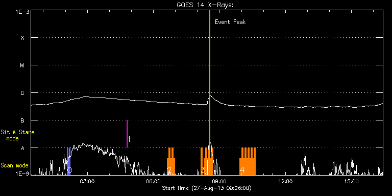 EIS Observation timeline overlay to GOES-Xray curve Code 1" 2" 40" 266" EIS Observations list for this event: STUDY ACRONYM ID DATE OBSERVED DESCRIPTION NOAA# TARGET 0 PRY_slot_context_v2 | 35964 | 2013/08/27 02:05:20 | HOP173 filament at south (for eduatio | | Active Region TIMELINE ID DATE OBSERVED FITS FILE XCEN (+W/-E) YCEN (+N/-S) DUR ----------------------------------------------------------------------------------------------------------------- 35964 | 2013/08/27 02:05:20.000 | eis_l0_20130827_020520.fits.gz | -180.63 | -677.96 | 2m33s 35964 | 2013/08/27 02:07:57.000 | eis_l0_20130827_020757.fits.gz | -180.32 | -677.81 | 2m33s 35964 | 2013/08/27 02:10:34.000 | eis_l0_20130827_021034.fits.gz | -180.09 | -677.88 | 2m33s 1 regcal074 | 35942 | 2013/08/27 04:47:35 | Dark exposures including overscan pixe | | Engineering TIMELINE ID DATE OBSERVED FITS FILE XCEN (+W/-E) YCEN (+N/-S) DUR ----------------------------------------------------------------------------------------------------------------- 35942 | 2013/08/27 04:47:35.000 | eis_l0_20130827_044735.fits.gz | 420.14 | 335.43 | 3m22s 2 HH_Flare_162x152 | 35947 | 2013/08/27 06:37:01 | AR 11828 raster scan obs | | Flare TIMELINE ID DATE OBSERVED FITS FILE XCEN (+W/-E) YCEN (+N/-S) DUR ----------------------------------------------------------------------------------------------------------------- 35947 | 2013/08/27 06:37:01.000 | eis_l0_20130827_063701.fits.gz | 419.10 | 130.20 | 4m10s 35947 | 2013/08/27 06:41:14.000 | eis_l0_20130827_064114.fits.gz | 419.64 | 130.28 | 4m11s 35947 | 2013/08/27 06:45:28.000 | eis_l0_20130827_064528.fits.gz | 420.18 | 130.28 | 4m10s 35947 | 2013/08/27 06:49:41.000 | eis_l0_20130827_064941.fits.gz | 420.88 | 130.28 | 4m10s 35947 | 2013/08/27 06:53:54.000 | eis_l0_20130827_065354.fits.gz | 421.34 | 130.51 | 4m11s 3 HH_Flare_162x152 | 35948 | 2013/08/27 08:09:11 | AR 11828 raster scan obs | | Flare TIMELINE ID DATE OBSERVED FITS FILE XCEN (+W/-E) YCEN (+N/-S) DUR ----------------------------------------------------------------------------------------------------------------- 35948 | 2013/08/27 08:09:11.000 | eis_l0_20130827_080911.fits.gz | 431.15 | 131.05 | 4m11s 35948 | 2013/08/27 08:17:38.000 | eis_l0_20130827_081738.fits.gz | 432.23 | 131.28 | 4m11s 35948 | 2013/08/27 08:21:51.000 | eis_l0_20130827_082151.fits.gz | 432.85 | 131.13 | 4m11s 35948 | 2013/08/27 08:26:05.000 | eis_l0_20130827_082605.fits.gz | 433.39 | 131.05 | 4m10s 35948 | 2013/08/27 08:30:18.000 | eis_l0_20130827_083018.fits.gz | 434.01 | 131.21 | 4m11s 35948 | 2013/08/27 08:34:31.000 | eis_l0_20130827_083431.fits.gz | 434.47 | 131.28 | 4m11s 35948 | 2013/08/27 08:38:45.000 | eis_l0_20130827_083845.fits.gz | 435.09 | 131.28 | 4m11s 4 HH_Flare_162x152 | 35955 | 2013/08/27 09:55:42 | AR 11828 raster scan obs | | Flare TIMELINE ID DATE OBSERVED FITS FILE XCEN (+W/-E) YCEN (+N/-S) DUR ----------------------------------------------------------------------------------------------------------------- 35955 | 2013/08/27 09:55:42.000 | eis_l0_20130827_095542.fits.gz | 445.13 | 131.90 | 4m10s 35955 | 2013/08/27 09:59:55.000 | eis_l0_20130827_095955.fits.gz | 445.52 | 131.90 | 4m11s 35955 | 2013/08/27 10:04:09.000 | eis_l0_20130827_100409.fits.gz | 446.14 | 132.13 | 4m10s 35955 | 2013/08/27 10:08:22.000 | eis_l0_20130827_100822.fits.gz | 446.68 | 131.98 | 4m10s 35955 | 2013/08/27 10:12:35.000 | eis_l0_20130827_101235.fits.gz | 447.22 | 132.13 | 4m11s 35955 | 2013/08/27 10:16:48.000 | eis_l0_20130827_101648.fits.gz | 447.76 | 132.06 | 4m11s 35955 | 2013/08/27 10:21:02.000 | eis_l0_20130827_102102.fits.gz | 448.30 | 132.06 | 4m10s 35955 | 2013/08/27 10:25:15.000 | eis_l0_20130827_102515.fits.gz | 448.92 | 132.21 | 4m11s 35955 | 2013/08/27 10:29:29.000 | eis_l0_20130827_102929.fits.gz | 449.38 | 132.29 | 4m10s 35955 | 2013/08/27 10:33:42.000 | eis_l0_20130827_103342.fits.gz | 449.92 | 132.37 | 4m10s : Check study information : Download file : View thumbnails For this event, also check for: