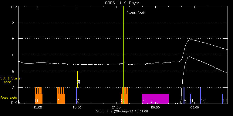 EIS Observation timeline overlay to GOES-Xray curve Code 1" 2" 40" 266" EIS Observations list for this event: STUDY ACRONYM ID DATE OBSERVED DESCRIPTION NOAA# TARGET 0 HH_Flare_162x152 | 35995 | 2013/08/29 14:47:43 | AR 11836 tracking obs (HOP236, IRIS) | 1836 | Flare TIMELINE ID DATE OBSERVED FITS FILE XCEN (+W/-E) YCEN (+N/-S) DUR ----------------------------------------------------------------------------------------------------------------- 35995 | 2013/08/29 14:47:43.000 | eis_l0_20130829_144743.fits.gz | -693.19 | 110.76 | 4m11s 35995 | 2013/08/29 14:51:57.000 | eis_l0_20130829_145157.fits.gz | -692.80 | 110.68 | 4m10s 35995 | 2013/08/29 14:56:10.000 | eis_l0_20130829_145610.fits.gz | -692.26 | 110.45 | 4m11s 35995 | 2013/08/29 15:00:24.000 | eis_l0_20130829_150024.fits.gz | -691.80 | 110.29 | 4m10s 35995 | 2013/08/29 15:04:37.000 | eis_l0_20130829_150437.fits.gz | -691.41 | 110.37 | 4m11s 35995 | 2013/08/29 15:08:50.000 | eis_l0_20130829_150850.fits.gz | -691.03 | 110.45 | 4m11s 35995 | 2013/08/29 15:13:04.000 | eis_l0_20130829_151304.fits.gz | -690.64 | 110.22 | 4m11s 35995 | 2013/08/29 15:17:17.000 | eis_l0_20130829_151717.fits.gz | -690.18 | 110.14 | 4m11s 1 HH_Flare_162x152 | 35996 | 2013/08/29 16:30:33 | AR 11836 tracking obs (HOP236, IRIS) | | Flare TIMELINE ID DATE OBSERVED FITS FILE XCEN (+W/-E) YCEN (+N/-S) DUR ----------------------------------------------------------------------------------------------------------------- 35996 | 2013/08/29 16:30:33.000 | eis_l0_20130829_163033.fits.gz | -682.76 | 109.21 | 4m11s 35996 | 2013/08/29 16:34:47.000 | eis_l0_20130829_163447.fits.gz | -682.37 | 109.14 | 4m10s 35996 | 2013/08/29 16:39:00.000 | eis_l0_20130829_163900.fits.gz | -681.91 | 109.21 | 4m11s 35996 | 2013/08/29 16:43:14.000 | eis_l0_20130829_164314.fits.gz | -681.52 | 108.98 | 4m10s 35996 | 2013/08/29 16:47:27.000 | eis_l0_20130829_164727.fits.gz | -680.98 | 108.90 | 4m11s 35996 | 2013/08/29 16:51:41.000 | eis_l0_20130829_165141.fits.gz | -680.52 | 108.90 | 4m10s 35996 | 2013/08/29 16:55:54.000 | eis_l0_20130829_165554.fits.gz | -680.21 | 108.90 | 4m11s 35996 | 2013/08/29 17:00:07.000 | eis_l0_20130829_170007.fits.gz | -679.75 | 108.83 | 4m11s 2 PRY_slot_contextLITE | 35967 | 2013/08/29 17:56:20 | EIS-AIA alignment | | Active Region TIMELINE ID DATE OBSERVED FITS FILE XCEN (+W/-E) YCEN (+N/-S) DUR ----------------------------------------------------------------------------------------------------------------- 35967 | 2013/08/29 17:56:20.000 | eis_l0_20130829_175620.fits.gz | -15.21 | -0.50 | 2m57s 3 Alignment_266 | 35968 | 2013/08/29 17:59:35 | EIS-AIA alignment | | Quiet Sun TIMELINE ID DATE OBSERVED FITS FILE XCEN (+W/-E) YCEN (+N/-S) DUR ----------------------------------------------------------------------------------------------------------------- 35968 | 2013/08/29 17:59:35.000 | eis_l0_20130829_175935.fits.gz | -132.57 | -0.50 | 1m22s 4 XRT_synop_AIA | 35969 | 2013/08/29 18:02:09 | EIS-AIA alignment | | Quiet Sun TIMELINE ID DATE OBSERVED FITS FILE XCEN (+W/-E) YCEN (+N/-S) DUR ----------------------------------------------------------------------------------------------------------------- 35969 | 2013/08/29 18:02:09.000 | eis_l0_20130829_180209.fits.gz | -132.49 | -0.42 | 11s 5 Alignment_266_01 | 35970 | 2013/08/29 18:02:25 | checking EIS-AIA offset accuracy obs | | Quiet Sun TIMELINE ID DATE OBSERVED FITS FILE XCEN (+W/-E) YCEN (+N/-S) DUR ----------------------------------------------------------------------------------------------------------------- 35970 | 2013/08/29 18:02:25.000 | eis_l0_20130829_180225.fits.gz | -132.57 | -5.50 | 20s 35970 | 2013/08/29 18:02:56.000 | eis_l0_20130829_180256.fits.gz | -132.49 | -5.50 | 21s 35970 | 2013/08/29 18:03:28.000 | eis_l0_20130829_180328.fits.gz | -132.57 | -5.42 | 20s 35970 | 2013/08/29 18:04:00.000 | eis_l0_20130829_180400.fits.gz | -132.57 | -5.42 | 20s 35970 | 2013/08/29 18:04:31.000 | eis_l0_20130829_180431.fits.gz | -132.57 | -5.35 | 20s 6 HH_Flare_162x152 | 35999 | 2013/08/29 21:20:55 | AR 11836 tracking obs | | Flare TIMELINE ID DATE OBSERVED FITS FILE XCEN (+W/-E) YCEN (+N/-S) DUR ----------------------------------------------------------------------------------------------------------------- 35999 | 2013/08/29 21:20:55.000 | eis_l0_20130829_212055.fits.gz | -671.79 | 71.21 | 4m10s 35999 | 2013/08/29 21:25:08.000 | eis_l0_20130829_212508.fits.gz | -671.41 | 71.13 | 4m11s 35999 | 2013/08/29 21:29:22.000 | eis_l0_20130829_212922.fits.gz | -670.94 | 71.13 | 4m10s 35999 | 2013/08/29 21:33:35.000 | eis_l0_20130829_213335.fits.gz | -670.40 | 71.13 | 4m10s 35999 | 2013/08/29 21:37:48.000 | eis_l0_20130829_213748.fits.gz | -670.09 | 71.13 | 4m11s 35999 | 2013/08/29 21:42:02.000 | eis_l0_20130829_214202.fits.gz | -669.63 | 70.90 | 4m10s 35999 | 2013/08/29 21:46:15.000 | eis_l0_20130829_214615.fits.gz | -669.09 | 70.90 | 4m11s 35999 | 2013/08/29 21:50:28.000 | eis_l0_20130829_215028.fits.gz | -668.62 | 70.90 | 4m11s 7 HPW021_VEL_240x512v1 | 35986 | 2013/08/29 22:57:14 | AR 11836 tracking obs | 1836 | Active Region TIMELINE ID DATE OBSERVED FITS FILE XCEN (+W/-E) YCEN (+N/-S) DUR ----------------------------------------------------------------------------------------------------------------- 35986 | 2013/08/29 22:57:14.000 | eis_l0_20130829_225714.fits.gz | -660.86 | 70.05 | 2h3m47s 8 PRY_slot_context_v3 | 35974 | 2013/08/30 02:09:44 | HOP173 SE-limb | | Active Region TIMELINE ID DATE OBSERVED FITS FILE XCEN (+W/-E) YCEN (+N/-S) DUR ----------------------------------------------------------------------------------------------------------------- 35974 | 2013/08/30 02:09:44.000 | eis_l0_20130830_020944.fits.gz | -820.21 | -520.59 | 2m57s 9 PRY_slot_context_v3 | 35975 | 2013/08/30 02:39:15 | HOP173 SE-limb | | Active Region TIMELINE ID DATE OBSERVED FITS FILE XCEN (+W/-E) YCEN (+N/-S) DUR ----------------------------------------------------------------------------------------------------------------- 35975 | 2013/08/30 02: