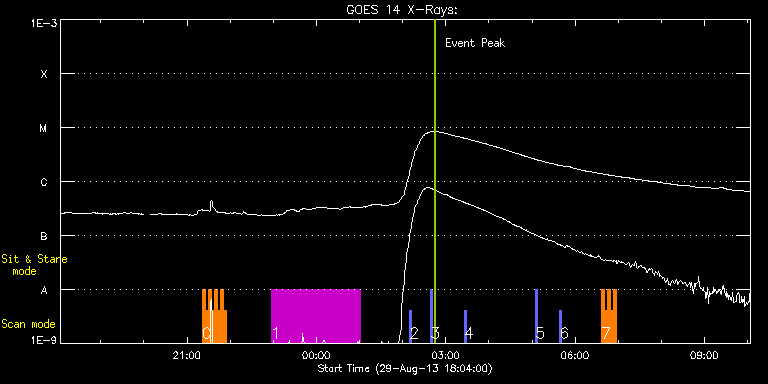EIS Observation timeline overlay to GOES-Xray curve Code 1" 2" 40" 266" EIS Observations list for this event: STUDY ACRONYM ID DATE OBSERVED DESCRIPTION NOAA# TARGET 0 HH_Flare_162x152 | 35999 | 2013/08/29 21:20:55 | AR 11836 tracking obs | | Flare TIMELINE ID DATE OBSERVED FITS FILE XCEN (+W/-E) YCEN (+N/-S) DUR ----------------------------------------------------------------------------------------------------------------- 35999 | 2013/08/29 21:20:55.000 | eis_l0_20130829_212055.fits.gz | -671.79 | 71.21 | 4m10s 35999 | 2013/08/29 21:25:08.000 | eis_l0_20130829_212508.fits.gz | -671.41 | 71.13 | 4m11s 35999 | 2013/08/29 21:29:22.000 | eis_l0_20130829_212922.fits.gz | -670.94 | 71.13 | 4m10s 35999 | 2013/08/29 21:33:35.000 | eis_l0_20130829_213335.fits.gz | -670.40 | 71.13 | 4m10s 35999 | 2013/08/29 21:37:48.000 | eis_l0_20130829_213748.fits.gz | -670.09 | 71.13 | 4m11s 35999 | 2013/08/29 21:42:02.000 | eis_l0_20130829_214202.fits.gz | -669.63 | 70.90 | 4m10s 35999 | 2013/08/29 21:46:15.000 | eis_l0_20130829_214615.fits.gz | -669.09 | 70.90 | 4m11s 35999 | 2013/08/29 21:50:28.000 | eis_l0_20130829_215028.fits.gz | -668.62 | 70.90 | 4m11s 1 HPW021_VEL_240x512v1 | 35986 | 2013/08/29 22:57:14 | AR 11836 tracking obs | 1836 | Active Region TIMELINE ID DATE OBSERVED FITS FILE XCEN (+W/-E) YCEN (+N/-S) DUR ----------------------------------------------------------------------------------------------------------------- 35986 | 2013/08/29 22:57:14.000 | eis_l0_20130829_225714.fits.gz | -660.86 | 70.05 | 2h3m47s 2 PRY_slot_context_v3 | 35974 | 2013/08/30 02:09:44 | HOP173 SE-limb | | Active Region TIMELINE ID DATE OBSERVED FITS FILE XCEN (+W/-E) YCEN (+N/-S) DUR ----------------------------------------------------------------------------------------------------------------- 35974 | 2013/08/30 02:09:44.000 | eis_l0_20130830_020944.fits.gz | -820.21 | -520.59 | 2m57s 3 PRY_slot_context_v3 | 35975 | 2013/08/30 02:39:15 | HOP173 SE-limb | | Active Region TIMELINE ID DATE OBSERVED FITS FILE XCEN (+W/-E) YCEN (+N/-S) DUR ----------------------------------------------------------------------------------------------------------------- 35975 | 2013/08/30 02:39:15.000 | eis_l0_20130830_023915.fits.gz | -820.13 | -520.59 | 2m56s 4 PRY_slot_context_v3 | 35976 | 2013/08/30 03:25:42 | HOP173 SE-limb | | Active Region TIMELINE ID DATE OBSERVED FITS FILE XCEN (+W/-E) YCEN (+N/-S) DUR ----------------------------------------------------------------------------------------------------------------- 35976 | 2013/08/30 03:25:42.000 | eis_l0_20130830_032542.fits.gz | -820.13 | -520.66 | 2m57s 5 PRY_slot_context_v3 | 35977 | 2013/08/30 05:05:13 | AR11835 (HOP173) | 1835 | Active Region TIMELINE ID DATE OBSERVED FITS FILE XCEN (+W/-E) YCEN (+N/-S) DUR ----------------------------------------------------------------------------------------------------------------- 35977 | 2013/08/30 05:05:13.000 | eis_l0_20130830_050513.fits.gz | -229.34 | -313.87 | 2m56s 6 PRY_slot_context_v3 | 35978 | 2013/08/30 05:38:23 | AR11835 (HOP173) | 1835 | Active Region TIMELINE ID DATE OBSERVED FITS FILE XCEN (+W/-E) YCEN (+N/-S) DUR ----------------------------------------------------------------------------------------------------------------- 35978 | 2013/08/30 05:38:23.000 | eis_l0_20130830_053823.fits.gz | -224.48 | -314.10 | 2m56s 7 HH_Flare_162x152 | 35984 | 2013/08/30 06:37:03 | AR 11836 tracking obs (HOP236, IRIS) | 1836 | Flare TIMELINE ID DATE OBSERVED FITS FILE XCEN (+W/-E) YCEN (+N/-S) DUR ----------------------------------------------------------------------------------------------------------------- 35984 | 2013/08/30 06:37:03.000 | eis_l0_20130830_063703.fits.gz | -590.45 | 98.32 | 4m10s 35984 | 2013/08/30 06:41:16.000 | eis_l0_20130830_064116.fits.gz | -589.91 | 98.24 | 4m11s 35984 | 2013/08/30 06:45:30.000 | eis_l0_20130830_064530.fits.gz | -589.52 | 98.24 | 4m10s 35984 | 2013/08/30 06:49:43.000 | eis_l0_20130830_064943.fits.gz | -589.06 | 98.24 | 4m11s 35984 | 2013/08/30 06:53:57.000 | eis_l0_20130830_065357.fits.gz | -588.52 | 98.09 | 4m10s : Check study information : Download file : View thumbnails For this event, also check for: