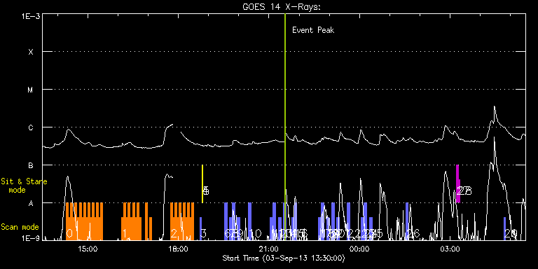 EIS Observation timeline overlay to GOES-Xray curve Code 1" 2" 40" 266" EIS Observations list for this event: STUDY ACRONYM ID DATE OBSERVED DESCRIPTION NOAA# TARGET 0 HH_Flare_162x152 | 36082 | 2013/09/03 14:17:43 | HOP236 - Collaboration with IRIS-SST o | | Flare TIMELINE ID DATE OBSERVED FITS FILE XCEN (+W/-E) YCEN (+N/-S) DUR ----------------------------------------------------------------------------------------------------------------- 36082 | 2013/09/03 14:17:43.000 | eis_l0_20130903_141743.fits.gz | 281.48 | 93.43 | 4m10s 36082 | 2013/09/03 14:21:56.000 | eis_l0_20130903_142156.fits.gz | 282.10 | 93.35 | 4m11s 36082 | 2013/09/03 14:26:10.000 | eis_l0_20130903_142610.fits.gz | 282.72 | 93.43 | 4m10s 36082 | 2013/09/03 14:30:23.000 | eis_l0_20130903_143023.fits.gz | 283.26 | 93.27 | 4m11s 36082 | 2013/09/03 14:34:36.000 | eis_l0_20130903_143436.fits.gz | 283.95 | 93.43 | 4m11s 36082 | 2013/09/03 14:38:50.000 | eis_l0_20130903_143850.fits.gz | 284.49 | 93.27 | 4m11s 36082 | 2013/09/03 14:43:03.000 | eis_l0_20130903_144303.fits.gz | 285.11 | 93.35 | 4m11s 36082 | 2013/09/03 14:47:17.000 | eis_l0_20130903_144717.fits.gz | 285.73 | 93.43 | 4m10s 36082 | 2013/09/03 14:51:30.000 | eis_l0_20130903_145130.fits.gz | 286.35 | 93.50 | 4m11s 36082 | 2013/09/03 14:55:44.000 | eis_l0_20130903_145544.fits.gz | 286.97 | 93.66 | 4m10s 36082 | 2013/09/03 14:59:57.000 | eis_l0_20130903_145957.fits.gz | 287.66 | 93.43 | 4m11s 36082 | 2013/09/03 15:04:11.000 | eis_l0_20130903_150411.fits.gz | 288.20 | 93.43 | 4m10s 36082 | 2013/09/03 15:08:24.000 | eis_l0_20130903_150824.fits.gz | 288.74 | 93.50 | 4m10s 36082 | 2013/09/03 15:12:37.000 | eis_l0_20130903_151237.fits.gz | 289.36 | 93.50 | 4m11s 36082 | 2013/09/03 15:16:51.000 | eis_l0_20130903_151651.fits.gz | 289.98 | 93.58 | 4m10s 36082 | 2013/09/03 15:21:04.000 | eis_l0_20130903_152104.fits.gz | 290.67 | 93.66 | 4m11s 36082 | 2013/09/03 15:25:18.000 | eis_l0_20130903_152518.fits.gz | 291.21 | 93.74 | 4m10s 1 HH_Flare_162x152 | 36083 | 2013/09/03 16:07:43 | HOP236 - Collaboration with IRIS-SST o | | Flare TIMELINE ID DATE OBSERVED FITS FILE XCEN (+W/-E) YCEN (+N/-S) DUR ----------------------------------------------------------------------------------------------------------------- 36083 | 2013/09/03 16:07:43.000 | eis_l0_20130903_160743.fits.gz | 297.24 | 93.89 | 4m11s 36083 | 2013/09/03 16:11:57.000 | eis_l0_20130903_161157.fits.gz | 297.86 | 93.97 | 4m10s 36083 | 2013/09/03 16:16:10.000 | eis_l0_20130903_161610.fits.gz | 298.55 | 93.81 | 4m11s 36083 | 2013/09/03 16:20:23.000 | eis_l0_20130903_162023.fits.gz | 299.17 | 93.89 | 4m11s 36083 | 2013/09/03 16:24:37.000 | eis_l0_20130903_162437.fits.gz | 299.71 | 93.97 | 4m10s 36083 | 2013/09/03 16:28:50.000 | eis_l0_20130903_162850.fits.gz | 300.33 | 93.97 | 4m11s 36083 | 2013/09/03 16:33:04.000 | eis_l0_20130903_163304.fits.gz | 300.95 | 93.97 | 4m10s 36083 | 2013/09/03 16:37:17.000 | eis_l0_20130903_163717.fits.gz | 301.57 | 94.12 | 4m11s 36083 | 2013/09/03 16:41:31.000 | eis_l0_20130903_164131.fits.gz | 302.18 | 94.12 | 4m10s 36083 | 2013/09/03 16:54:11.000 | eis_l0_20130903_165411.fits.gz | 304.04 | 94.04 | 4m10s 36083 | 2013/09/03 17:02:38.000 | eis_l0_20130903_170238.fits.gz | 305.12 | 94.20 | 4m10s 2 HH_Flare_162x152 | 36084 | 2013/09/03 17:44:43 | HOP236 - Collaboration with IRIS-SST o | | Flare TIMELINE ID DATE OBSERVED FITS FILE XCEN (+W/-E) YCEN (+N/-S) DUR ----------------------------------------------------------------------------------------------------------------- 36084 | 2013/09/03 17:44:43.000 | eis_l0_20130903_174443.fits.gz | 311.14 | 94.43 | 4m11s 36084 | 2013/09/03 17:48:56.000 | eis_l0_20130903_174856.fits.gz | 311.84 | 94.28 | 4m11s 36084 | 2013/09/03 17:53:10.000 | eis_l0_20130903_175310.fits.gz | 312.38 | 94.51 | 4m11s 36084 | 2013/09/03 17:57:23.000 | eis_l0_20130903_175723.fits.gz | 313.00 | 94.58 | 4m11s 36084 | 2013/09/03 18:01:37.000 | eis_l0_20130903_180137.fits.gz | 313.54 | 94.66 | 4m11s 36084 | 2013/09/03 18:05:51.000 | eis_l0_20130903_180551.fits.gz | 314.23 | 94.58 | 4m10s 36084 | 2013/09/03 18:10:04.000 | eis_l0_20130903_181004.fits.gz | 314.85 | 94.58 | 4m11s 36084 | 2013/09/03 18:14:18.000 | eis_l0_20130903_181418.fits.gz | 315.39 | 94.51 | 4m10s 36084 | 2013/09/03 18:18:31.000 | eis_l0_20130903_181831.fits.gz | 315.93 | 94.66 | 4m11s 36084 | 2013/09/03 18:22:44.000 | eis_l0_20130903_182244.fits.gz | 316.55 | 94.74 | 4m11s 36084 | 2013/09/03 18:26:58.000 | eis_l0_20130903_182658.fits.gz | 317.17 | 94.66 | 4m11s 3 PRY_slot_contextLITE | 36073 | 2013/09/03 18:43:20 | EIS-AIA alignment | 1836 | Active Region TIMELINE ID DATE OBSERVED FITS FILE XCEN (+W/-E) YCEN (+N/-S) DUR ----------------------------------------------------------------------------------------------------------------- 36073 | 2013/09/03 18:43:20.000 | eis_l0_20130903_184320.fits.gz | -15.37 | -0.50 | 2m56s 4 Alignment_266 | 36074 | 2013/09/03 18:46:34 | EIS-AIA alignment | | Quiet Sun TIMELINE ID DATE OBSERVED FITS FILE XCEN (+W/-E) YCEN (+N/-S) DUR ----------------------------------------------------------------------------------------------------------------- 36074 | 2013/09/03 18:46:34.000 | eis_l0_20130903_184634.fits.gz | -132.57 | -0.42 | 1m22s 5 XRT_synop_AIA | 36075 | 2013/09/03 18:48:41 | EIS-AIA alignment | | Quiet Sun TIMELINE ID DATE OBSERVED FITS FILE XCEN (+W/-E) YCEN (+N/-S) DUR ----------------------------------------------------------------------------------------------------------------- 36075 | 2013/09/03 18:48:41.000 | eis_l0_20130903_184841.fits.gz | -132.57 | -0.35 | 10s 6 full_sun_slot_scan_2 | 36047 | 2013/09/03 19:31:24 | HOP130 full sun slot scan (1/15) | | Quiet Sun TIMELINE ID DATE OBSERVED FITS FILE XCEN (+W/-E) YCEN (+N/-S) DUR ----------------------------------------------------------------------------------------------------------------- 36047 | 2013/09/03 19:31:24.000 | eis_l0_20130903_193124.fits.gz | 920.72 | -286.35 | 5m27s 7 full_sun_slot_scan_2 | 36048 | 2013/09/03 