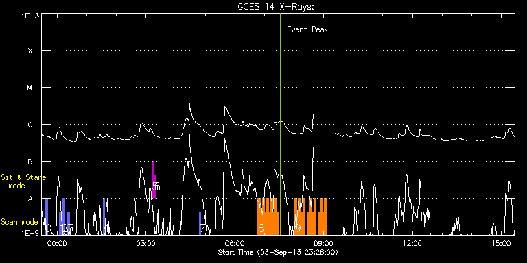 EIS Observation timeline overlay to GOES-Xray curve Code 1" 2" 40" 266" EIS Observations list for this event: STUDY ACRONYM ID DATE OBSERVED DESCRIPTION NOAA# TARGET 0 full_sun_slot_scan_2 | 36068 | 2013/09/03 23:35:45 | HOP130 full sun slot scan (13/15) | | Quiet Sun TIMELINE ID DATE OBSERVED FITS FILE XCEN (+W/-E) YCEN (+N/-S) DUR ----------------------------------------------------------------------------------------------------------------- 36068 | 2013/09/03 23:35:45.000 | eis_l0_20130903_233545.fits.gz | -15.21 | -1227.38 | 5m27s 1 full_sun_slot_scan_2 | 36069 | 2013/09/04 00:03:43 | HOP130 full sun slot scan (14/15) | | Quiet Sun TIMELINE ID DATE OBSERVED FITS FILE XCEN (+W/-E) YCEN (+N/-S) DUR ----------------------------------------------------------------------------------------------------------------- 36069 | 2013/09/04 00:03:43.000 | eis_l0_20130904_000343.fits.gz | -426.40 | -661.44 | 5m27s 2 full_sun_slot_scan_2 | 36070 | 2013/09/04 00:09:16 | HOP130 full sun slot scan (14/15) | | Quiet Sun TIMELINE ID DATE OBSERVED FITS FILE XCEN (+W/-E) YCEN (+N/-S) DUR ----------------------------------------------------------------------------------------------------------------- 36070 | 2013/09/04 00:09:16.000 | eis_l0_20130904_000916.fits.gz | -426.32 | -1133.52 | 5m26s 3 full_sun_slot_scan_2 | 36071 | 2013/09/04 00:19:43 | HOP130 full sun slot scan (15/15) | | Quiet Sun TIMELINE ID DATE OBSERVED FITS FILE XCEN (+W/-E) YCEN (+N/-S) DUR ----------------------------------------------------------------------------------------------------------------- 36071 | 2013/09/04 00:19:43.000 | eis_l0_20130904_001943.fits.gz | -830.33 | -757.25 | 5m27s 4 PRY_slot_context_v3 | 36090 | 2013/09/04 01:32:43 | Spectral Atlas Synoptic Program - QS | 1837 | Active Region TIMELINE ID DATE OBSERVED FITS FILE XCEN (+W/-E) YCEN (+N/-S) DUR ----------------------------------------------------------------------------------------------------------------- 36090 | 2013/09/04 01:32:43.000 | eis_l0_20130904_013243.fits.gz | 313.96 | -181.91 | 2m57s 5 regcal071 | 36093 | 2013/09/04 03:12:25 | Dark exposures, CCD bottom rows (100s | | Engineering TIMELINE ID DATE OBSERVED FITS FILE XCEN (+W/-E) YCEN (+N/-S) DUR ----------------------------------------------------------------------------------------------------------------- 36093 | 2013/09/04 03:12:25.000 | eis_l0_20130904_031225.fits.gz | 407.08 | -257.07 | 3m21s 6 regcal072 | 36094 | 2013/09/04 03:16:13 | Dark exposures, top CCD rows (100s exp | | Engineering TIMELINE ID DATE OBSERVED FITS FILE XCEN (+W/-E) YCEN (+N/-S) DUR ----------------------------------------------------------------------------------------------------------------- 36094 | 2013/09/04 03:16:13.000 | eis_l0_20130904_031613.fits.gz | 407.62 | 253.78 | 3m22s 7 PRY_slot_context_v3 | 36095 | 2013/09/04 04:47:20 | Spectral Atlas Synoptic Program - QS | 1837 | Active Region TIMELINE ID DATE OBSERVED FITS FILE XCEN (+W/-E) YCEN (+N/-S) DUR ----------------------------------------------------------------------------------------------------------------- 36095 | 2013/09/04 04:47:20.000 | eis_l0_20130904_044720.fits.gz | 340.84 | -180.29 | 2m56s 8 HH_Flare_162x152 | 36080 | 2013/09/04 06:46:57 | HOP236 - Collaboration with IRIS-SST o | 1836 | Flare TIMELINE ID DATE OBSERVED FITS FILE XCEN (+W/-E) YCEN (+N/-S) DUR ----------------------------------------------------------------------------------------------------------------- 36080 | 2013/09/04 06:46:57.000 | eis_l0_20130904_064657.fits.gz | 420.06 | 99.91 | 4m11s 36080 | 2013/09/04 06:51:11.000 | eis_l0_20130904_065111.fits.gz | 420.68 | 99.84 | 4m10s 36080 | 2013/09/04 06:55:24.000 | eis_l0_20130904_065524.fits.gz | 421.30 | 99.99 | 4m10s 36080 | 2013/09/04 06:59:37.000 | eis_l0_20130904_065937.fits.gz | 421.84 | 99.91 | 4m11s 36080 | 2013/09/04 07:03:51.000 | eis_l0_20130904_070351.fits.gz | 422.38 | 99.99 | 4m11s 36080 | 2013/09/04 07:08:04.000 | eis_l0_20130904_070804.fits.gz | 423.00 | 100.15 | 4m11s 36080 | 2013/09/04 07:12:18.000 | eis_l0_20130904_071218.fits.gz | 423.46 | 100.22 | 4m11s 36080 | 2013/09/04 07:16:32.000 | eis_l0_20130904_071632.fits.gz | 424.16 | 100.38 | 4m11s 36080 | 2013/09/04 07:20:45.000 | eis_l0_20130904_072045.fits.gz | 424.70 | 100.22 | 4m11s 36080 | 2013/09/04 07:24:59.000 | eis_l0_20130904_072459.fits.gz | 425.24 | 100.15 | 4m10s 9 HH_Flare_162x152 | 36085 | 2013/09/04 08:01:43 | HOP236 - Collaboration with IRIS-SST o | 1836 | Flare TIMELINE ID DATE OBSERVED FITS FILE XCEN (+W/-E) YCEN (+N/-S) DUR ----------------------------------------------------------------------------------------------------------------- 36085 | 2013/09/04 08:01:43.000 | eis_l0_20130904_080143.fits.gz | 430.18 | 100.53 | 4m11s 36085 | 2013/09/04 08:05:56.000 | eis_l0_20130904_080556.fits.gz | 430.72 | 100.61 | 4m11s 36085 | 2013/09/04 08:10:09.000 | eis_l0_20130904_081009.fits.gz | 431.27 | 100.76 | 4m11s 36085 | 2013/09/04 08:14:23.000 | eis_l0_20130904_081423.fits.gz | 431.88 | 100.69 | 4m11s 36085 | 2013/09/04 08:18:36.000 | eis_l0_20130904_081836.fits.gz | 432.50 | 100.69 | 4m11s 36085 | 2013/09/04 08:27:03.000 | eis_l0_20130904_082703.fits.gz | 433.66 | 100.84 | 4m11s 36085 | 2013/09/04 08:31:17.000 | eis_l0_20130904_083117.fits.gz | 434.20 | 100.84 | 4m10s 36085 | 2013/09/04 08:35:30.000 | eis_l0_20130904_083530.fits.gz | 434.74 | 100.84 | 4m11s 36085 | 2013/09/04 08:39:43.000 | eis_l0_20130904_083943.fits.gz | 435.20 | 100.92 | 4m11s 36085 | 2013/09/04 08:48:10.000 | eis_l0_20130904_084810.fits.gz | 436.36 | 101.07 | 4m11s 36085 | 2013/09/04 08:52:24.000 | eis_l0_20130904_085224.fits.gz | 436.98 | 101.00 | 4m10s 36085 | 2013/09/04 08:56:37.000 | eis_l0_20130904_085637.fits.gz | 437.52 | 101.15 | 4m11s 36085 | 2013/09/04 09:00:50.000 | eis_l0_20130904_090050.fits.gz | 438.06 | 101.07 | 4m11s : Check study information : Download file : View thumbnails For this event, also check for: