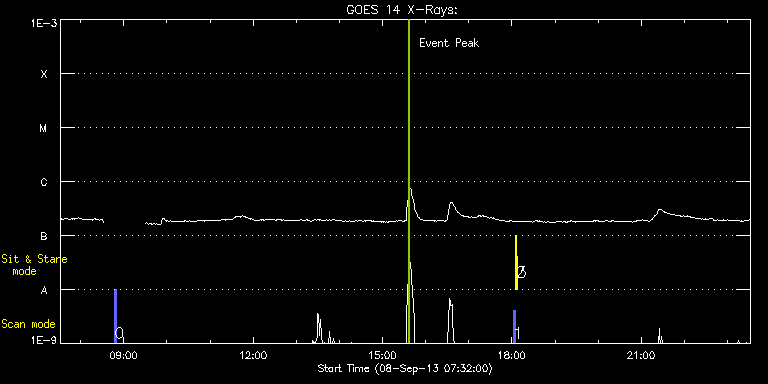 EIS Observation timeline overlay to GOES-Xray curve Code 1" 2" 40" 266" EIS Observations list for this event: STUDY ACRONYM ID DATE OBSERVED DESCRIPTION NOAA# TARGET 0 PRY_slot_context_v3 | 36137 | 2013/09/08 08:47:19 | HOP 81 - polar monitoring campaign | | Active Region TIMELINE ID DATE OBSERVED FITS FILE XCEN (+W/-E) YCEN (+N/-S) DUR ----------------------------------------------------------------------------------------------------------------- 36137 | 2013/09/08 08:47:19.000 | eis_l0_20130908_084719.fits.gz | -29.12 | 847.50 | 2m57s 1 PRY_slot_contextLITE | 36148 | 2013/09/08 18:02:13 | Change of EIS pointing and alignment w | | Active Region TIMELINE ID DATE OBSERVED FITS FILE XCEN (+W/-E) YCEN (+N/-S) DUR ----------------------------------------------------------------------------------------------------------------- 36148 | 2013/09/08 18:02:13.000 | eis_l0_20130908_180213.fits.gz | -15.21 | -0.65 | 2m56s 2 Alignment_266 | 36149 | 2013/09/08 18:05:27 | Change of EIS pointing and alignment w | | Quiet Sun TIMELINE ID DATE OBSERVED FITS FILE XCEN (+W/-E) YCEN (+N/-S) DUR ----------------------------------------------------------------------------------------------------------------- 36149 | 2013/09/08 18:05:27.000 | eis_l0_20130908_180527.fits.gz | -132.41 | -0.58 | 1m22s 3 XRT_synop_AIA | 36150 | 2013/09/08 18:07:34 | Change of EIS pointing and alignment w | | Quiet Sun TIMELINE ID DATE OBSERVED FITS FILE XCEN (+W/-E) YCEN (+N/-S) DUR ----------------------------------------------------------------------------------------------------------------- 36150 | 2013/09/08 18:07:34.000 | eis_l0_20130908_180734.fits.gz | -132.49 | -0.27 | 10s : Check study information : Download file : View thumbnails For this event, also check for: