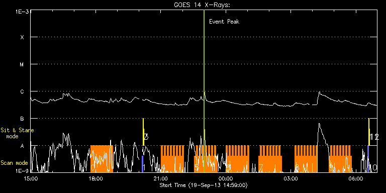 EIS Observation timeline overlay to GOES-Xray curve Code 1" 2" 40" 266" EIS Observations list for this event: STUDY ACRONYM ID DATE OBSERVED DESCRIPTION NOAA# TARGET 0 Atlas_60 | 36382 | 2013/09/19 17:45:27 | HOP219 emerging region NOAA 11843 | | Quiet Sun TIMELINE ID DATE OBSERVED FITS FILE XCEN (+W/-E) YCEN (+N/-S) DUR ----------------------------------------------------------------------------------------------------------------- 36382 | 2013/09/19 17:45:27.000 | eis_l0_20130919_174527.fits.gz | 316.34 | -84.03 | 1h1m40s 1 PRY_slot_contextLITE | 36324 | 2013/09/19 20:07:20 | EIS pointing and alignment | 1843 | Active Region TIMELINE ID DATE OBSERVED FITS FILE XCEN (+W/-E) YCEN (+N/-S) DUR ----------------------------------------------------------------------------------------------------------------- 36324 | 2013/09/19 20:07:20.000 | eis_l0_20130919_200720.fits.gz | -15.29 | -0.27 | 2m56s 2 Alignment_266 | 36325 | 2013/09/19 20:10:34 | EIS pointing and alignment | | Quiet Sun TIMELINE ID DATE OBSERVED FITS FILE XCEN (+W/-E) YCEN (+N/-S) DUR ----------------------------------------------------------------------------------------------------------------- 36325 | 2013/09/19 20:10:34.000 | eis_l0_20130919_201034.fits.gz | -132.57 | -0.42 | 1m23s 3 XRT_synop_AIA | 36326 | 2013/09/19 20:13:09 | EIS pointing and alignment | | Quiet Sun TIMELINE ID DATE OBSERVED FITS FILE XCEN (+W/-E) YCEN (+N/-S) DUR ----------------------------------------------------------------------------------------------------------------- 36326 | 2013/09/19 20:13:09.000 | eis_l0_20130919_201309.fits.gz | -132.57 | -0.42 | 10s 4 HH_Flare_162x152 | 36385 | 2013/09/19 21:00:20 | AR near the SE limb (NOAA 11846) | 1845 | Flare TIMELINE ID DATE OBSERVED FITS FILE XCEN (+W/-E) YCEN (+N/-S) DUR ----------------------------------------------------------------------------------------------------------------- 36385 | 2013/09/19 21:00:20.000 | eis_l0_20130919_210020.fits.gz | -736.02 | -334.39 | 4m10s 36385 | 2013/09/19 21:04:33.000 | eis_l0_20130919_210433.fits.gz | -735.71 | -334.39 | 4m11s 36385 | 2013/09/19 21:08:46.000 | eis_l0_20130919_210846.fits.gz | -735.40 | -334.62 | 4m11s 36385 | 2013/09/19 21:13:00.000 | eis_l0_20130919_211300.fits.gz | -735.09 | -334.54 | 4m10s 36385 | 2013/09/19 21:17:13.000 | eis_l0_20130919_211713.fits.gz | -734.78 | -334.77 | 4m11s 36385 | 2013/09/19 21:21:27.000 | eis_l0_20130919_212127.fits.gz | -734.47 | -334.70 | 4m10s 36385 | 2013/09/19 21:25:40.000 | eis_l0_20130919_212540.fits.gz | -734.16 | -334.77 | 4m11s 36385 | 2013/09/19 21:29:54.000 | eis_l0_20130919_212954.fits.gz | -733.93 | -334.93 | 4m10s 36385 | 2013/09/19 21:34:07.000 | eis_l0_20130919_213407.fits.gz | -733.54 | -334.85 | 4m10s 36385 | 2013/09/19 21:38:20.000 | eis_l0_20130919_213820.fits.gz | -733.23 | -335.00 | 4m11s 36385 | 2013/09/19 21:42:34.000 | eis_l0_20130919_214234.fits.gz | -732.85 | -335.16 | 4m10s 36385 | 2013/09/19 21:46:47.000 | eis_l0_20130919_214647.fits.gz | -732.54 | -335.31 | 4m11s 36385 | 2013/09/19 21:51:01.000 | eis_l0_20130919_215101.fits.gz | -732.31 | -335.16 | 4m10s 36385 | 2013/09/19 21:55:14.000 | eis_l0_20130919_215514.fits.gz | -731.92 | -335.23 | 4m10s 36385 | 2013/09/19 21:59:27.000 | eis_l0_20130919_215927.fits.gz | -731.69 | -335.39 | 4m11s 5 HH_Flare_162x152 | 36386 | 2013/09/19 22:33:13 | AR near the SE limb (NOAA 11846) | 1845 | Flare TIMELINE ID DATE OBSERVED FITS FILE XCEN (+W/-E) YCEN (+N/-S) DUR ----------------------------------------------------------------------------------------------------------------- 36386 | 2013/09/19 22:33:13.000 | eis_l0_20130919_223313.fits.gz | -739.12 | -356.01 | 4m11s 36386 | 2013/09/19 22:37:27.000 | eis_l0_20130919_223727.fits.gz | -738.82 | -355.85 | 4m11s 36386 | 2013/09/19 22:41:40.000 | eis_l0_20130919_224140.fits.gz | -738.51 | -356.01 | 4m11s 36386 | 2013/09/19 22:45:54.000 | eis_l0_20130919_224554.fits.gz | -738.20 | -356.16 | 4m10s 36386 | 2013/09/19 22:50:07.000 | eis_l0_20130919_225007.fits.gz | -737.89 | -356.08 | 4m11s 36386 | 2013/09/19 22:54:21.000 | eis_l0_20130919_225421.fits.gz | -737.66 | -356.24 | 4m10s 36386 | 2013/09/19 22:58:34.000 | eis_l0_20130919_225834.fits.gz | -737.27 | -356.32 | 4m10s 36386 | 2013/09/19 23:02:47.000 | eis_l0_20130919_230247.fits.gz | -736.96 | -356.32 | 4m11s 36386 | 2013/09/19 23:07:01.000 | eis_l0_20130919_230701.fits.gz | -736.65 | -356.24 | 4m10s 36386 | 2013/09/19 23:11:14.000 | eis_l0_20130919_231114.fits.gz | -736.34 | -356.47 | 4m11s 36386 | 2013/09/19 23:15:28.000 | eis_l0_20130919_231528.fits.gz | -735.96 | -356.47 | 4m10s 36386 | 2013/09/19 23:19:41.000 | eis_l0_20130919_231941.fits.gz | -735.73 | -356.55 | 4m11s 36386 | 2013/09/19 23:23:54.000 | eis_l0_20130919_232354.fits.gz | -735.42 | -356.47 | 4m11s 36386 | 2013/09/19 23:28:08.000 | eis_l0_20130919_232808.fits.gz | -735.03 | -356.78 | 4m11s 36386 | 2013/09/19 23:32:21.000 | eis_l0_20130919_233221.fits.gz | -734.72 | -356.63 | 4m11s 6 HH_Flare_162x152 | 36387 | 2013/09/20 00:00:13 | AR near the SE limb (NOAA 11846) | 1846 | Flare TIMELINE ID DATE OBSERVED FITS FILE XCEN (+W/-E) YCEN (+N/-S) DUR ----------------------------------------------------------------------------------------------------------------- 36387 | 2013/09/20 00:00:13.000 | eis_l0_20130920_000013.fits.gz | -732.56 | -337.24 | 4m11s 36387 | 2013/09/20 00:04:27.000 | eis_l0_20130920_000427.fits.gz | -732.25 | -337.17 | 4m10s 36387 | 2013/09/20 00:08:40.000 | eis_l0_20130920_000840.fits.gz | -732.02 | -337.24 | 4m11s 36387 | 2013/09/20 00:12:53.000 | eis_l0_20130920_001253.fits.gz | -731.71 | -337.32 | 4m11s 36387 | 2013/09/20 00:17:07.000 | eis_l0_20130920_001707.fits.gz | -731.24 | -337.40 | 4m10s 36387 | 2013/09/20 00:21:20.000 | eis_l0_20130920_002120.fits.gz | -731.01 | -337.48 | 4m11s 36387 | 2013/09/20 00:25:34.000 | eis_l0_20130920_002534.fits.gz | -730.78 | -337.55 | 4m11s 36387 | 2013/09/20 00:29:47.000 | eis_l0_20130920_002947.fits.gz | -730.40 | -337.71 | 4m11s 36387 