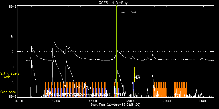 EIS Observation timeline overlay to GOES-Xray curve Code 1" 2" 40" 266" EIS Observations list for this event: STUDY ACRONYM ID DATE OBSERVED DESCRIPTION NOAA# TARGET 0 SK_DEEP_10x512_SLIT2 | 36338 | 2013/09/20 11:05:19 | HOP79 E-W scan (1/21) | | Quiet Sun TIMELINE ID DATE OBSERVED FITS FILE XCEN (+W/-E) YCEN (+N/-S) DUR ----------------------------------------------------------------------------------------------------------------- 36338 | 2013/09/20 11:05:19.000 | eis_l0_20130920_110519.fits.gz | -9869.95 | -9963.20 | 5m8s 1 PRY_slot_contextLITE | 36339 | 2013/09/20 11:10:38 | HOP79 E-W scan (1/21) | | Active Region TIMELINE ID DATE OBSERVED FITS FILE XCEN (+W/-E) YCEN (+N/-S) DUR ----------------------------------------------------------------------------------------------------------------- 36339 | 2013/09/20 11:10:38.000 | eis_l0_20130920_111038.fits.gz | -9884.69 | -9963.20 | 2m57s 2 SK_DEEP_10x512_SLIT2 | 36342 | 2013/09/20 11:20:32 | HOP79 E-W scan (2/21) | | Quiet Sun TIMELINE ID DATE OBSERVED FITS FILE XCEN (+W/-E) YCEN (+N/-S) DUR ----------------------------------------------------------------------------------------------------------------- 36342 | 2013/09/20 11:20:32.000 | eis_l0_20130920_112032.fits.gz | -734.56 | -342.55 | 5m8s 3 PRY_slot_contextLITE | 36343 | 2013/09/20 11:25:51 | HOP79 E-W scan (2/21) | 1846 | Active Region TIMELINE ID DATE OBSERVED FITS FILE XCEN (+W/-E) YCEN (+N/-S) DUR ----------------------------------------------------------------------------------------------------------------- 36343 | 2013/09/20 11:25:51.000 | eis_l0_20130920_112551.fits.gz | -749.30 | -342.32 | 2m56s 4 SK_DEEP_10x512_SLIT2 | 36344 | 2013/09/20 11:35:32 | HOP79 E-W scan (3/21) | | Quiet Sun TIMELINE ID DATE OBSERVED FITS FILE XCEN (+W/-E) YCEN (+N/-S) DUR ----------------------------------------------------------------------------------------------------------------- 36344 | 2013/09/20 11:35:32.000 | eis_l0_20130920_113532.fits.gz | -548.31 | -364.49 | 5m8s 5 PRY_slot_contextLITE | 36345 | 2013/09/20 11:40:51 | HOP79 E-W scan (3/21) | 1845 | Active Region TIMELINE ID DATE OBSERVED FITS FILE XCEN (+W/-E) YCEN (+N/-S) DUR ----------------------------------------------------------------------------------------------------------------- 36345 | 2013/09/20 11:40:51.000 | eis_l0_20130920_114051.fits.gz | -563.21 | -364.49 | 2m56s 6 SK_DEEP_10x512_SLIT2 | 36346 | 2013/09/20 11:50:32 | HOP79 E-W scan (4/21) | | Quiet Sun TIMELINE ID DATE OBSERVED FITS FILE XCEN (+W/-E) YCEN (+N/-S) DUR ----------------------------------------------------------------------------------------------------------------- 36346 | 2013/09/20 11:50:32.000 | eis_l0_20130920_115032.fits.gz | -360.45 | -377.39 | 5m8s 7 PRY_slot_contextLITE | 36347 | 2013/09/20 11:55:51 | HOP79 E-W scan (4/21) | 1845 | Active Region TIMELINE ID DATE OBSERVED FITS FILE XCEN (+W/-E) YCEN (+N/-S) DUR ----------------------------------------------------------------------------------------------------------------- 36347 | 2013/09/20 11:55:51.000 | eis_l0_20130920_115551.fits.gz | -375.26 | -377.31 | 2m57s 8 SK_DEEP_10x512_SLIT2 | 36348 | 2013/09/20 12:05:32 | HOP79 E-W scan (5/21) | | Quiet Sun TIMELINE ID DATE OBSERVED FITS FILE XCEN (+W/-E) YCEN (+N/-S) DUR ----------------------------------------------------------------------------------------------------------------- 36348 | 2013/09/20 12:05:32.000 | eis_l0_20130920_120532.fits.gz | -169.34 | -384.65 | 5m8s 9 PRY_slot_contextLITE | 36349 | 2013/09/20 12:10:51 | HOP79 E-W scan (5/21) | | Active Region TIMELINE ID DATE OBSERVED FITS FILE XCEN (+W/-E) YCEN (+N/-S) DUR ----------------------------------------------------------------------------------------------------------------- 36349 | 2013/09/20 12:10:51.000 | eis_l0_20130920_121051.fits.gz | -184.08 | -384.58 | 2m57s 10 SK_DEEP_10x512_SLIT2 | 36350 | 2013/09/20 12:20:32 | HOP79 E-W scan (6/21) | | Quiet Sun TIMELINE ID DATE OBSERVED FITS FILE XCEN (+W/-E) YCEN (+N/-S) DUR ----------------------------------------------------------------------------------------------------------------- 36350 | 2013/09/20 12:20:32.000 | eis_l0_20130920_122032.fits.gz | 25.48 | -385.19 | 5m8s 11 PRY_slot_contextLITE | 36351 | 2013/09/20 12:25:51 | HOP79 E-W scan (6/21) | | Active Region TIMELINE ID DATE OBSERVED FITS FILE XCEN (+W/-E) YCEN (+N/-S) DUR ----------------------------------------------------------------------------------------------------------------- 36351 | 2013/09/20 12:25:51.000 | eis_l0_20130920_122551.fits.gz | 10.59 | -385.27 | 2m56s 12 SK_DEEP_10x512_SLIT2 | 36352 | 2013/09/20 12:35:32 | HOP79 E-W scan (7/21) | | Quiet Sun TIMELINE ID DATE OBSERVED FITS FILE XCEN (+W/-E) YCEN (+N/-S) DUR ----------------------------------------------------------------------------------------------------------------- 36352 | 2013/09/20 12:35:32.000 | eis_l0_20130920_123532.fits.gz | 140.66 | -384.58 | 5m8s 13 PRY_slot_contextLITE | 36353 | 2013/09/20 12:40:51 | HOP79 E-W scan (7/21) | | Active Region TIMELINE ID DATE OBSERVED FITS FILE XCEN (+W/-E) YCEN (+N/-S) DUR ----------------------------------------------------------------------------------------------------------------- 36353 | 2013/09/20 12:40:51.000 | eis_l0_20130920_124051.fits.gz | 125.84 | -384.42 | 2m56s 14 SK_DEEP_10x512_SLIT2 | 36354 | 2013/09/20 12:50:32 | HOP79 E-W scan (8/21) | | Quiet Sun TIMELINE ID DATE OBSERVED FITS FILE XCEN (+W/-E) YCEN (+N/-S) DUR ----------------------------------------------------------------------------------------------------------------- 36354 | 2013/09/20 12:50:32.000 | eis_l0_20130920_125032.fits.gz | 331.46 | -377.31 | 5m8s 15 PRY_slot_contextLITE | 36355 | 2013/09/20 12:55:51 | HOP79 E-W scan (8/21) | | Active Region TIMELINE ID DATE OBSERVED FITS FILE XCEN (+W/-E) YCEN (+N/-S) DUR ----------------------------------------------------------------------------------------------------------------- 36355 | 2013/09/20 12:55:51.000 | eis_l0_20130920_125551.fits