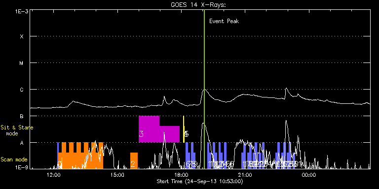EIS Observation timeline overlay to GOES-Xray curve Code 1" 2" 40" 266" EIS Observations list for this event: STUDY ACRONYM ID DATE OBSERVED DESCRIPTION NOAA# TARGET 0 PRY_slot_contextLITE | 36460 | 2013/09/24 12:10:20 | Slot context for fast scan with IRIS. | | Active Region TIMELINE ID DATE OBSERVED FITS FILE XCEN (+W/-E) YCEN (+N/-S) DUR ----------------------------------------------------------------------------------------------------------------- 36460 | 2013/09/24 12:10:20.000 | eis_l0_20130924_121020.fits.gz | 715.86 | 550.74 | 2m56s 1 kappa_short | 36461 | 2013/09/24 12:13:41 | Rapid scans of prominence covering IRI | | Active Region TIMELINE ID DATE OBSERVED FITS FILE XCEN (+W/-E) YCEN (+N/-S) DUR ----------------------------------------------------------------------------------------------------------------- 36461 | 2013/09/24 12:13:41.000 | eis_l0_20130924_121341.fits.gz | 743.90 | 567.59 | 10m18s 36461 | 2013/09/24 12:24:05.000 | eis_l0_20130924_122405.fits.gz | 743.83 | 567.51 | 10m18s 36461 | 2013/09/24 12:34:29.000 | eis_l0_20130924_123429.fits.gz | 743.90 | 567.66 | 10m17s 36461 | 2013/09/24 12:44:53.000 | eis_l0_20130924_124453.fits.gz | 743.83 | 567.51 | 10m17s 36461 | 2013/09/24 12:55:17.000 | eis_l0_20130924_125517.fits.gz | 743.83 | 567.82 | 10m17s 36461 | 2013/09/24 13:05:40.000 | eis_l0_20130924_130540.fits.gz | 743.83 | 567.74 | 10m18s 36461 | 2013/09/24 13:16:04.000 | eis_l0_20130924_131604.fits.gz | 743.83 | 567.66 | 10m18s 36461 | 2013/09/24 13:26:28.000 | eis_l0_20130924_132628.fits.gz | 743.83 | 567.59 | 10m17s 36461 | 2013/09/24 13:36:52.000 | eis_l0_20130924_133652.fits.gz | 743.83 | 567.51 | 10m17s 36461 | 2013/09/24 13:47:16.000 | eis_l0_20130924_134716.fits.gz | 743.75 | 567.66 | 10m17s 36461 | 2013/09/24 13:57:40.000 | eis_l0_20130924_135740.fits.gz | 743.83 | 567.66 | 10m17s 36461 | 2013/09/24 14:08:04.000 | eis_l0_20130924_140804.fits.gz | 743.83 | 567.66 | 10m17s 2 cam_artb_cds_a_lite | 36462 | 2013/09/24 15:37:10 | Large FOV scan in 20 mins to match IRI | | Active Region TIMELINE ID DATE OBSERVED FITS FILE XCEN (+W/-E) YCEN (+N/-S) DUR ----------------------------------------------------------------------------------------------------------------- 36462 | 2013/09/24 15:37:10.000 | eis_l0_20130924_153710.fits.gz | -236.29 | 43.30 | 19m26s 3 HPW021_VEL_001x512v1 | 36463 | 2013/09/24 16:00:27 | Sit-and-stare on moss/plage region whe | | Active Region TIMELINE ID DATE OBSERVED FITS FILE XCEN (+W/-E) YCEN (+N/-S) DUR ----------------------------------------------------------------------------------------------------------------- 36463 | 2013/09/24 16:00:27.000 | eis_l0_20130924_160027.fits.gz | -262.78 | 54.07 | 56m43s 36463 | 2013/09/24 16:57:17.000 | eis_l0_20130924_165717.fits.gz | -254.44 | 53.84 | 56m43s 4 Alignment_266 | 36422 | 2013/09/24 18:05:48 | Daily pointing monitoring | | Quiet Sun TIMELINE ID DATE OBSERVED FITS FILE XCEN (+W/-E) YCEN (+N/-S) DUR ----------------------------------------------------------------------------------------------------------------- 36422 | 2013/09/24 18:05:48.000 | eis_l0_20130924_180548.fits.gz | -132.49 | -0.50 | 1m22s 5 XRT_synop_AIA | 36423 | 2013/09/24 18:07:56 | Daily pointing monitoring | | Quiet Sun TIMELINE ID DATE OBSERVED FITS FILE XCEN (+W/-E) YCEN (+N/-S) DUR ----------------------------------------------------------------------------------------------------------------- 36423 | 2013/09/24 18:07:56.000 | eis_l0_20130924_180756.fits.gz | -132.57 | -0.35 | 10s 6 full_sun_slot_scan_2 | 36431 | 2013/09/24 18:12:27 | Full sun scan | | Quiet Sun TIMELINE ID DATE OBSERVED FITS FILE XCEN (+W/-E) YCEN (+N/-S) DUR ----------------------------------------------------------------------------------------------------------------- 36431 | 2013/09/24 18:12:27.000 | eis_l0_20130924_181227.fits.gz | 920.80 | 185.58 | 5m27s 7 full_sun_slot_scan_2 | 36432 | 2013/09/24 18:18:26 | Full sun scan | | Quiet Sun TIMELINE ID DATE OBSERVED FITS FILE XCEN (+W/-E) YCEN (+N/-S) DUR ----------------------------------------------------------------------------------------------------------------- 36432 | 2013/09/24 18:18:26.000 | eis_l0_20130924_181826.fits.gz | 920.80 | -286.50 | 5m27s 8 full_sun_slot_scan_2 | 36433 | 2013/09/24 18:28:13 | Full sun scan | 1849 | Quiet Sun TIMELINE ID DATE OBSERVED FITS FILE XCEN (+W/-E) YCEN (+N/-S) DUR ----------------------------------------------------------------------------------------------------------------- 36433 | 2013/09/24 18:28:13.000 | eis_l0_20130924_182813.fits.gz | 452.60 | 185.73 | 5m27s 9 full_sun_slot_scan_2 | 36434 | 2013/09/24 18:33:45 | Full sun scan | 1852 | Quiet Sun TIMELINE ID DATE OBSERVED FITS FILE XCEN (+W/-E) YCEN (+N/-S) DUR ----------------------------------------------------------------------------------------------------------------- 36434 | 2013/09/24 18:33:45.000 | eis_l0_20130924_183345.fits.gz | 452.68 | -286.58 | 5m27s 10 full_sun_slot_scan_2 | 36435 | 2013/09/24 19:13:13 | Full sun scan | | Quiet Sun TIMELINE ID DATE OBSERVED FITS FILE XCEN (+W/-E) YCEN (+N/-S) DUR ----------------------------------------------------------------------------------------------------------------- 36435 | 2013/09/24 19:13:13.000 | eis_l0_20130924_191313.fits.gz | -15.29 | 185.50 | 5m27s 11 full_sun_slot_scan_2 | 36436 | 2013/09/24 19:18:46 | Full sun scan | 1846 | Quiet Sun TIMELINE ID DATE OBSERVED FITS FILE XCEN (+W/-E) YCEN (+N/-S) DUR ----------------------------------------------------------------------------------------------------------------- 36436 | 2013/09/24 19:18:46.000 | eis_l0_20130924_191846.fits.gz | -15.29 | -286.42 | 5m26s 12 full_sun_slot_scan_2 | 36437 | 2013/09/24 19:29:13 | Full sun scan | 1850 | Quiet Sun TIMELINE ID DATE OBSERVED FITS FILE XCEN (+W/-E) YCEN (+N/-S) DUR ----------------------------------------------------------------------------------------------------------------- 36437 | 2013/09/24 19:29:13.000 | eis_l0_20130924_192913.fits.gz | -483.33 | 